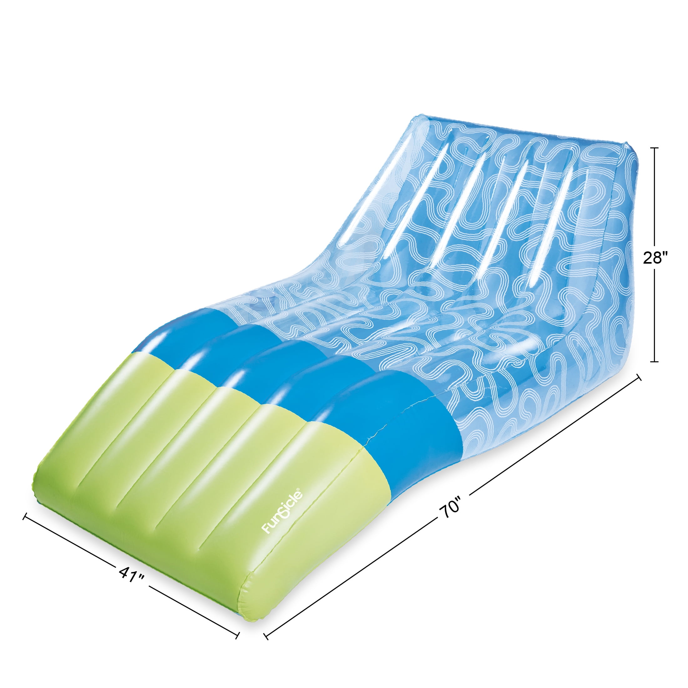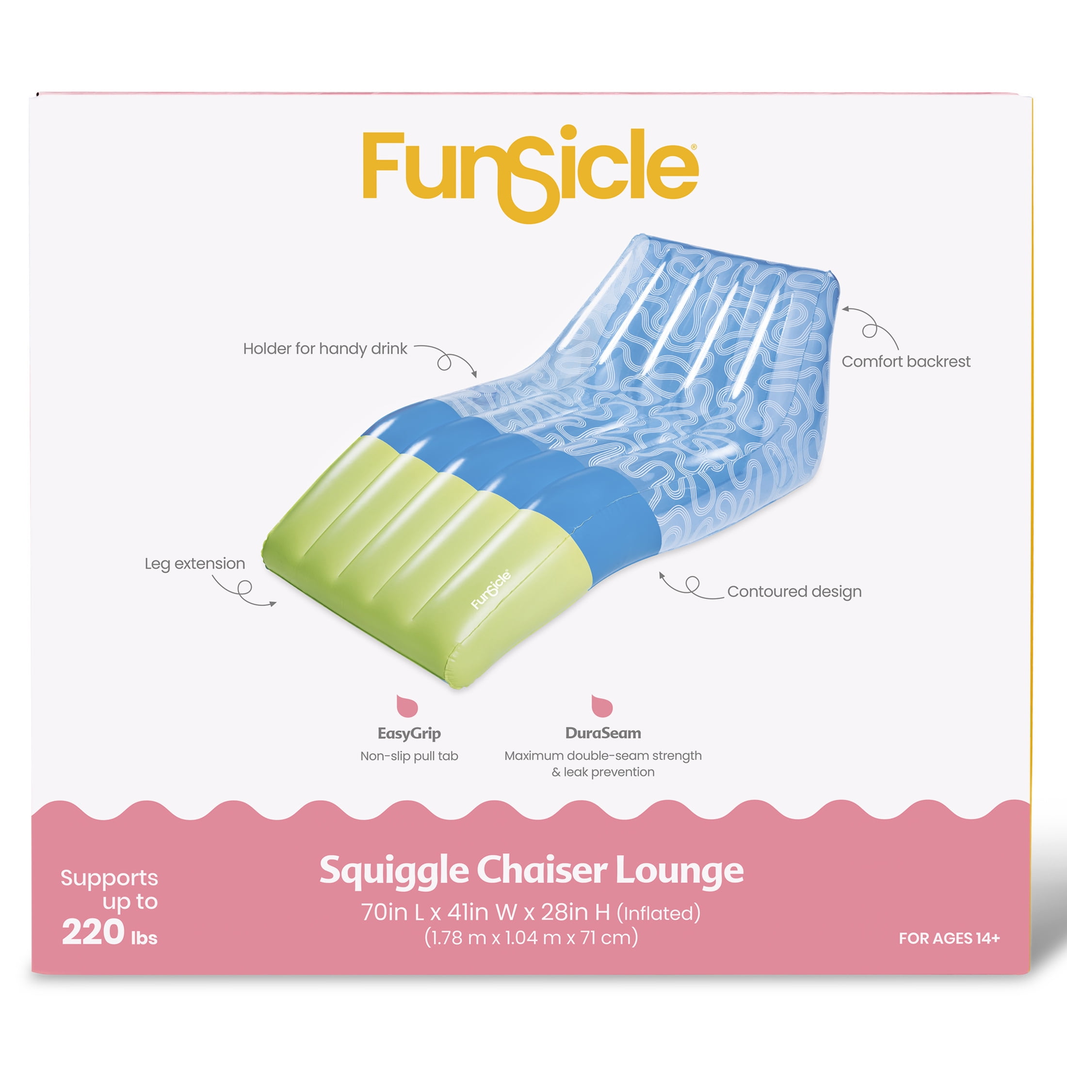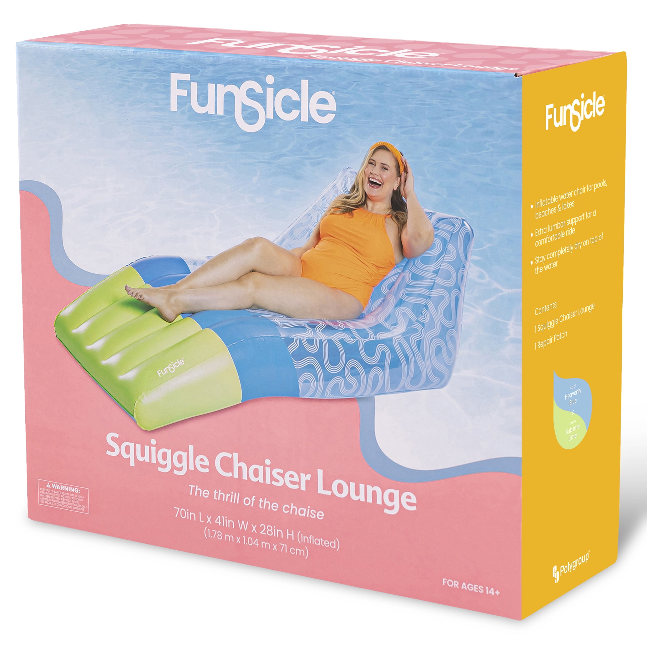 Funsicle Blue Squiggle Chaiser Lounge, Inflatable Pool Float, Adults, Unisex Inflatable water chair for pools, beaches & lakes Stay completely dry on top of the water Age: Adults DuraSeam: Dual-weld lines for added strength & leak prevention Extra lumbar support for a comfortable ride Approximate inflated size: 70″ x 41″ x 28″ (1.78 m x 1.04 m x 71 cm) EasyGrip Valve: Non-slip pull tab for easy lift opening Creative & trendy pattern design