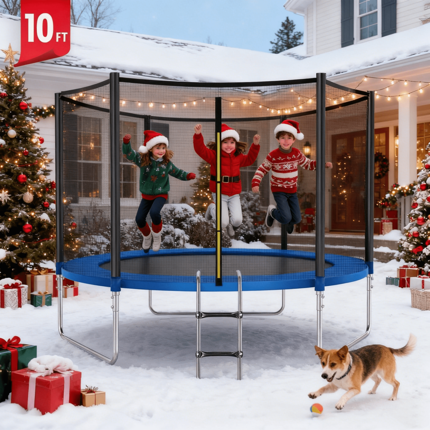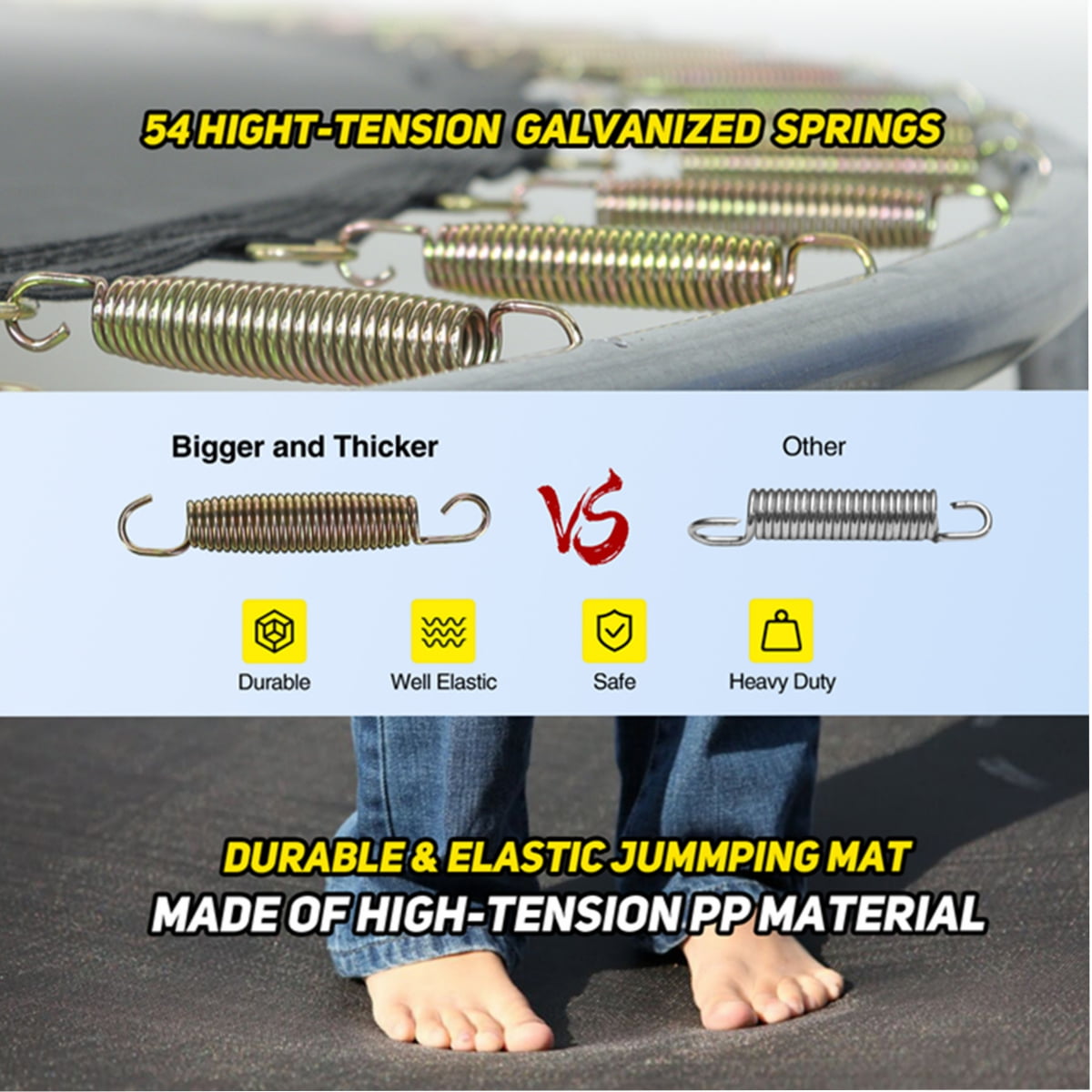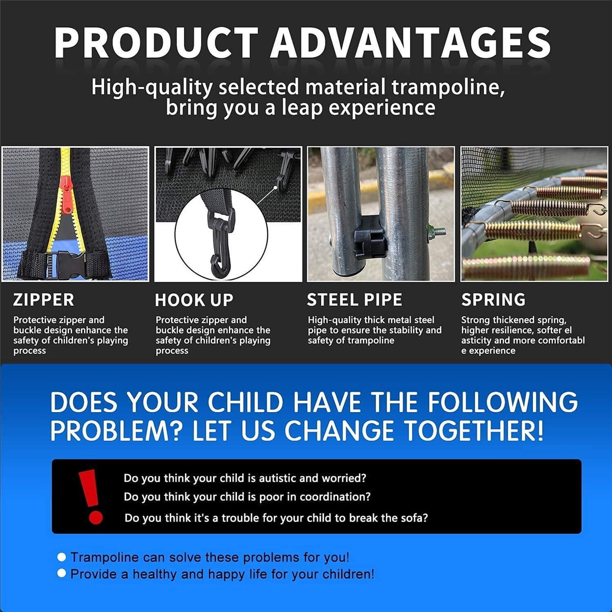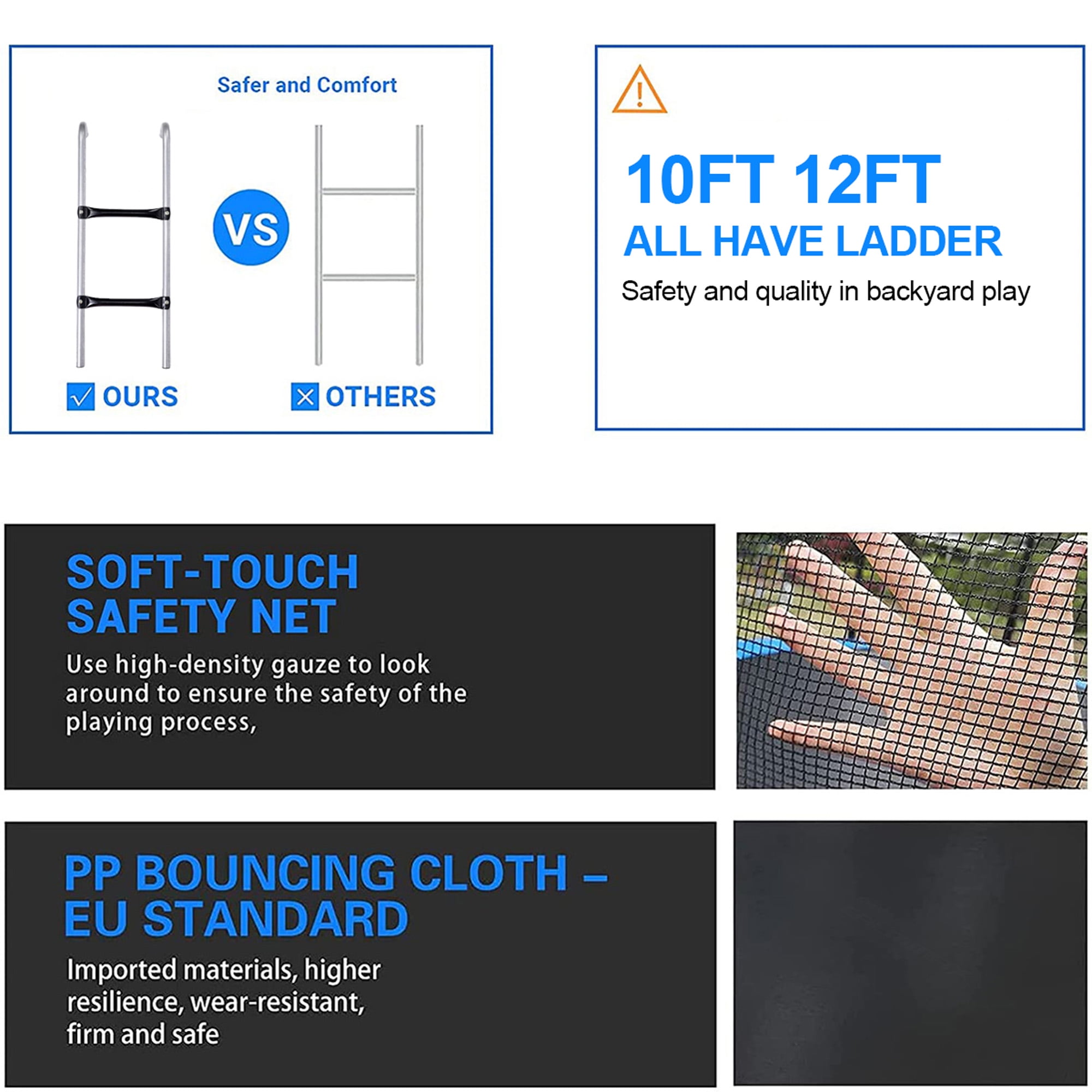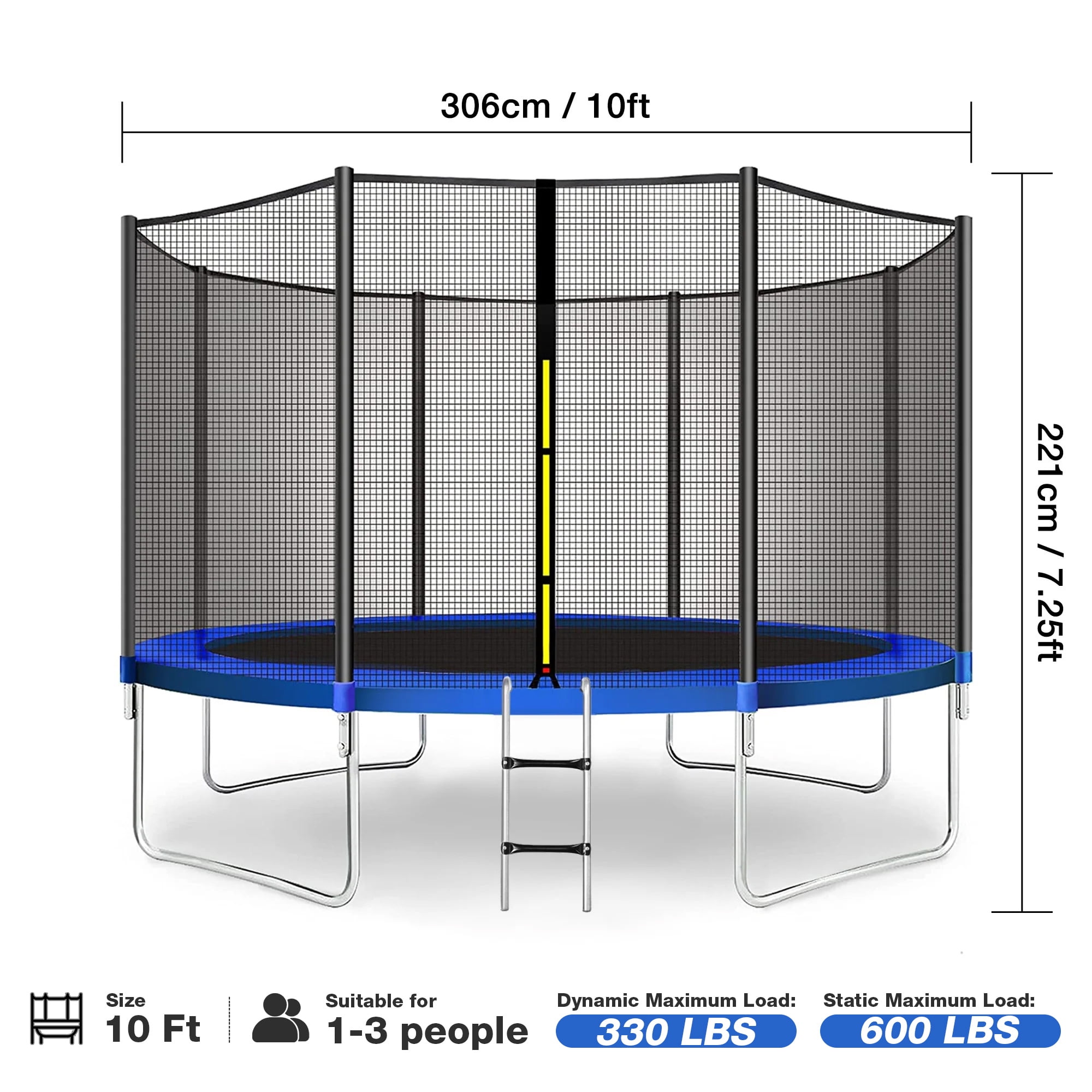 KEY FEATUERE: All our trampoline are tested for safety and durability, and trampoline is qualifying standard qualified to ensure premium and reliable safety so that parents can relieve their concerns. 【360-degree Safety Enclosure Net】Thicken polyethylene enclosure net around the kids trampoline for safety, fade resistant and resistant to tearing. To better ensure protective of kids and you from pinch points and openings, it is also connected to the steel tube with PP soft foam, eliminating gaps between the mat and the net, so that children can play more safely and happily in the trampoline. The trampolines with enclosure can increase the parent-child time. It’s the optimal father’s Day present. 【Superior Bouncing Outdoor Trampoline】Our 10ft trampoline made with 54pcs enduring reinforced galvanized springs and EU standard polypropylene bouncing surface, the jumping mat (made of PP) provides more weight capacity. The foam pad is made of thick and enduring blue PE+PVC. With over 5,000 hours of testing and over 25,000 jumps, the mat can hold up to 600 lbs. 【Quick Assembly】Recreational trampoline can be easily assembled with simple structure, clear manual is easy for you to understand, you can follow the steps to install. 【Upgraded Structure & Steady Frame】All trampoline metal parts use the latest hot-dip galvanizing technology inside and out with a wear-resistant zinc layer to make the frame more robust. 3Φ34×1.2mm galvanized “U” shape legs and 6 balanced touch points for better stability and safety. All our products are tested for safety and durability. 【For Your Family FUN】Trampoline for kids and adults provides a large jumping area. It is great for your family fun in a compact backyard kingdom. It trains a wide range of muscle groups, builds hip and leg muscles. You can make many jumping exercises on it. Such as straight jump, split jump, straddle jump, tuck jump, pike jump, back drop, and front drop. Assembled Product Dimensions (L x W x H): 10ft: 10.04 x 10.04 x 7.58ft / 306 x 306 x 231cm Features: 360° tear-resistant enclosure net and PP soft foam connection provide a safe sports environment. Trampoline metal parts use the latest hot-dip galvanizing technology, wear-resistant zinc layer make the frame more robust. Removable ladder makes it convenient for you to get onto. 4 U-shaped support legs and 8 balanced touch points for better stability and safety. Q&A: Question: How many springs? Answer: 10FT is attached with 54 springs. Question: What is the weight limit for the 10 ft trampoline? Answer: The capacity of 10ft trampoline is 330 pounds. Question: Is it easy to assemble? Answer: Yes, our recreational trampoline comes with clear instructions for easy assembly. Specification: Type: Kids Adults Trampolines Color: Blue Steel pipe material: Hot dip galvanized steel Fabric material: PE cloth Mesh material: PE material Frame Size:10 Feet Maximum Weight Recommendation:330 LBS Static Maximum Load: 600 LBS