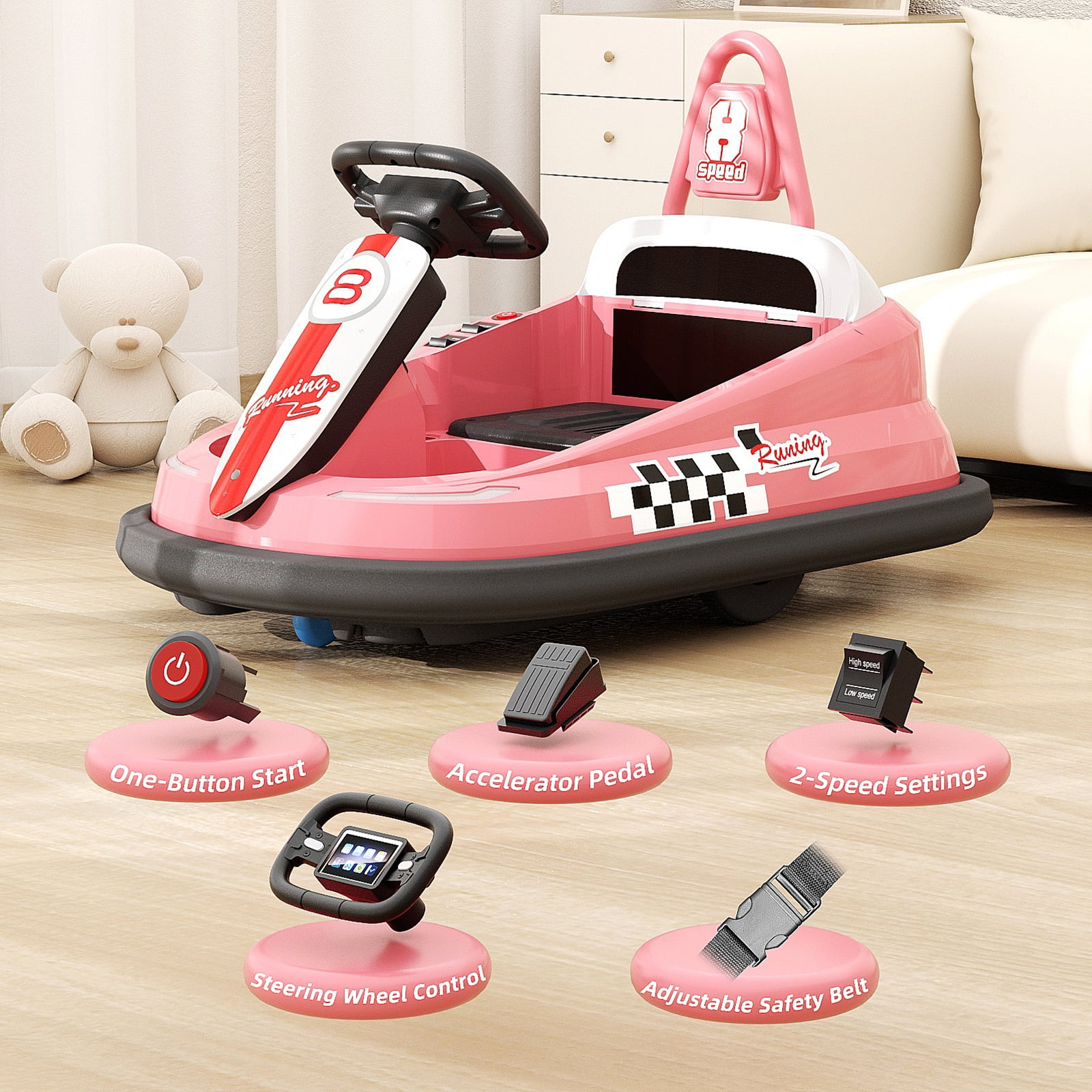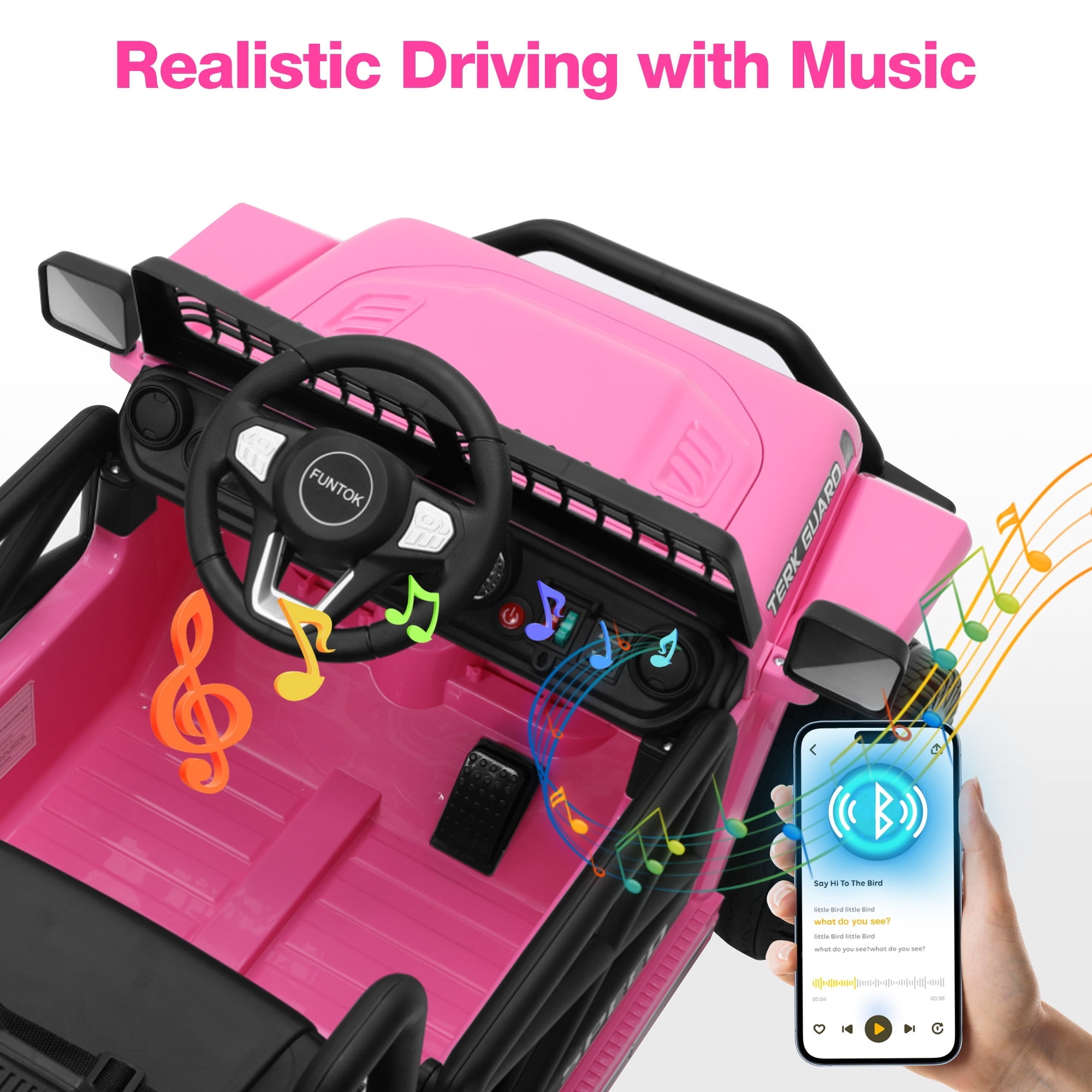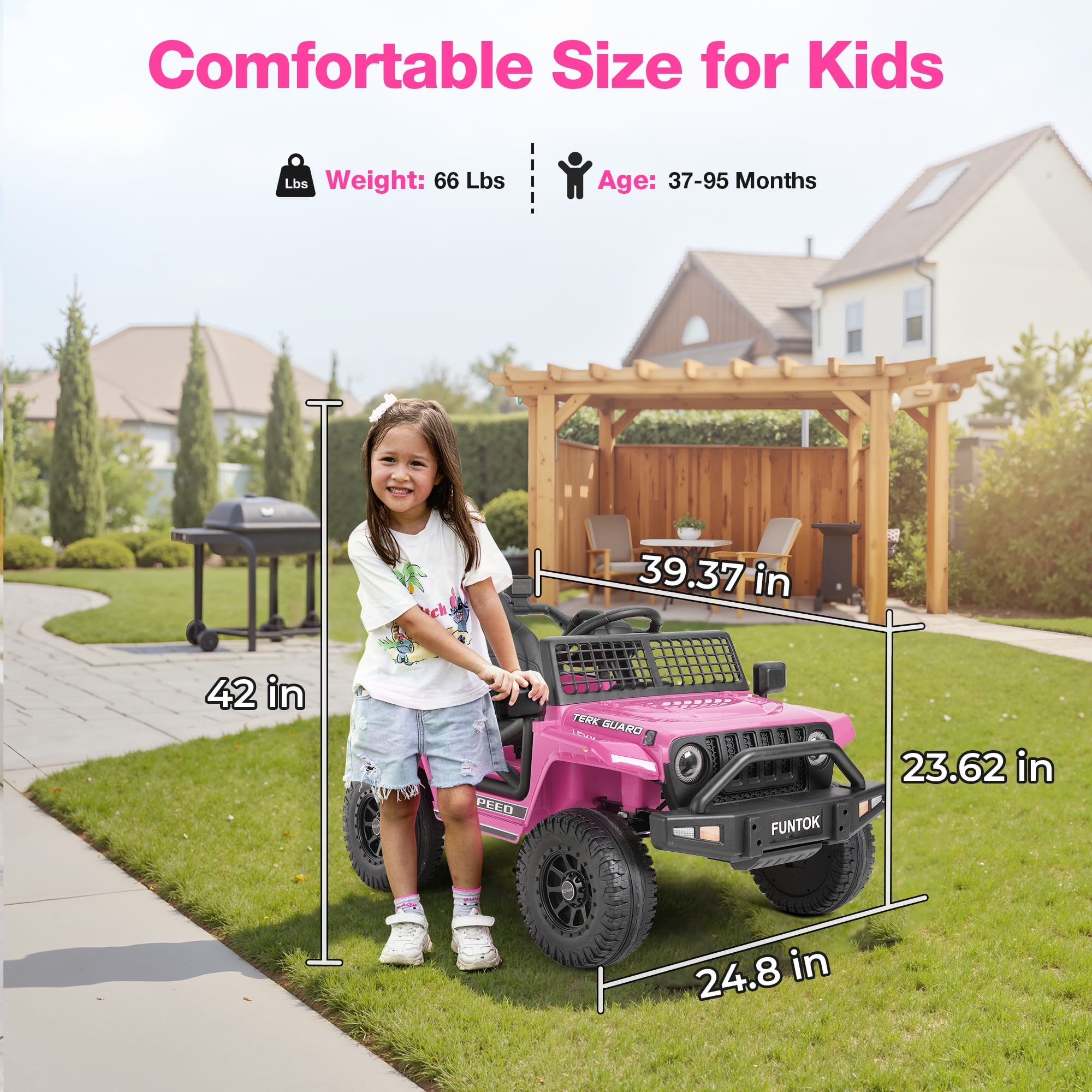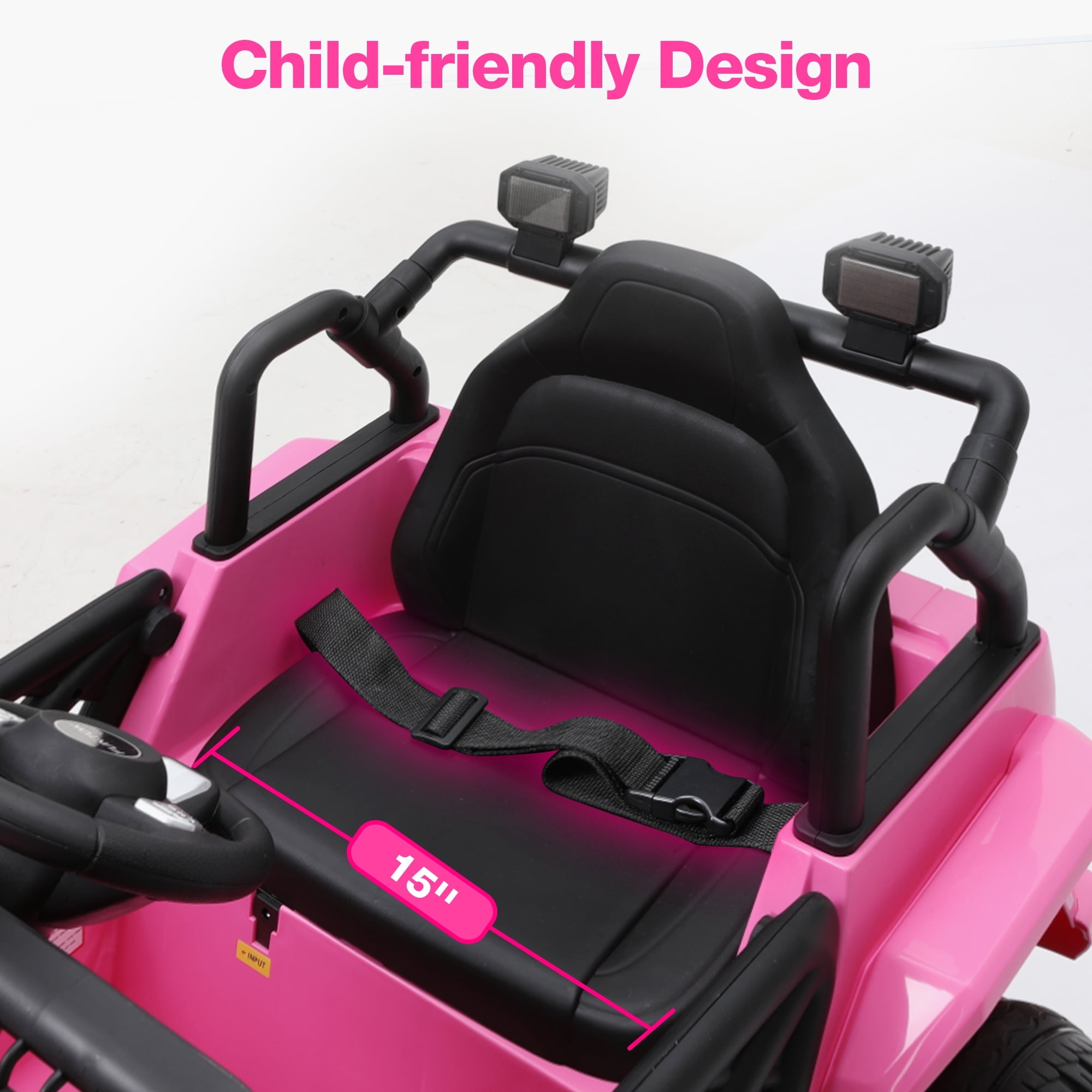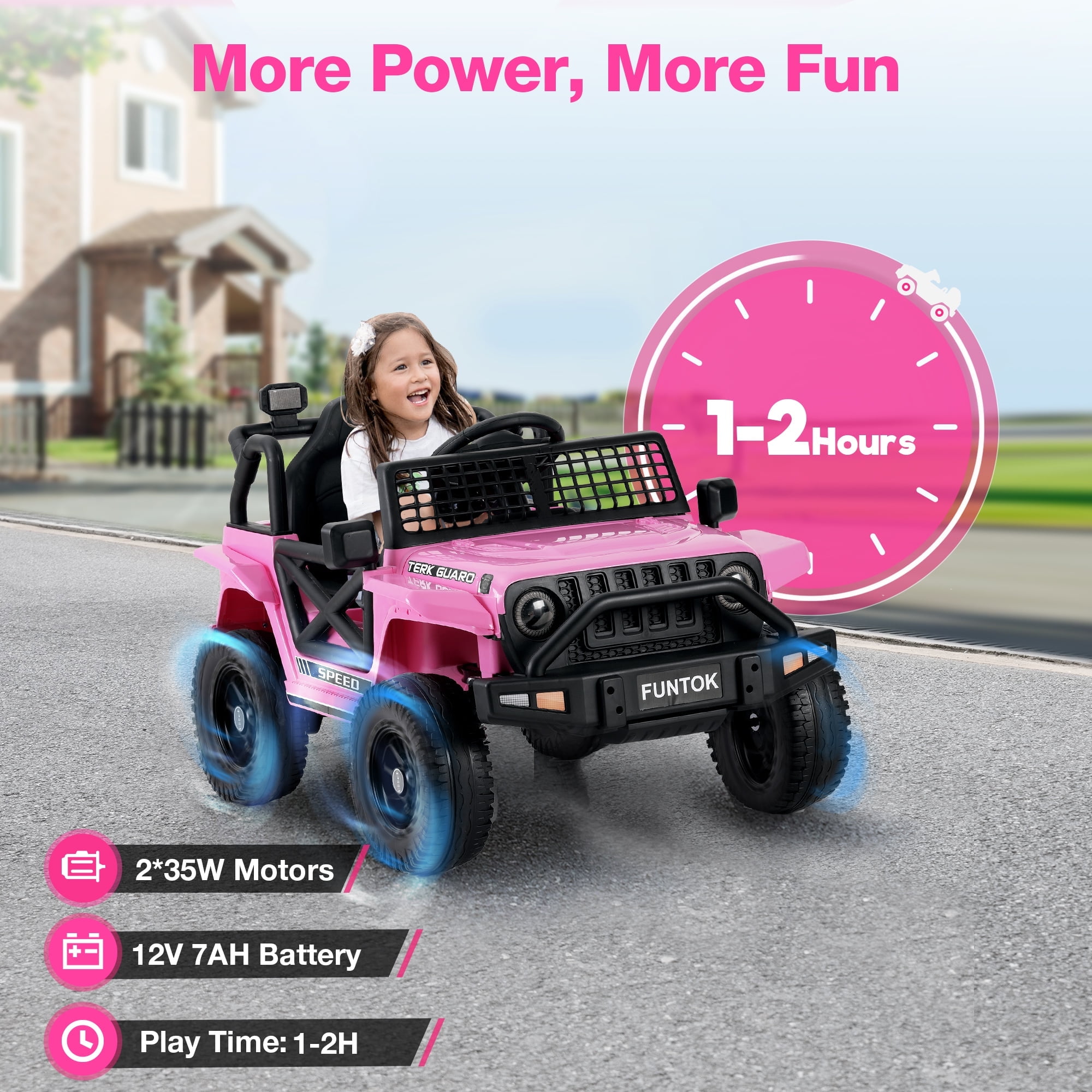 12V Ride On Truck Key Features: Powerful Driving Performance Electric ride car for kids is equipped with a high-capacity 12V 7AH battery, which allows for 1-2 hours of continuous use.With 2 x 35W motors, power ride for kid provides ample power,allowing the battery powered riding toys to navigate easily on grass, mud, and asphalt surfaces. 2 Riding Modes Your child can operate the battery operate truck for kid 1-3 independently using the steering wheel and pedals,enjoy 2 different speeds.Parents can control their kid car power ride on with a 2.4GHz remote with 3 speeds.Highest speed reaches 3.2 mph.Press the P button to activate the emergency brake. Play with Safety Ride on truck with parental remote comes with adjustable buckle up seat belt, double-locking doors,non-slip PP tires protects kid’s safety in many ways. 4 Spring suspension and slow start function offers a comfortable journey and ensure a gentle and safe acceleration. Spacious 15″ Wider Seater 12volt ride on truck car comes with a wide seat .The maximum weight capacity for this electric truck for kids is 66 Lbs, providing a comfortable and roomy ride for children aged 3 to 8. Fun Entertaining Function Our kid car to ride in equipped with the Buletooth,MP3 player, USB port.One-button start design,real foot pedal acceleration, steering direction control,bright LED lights and loud horns add more fun.These realistic functions will make your kid’s ride more enjoyable. Ideal Present for Kids Truck ride on toddler car is the safe present for boys and girls on Birthdays,Thanksgiving, Xmas, New Year’s, Children’s Day, and other holidays that brings endless smiles and excitement to kids. Specifications for Electric Car for Toddler 3-5: Product Name : Kids Battery Powered Vehicles Safe Certificate : ASTM,CPSIA Battery Type : 12V 7AH Motor Type : 2 x 35W Color : Pink / Black / Red / White Recommended Age : 3 to 8 years Material : PP(Polypropylene) and Iron Maximum User Weight : 66 lbs (30 kg) Maximum Speed : 3 – 5 km/h (1.86 – 3.2 mph) Charging Time : 8-12 hr. Run Time : 1 – 2 hours (Depending on the child’s weight and riding speed) Music Function : Bluetooth / MP3 player / USB port / FM Controller Batteries : 2 AAA batteries (not included) Product Size : 39 inches (L) x 25 inches (W) x 24 inches (H) Package Includes: 1 x Kid Car Power Ride On 1 x 2.4G Remote Control (Batteries not included) 1 x Charger 1 x Manual Warm Tips: Please carefully check the size of the kids cars to drive and combine the children’s age and body shape when purchasing. Always keep the child in view when the child is in the power ride on truck. For the best performance, please ensure to charge the battery car for kids for 8-12 hours before its first use.