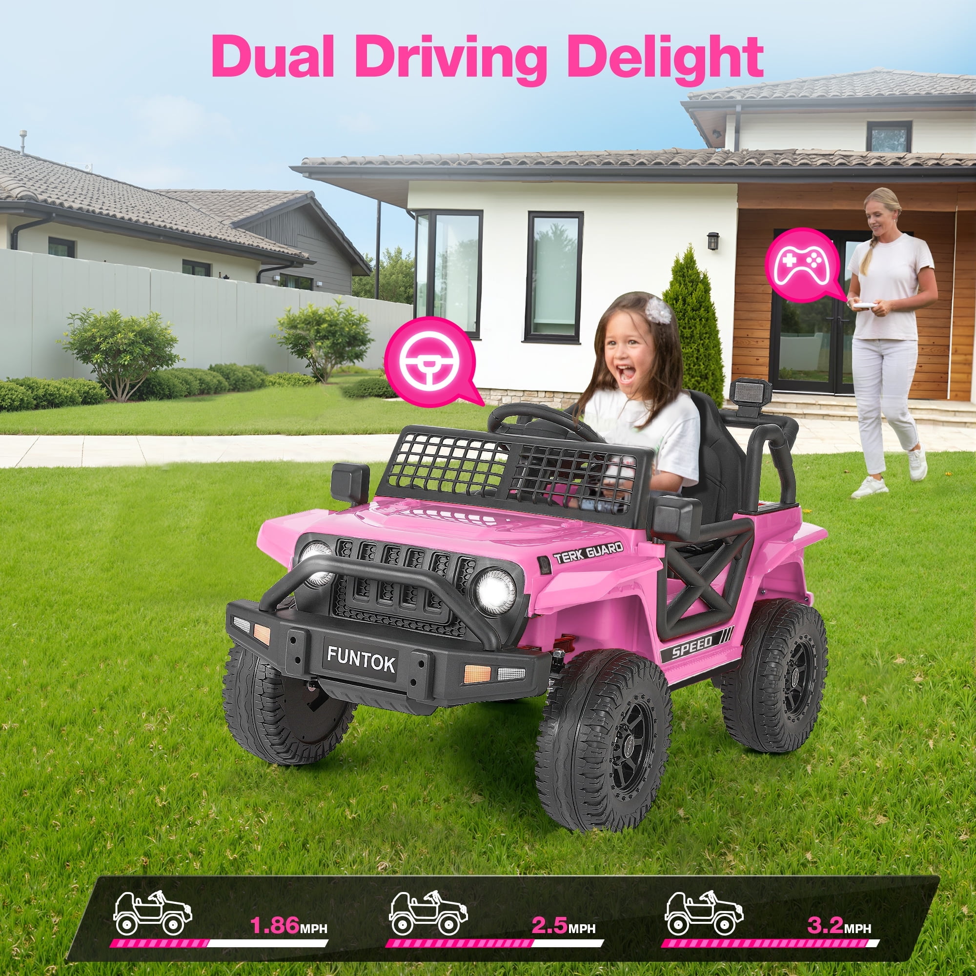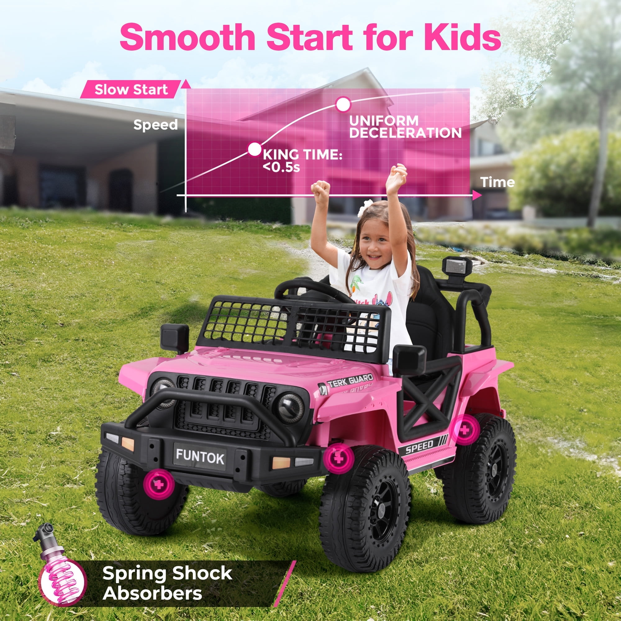 FUNTOK 12V 7AH Kids Ride on Toys, Electric Ride on Car Truck Battery Powered Vehicle w/ Parent Remote Control, Bluetooth, Spring Suspension, MP3 Player & LED Lights, 3 Speeds,Pink