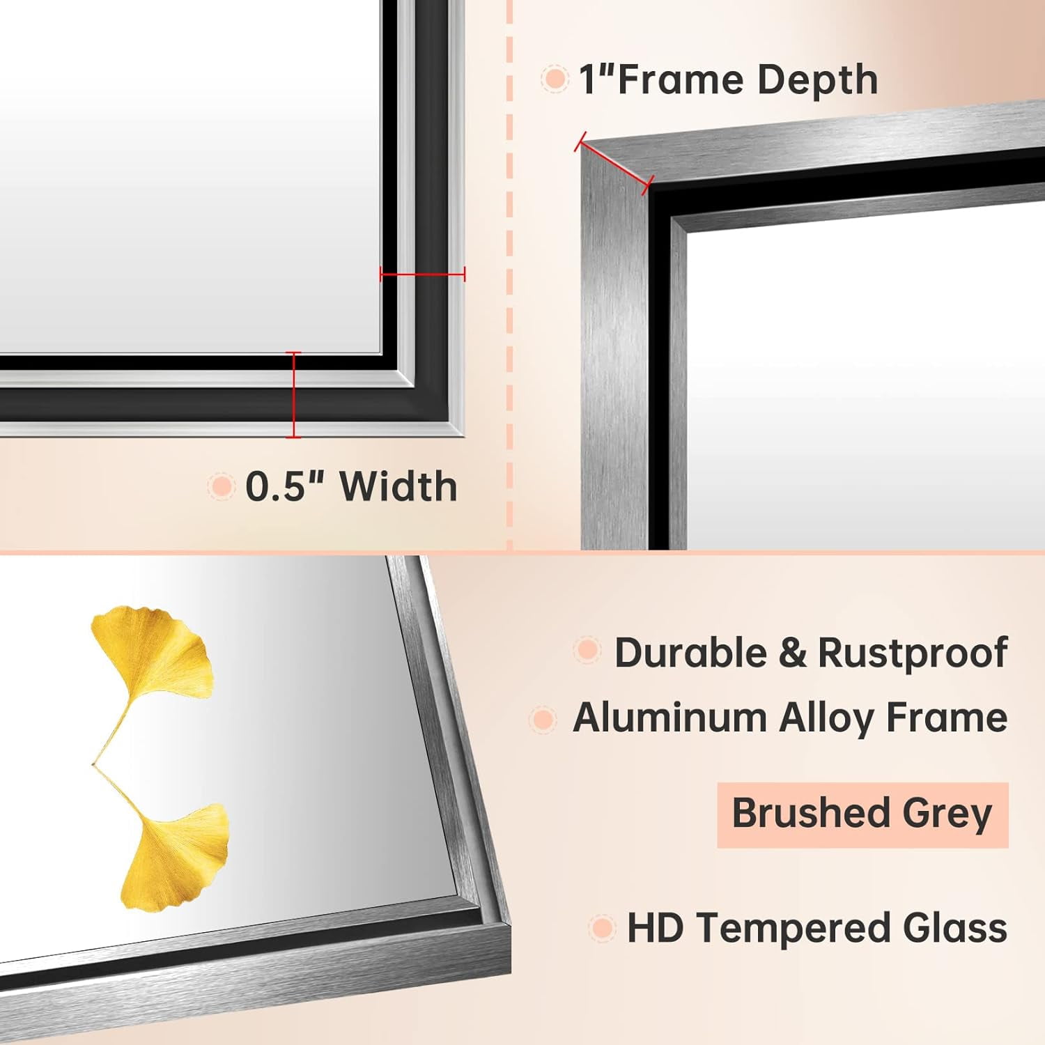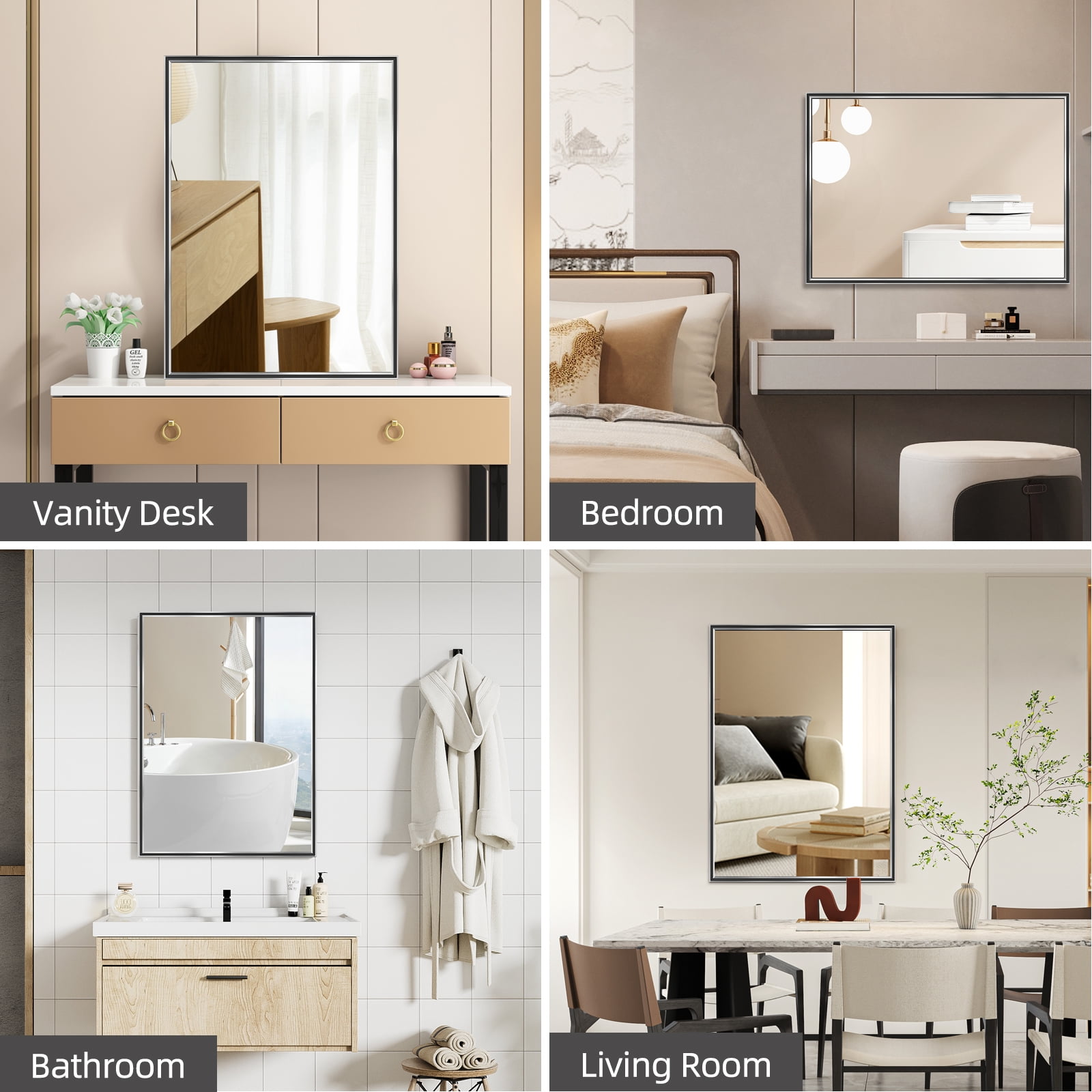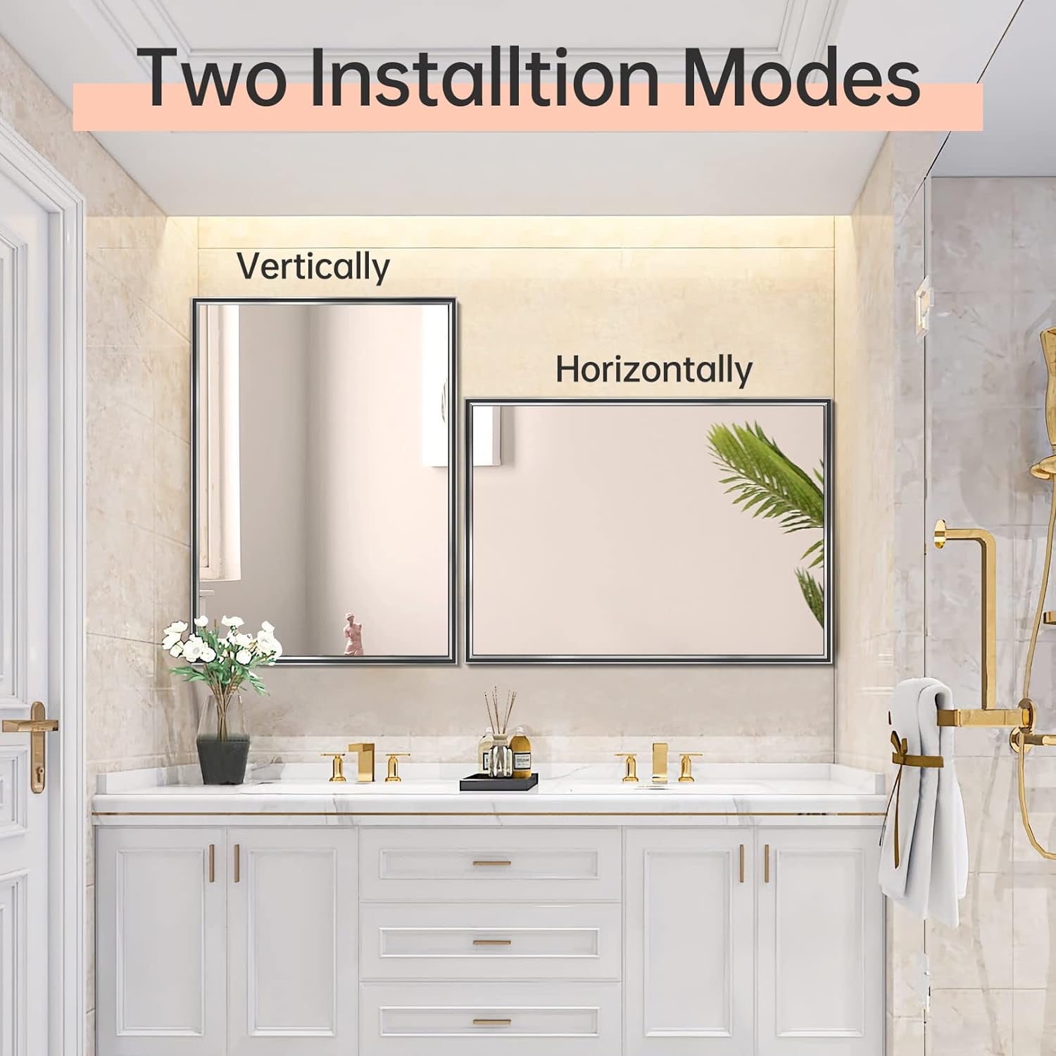 【Clear Reflection & NO Distortion】: FUNTOUCH bathroom vanity mirror is designed with HD float glass to deliver a clear reflection with no distortion; clear lines; simple modern design makes it an ideal bathroom vanity mirror. 【Sturdy & Safe Mirror】Our hanging vanity mirror of 5MM tempered glass has 5 times the strength of ordinary mirrors, and will not shatter into pieces under the impact of strong force. It is robust and safe to use. The rectangular wall mirror has the most chic brushed bronze finish. Durable Aluminum alloy frame and PVC shatterproof film would strengthen the floating glass for safety, waterproof and anti-corrosion in wet bathroom environments. 【Easy installation 】 Bathroom vanity mirror with 4 built-in slots on the back, can be hung horizontally or vertically. Super easy to install and only takes 10 minutes to install. Accessories and hardware included. We’ve designed a sturdy 4-layer package for the mirror, so you don’t have to worry about receiving a broken mirror. 【Multiple Hangs Modes 】Boasting a simple and modern style, this black bathroom mirror is the perfect choice for a variety of rooms. The installation of hanging vanity mirror is easy, which can be done in 2 steps according to the instructions, and you can hang on the framed mirror vertically or horizontally. Whether in the bathroom, bedroom, living room, dining room, entryway, or even above the fireplace, this decorative wall mirror effortlessly enhances the vintage atmosphere. 【Waterproof and rust-proof】Compared with other mirrors, our bathroom mirror frame is made of high-quality aluminum alloy and enhanced paint, completely waterproof and rust-proof. It’s very durable. Its sleek black/gold design effortlessly complements any modern or classic home style, no matter where it’s placed, instantly adding a touch of sophistication to any space. 【After-Sale Service 】Backed by a 100% safety guarantee, this mirror has been packaged to pass drop and impact tests, giving you peace of mind.Customer satisfaction is our first goal. If you have any questions about our bathroom mirror please feel free to find our FUNTOUCH Online customer service team, they will reply you within 12 hours, and give you a satisfactory solution. Product Description: Color select: Gold/Black Grey Size:20”x 28”,24”x 36” Shape: Rectangular Metal Frame bathroom mirror Material:Aluminum Alloy & 5mm Shatter-proof Glass Room Type: Living room, dining room, bedroom, Hair Salon, Hotel or long hallway Mounting Type: Wall Mount, Horizontal/Vertical
