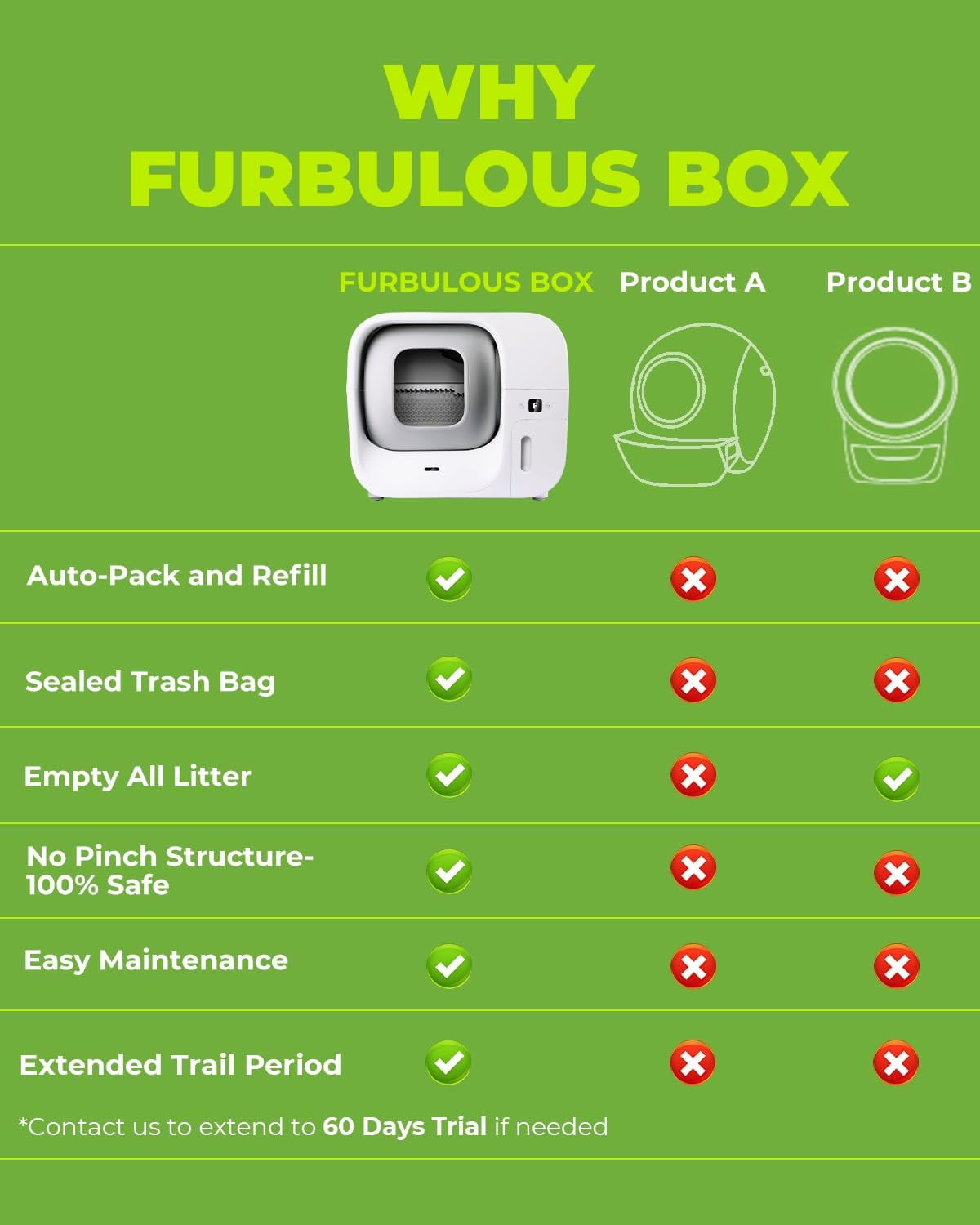 WORLD’S FIRST SELF-PACKING AND REFILLING LITTER BOX: The Furbulous Box is the world’s first cat litter box that truly achieves automatic packing and refilling of trash bags, keeping all waste sealed and eliminating odors and germs leakage for a healthier home environment MULTIPLE SAFETY SENSORS: Equipped with proximity, weight, and IR sensors to ensure 100% safety for your cat during use, with no pinch structure to prevent accidents ULTRA-QUIET OPERATION: Enjoy a quiet and smooth operation with noise levels as low as 37dB during packing, making it perfect for any home setting EASY DISPOSAL AND CLEANING: Effortlessly dispose of waste with one-click emptying and enjoy easy maintenance with washable and detachable parts APP MONITORING AND CONTROL: Track your cat’s behavior and weight, control the litter box remotely, and receive visualized insights via the Furbulous app, available on App Store and Google Play 60L EXTRA LARGE CAPACITY: Perfect for Large-Sized Cats and Multi-Cats Families and the extra-large globe capacity fits cats weighing up to 22 lbs