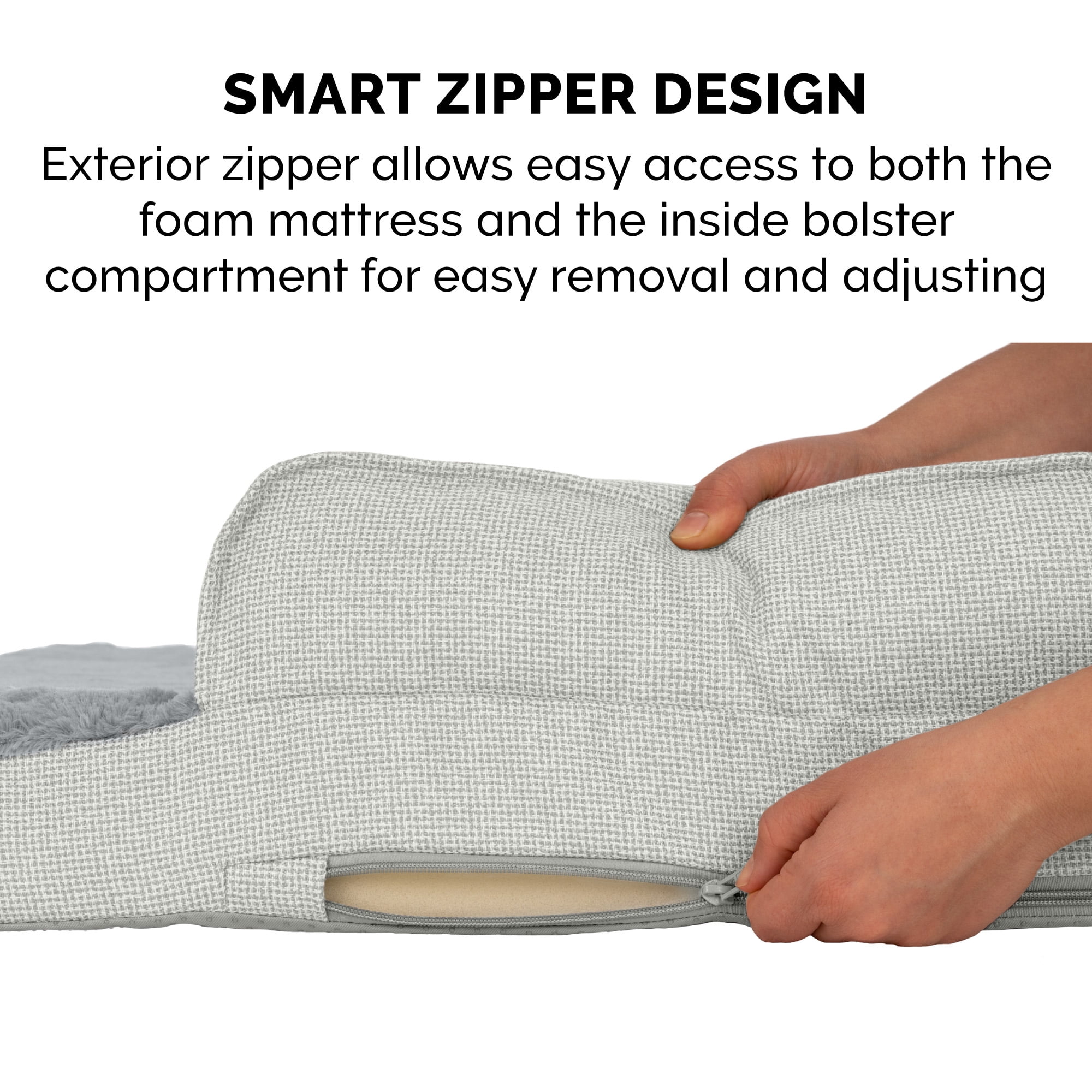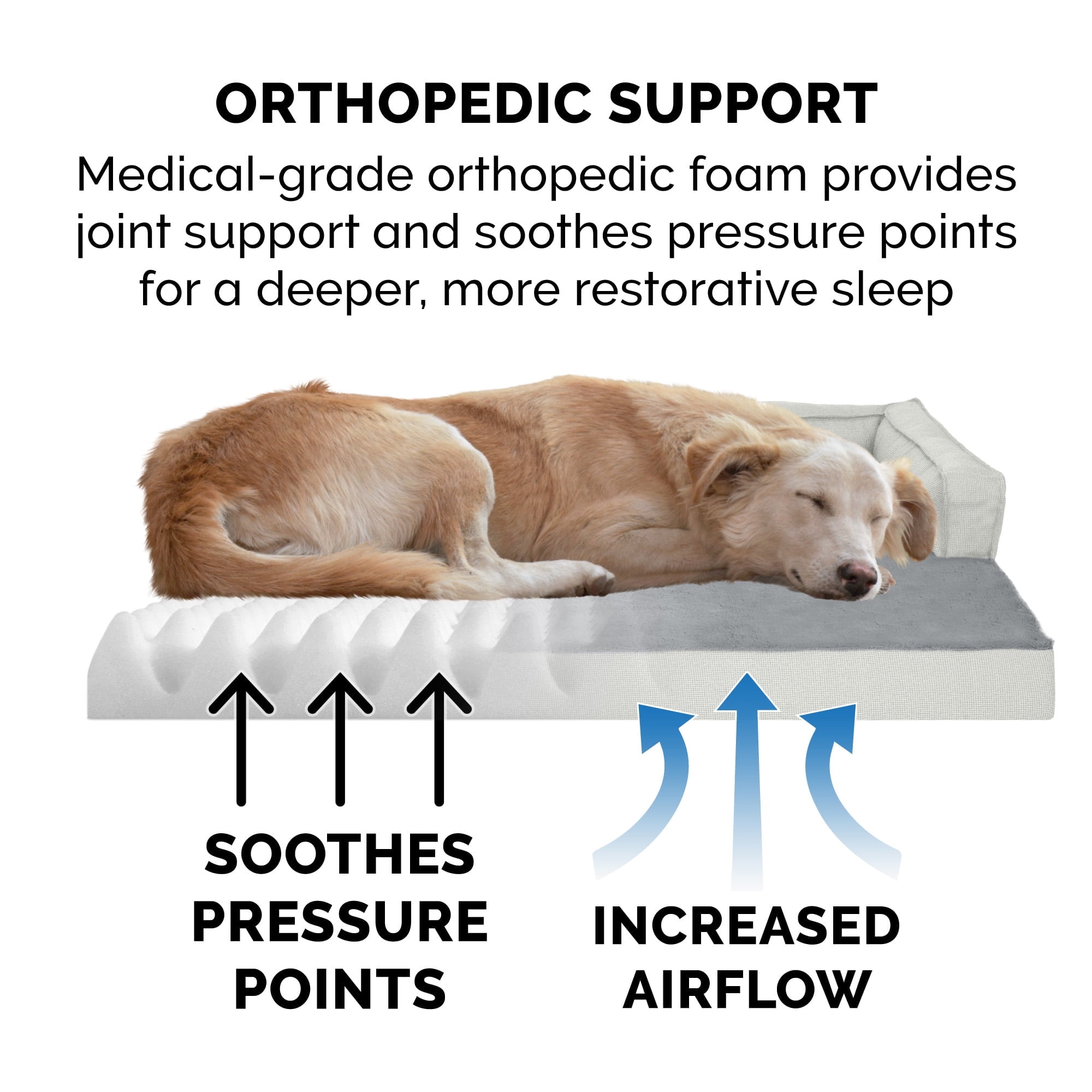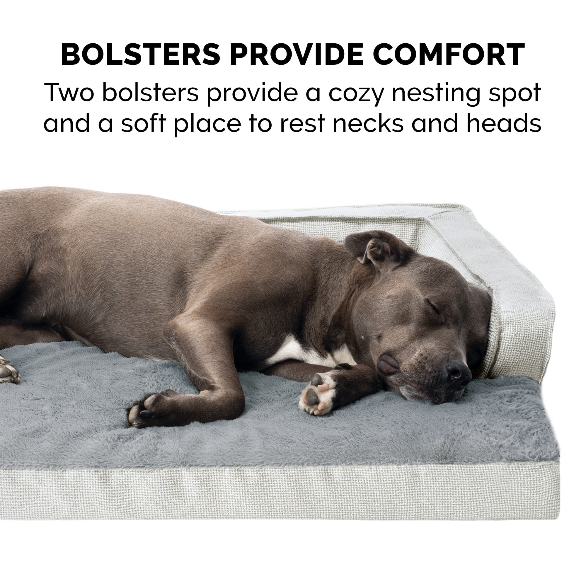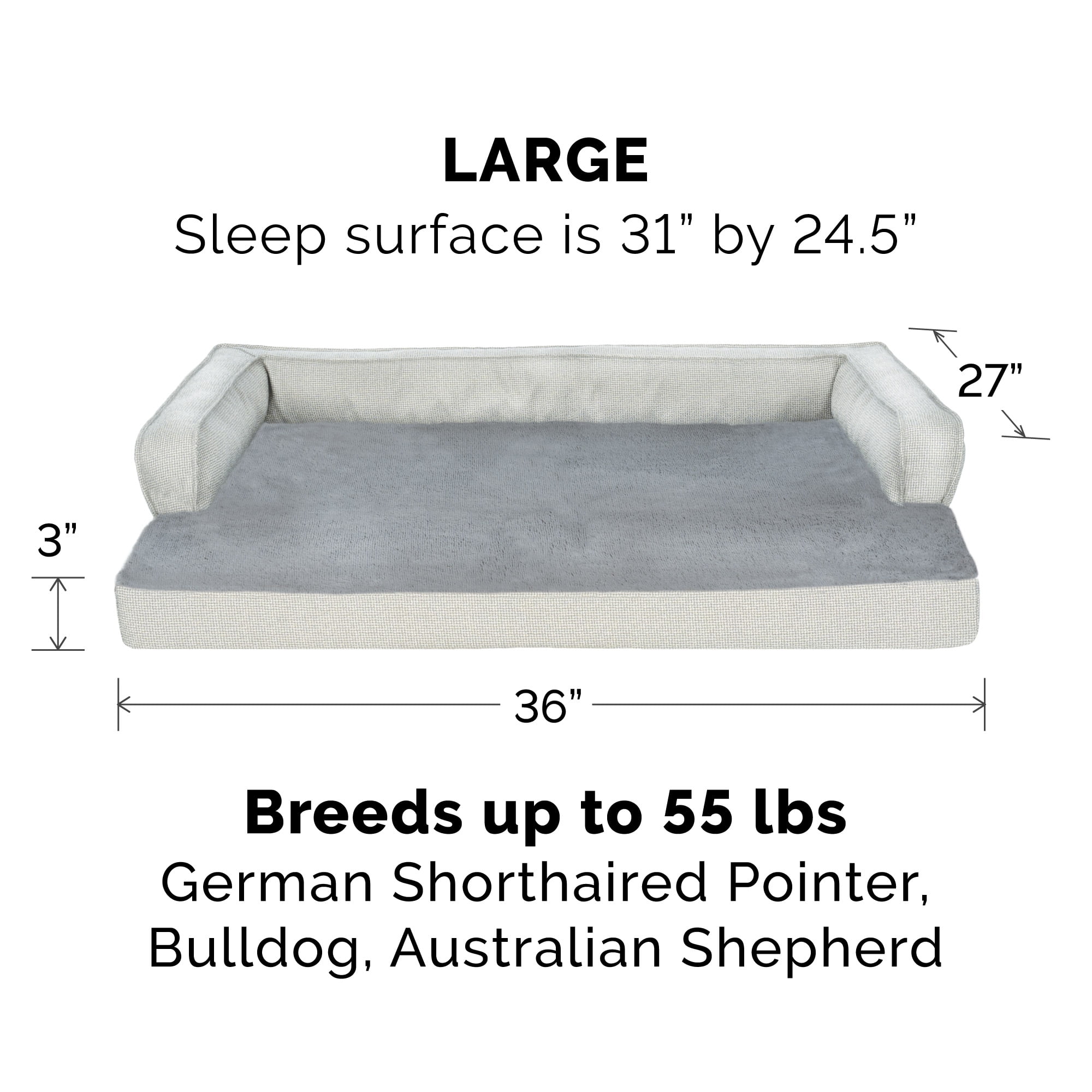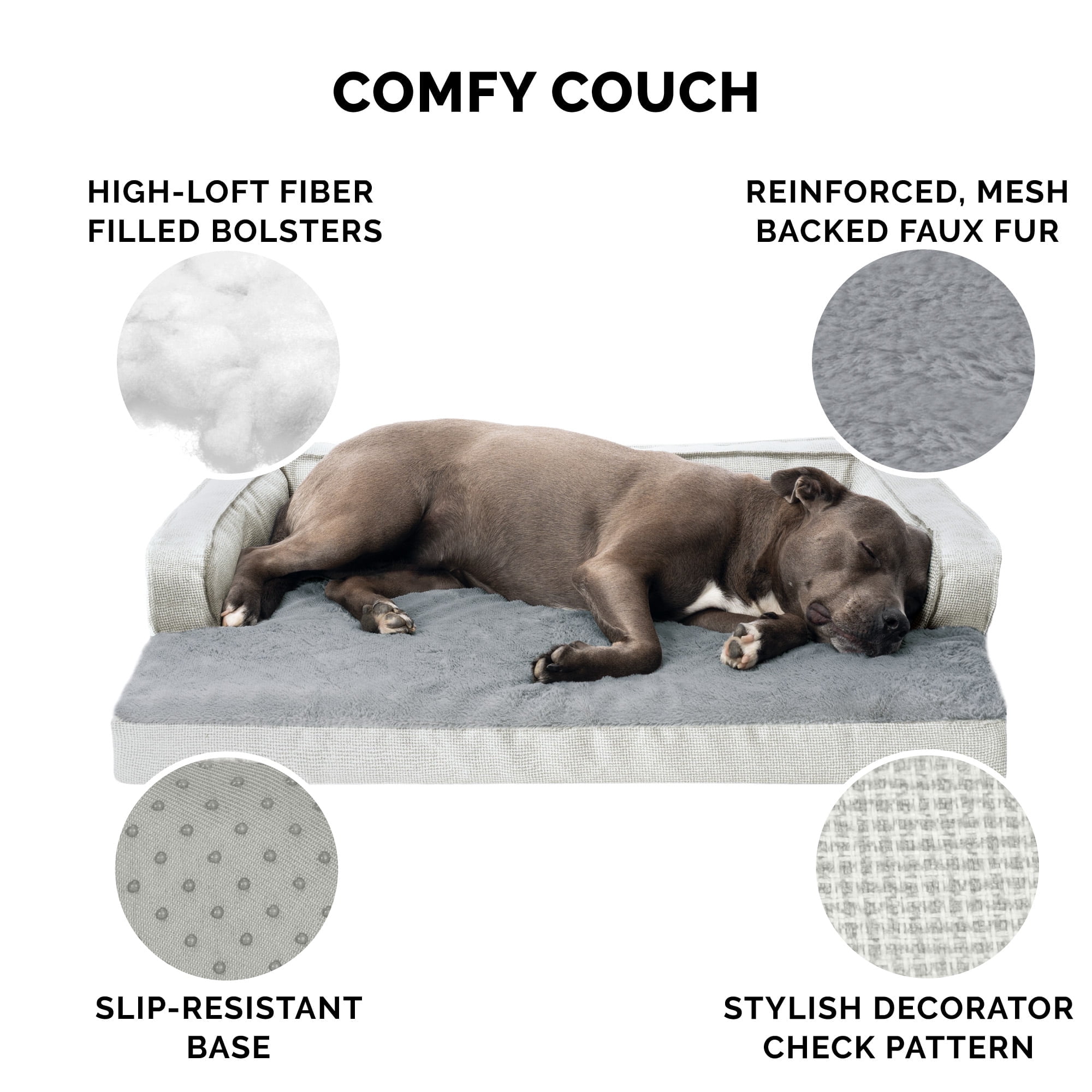 COMFORT AS PRIORITY: The sofa-style design creates a cozy and inviting space that promotes comfort and security; designed with supportive bolsters for dogs to rest their heads on for optimum lounging comfort SLEEP SURFACE: Featuring a cuddly plush faux fur main sleep surface and bolsters wrapped in checked woven upholstery fabric; both are gentle on noses and paws for enhanced snuggling and burrowing comfort EASY ON JOINTS: The egg crate orthopedic foam base helps cushion pressure points and improve air circulation, while fluff-filled bolsters support the neck, back, hips, and joints; helps ease discomfort and promote restful sleep CUSTOMER ASSURANCE: Comes with a 90-Day Limited Coverage against material defects and may also qualify for our 60-Day Worry-Free Program; restrictions apply: purchases from unauthorized 3rd party resellers may not be covered by Furhaven PRODUCT DETAILS: Orthopedic Dog Bed, Gray; Large – 36″ x 27″ x 7″ (3″ Base Foam Height; Sleep Surface: Approx. 31″ x 24.5″) CERTIPUR-US: Our foam is independently tested to meet CertiPUR-US standards for emissions, content, and durability; made WITHOUT formaldehyde, phthalates, mercury, lead, and ozone destroyers
