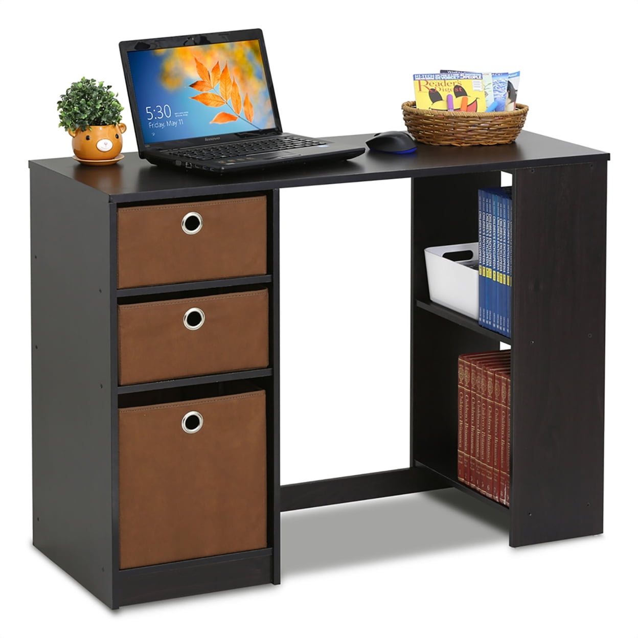 15110 Jaya Modern Computer Study Desk, Espresso Description: Furinno JAYA Modern Computer Study Desk is designed for space saving and modern stylish look. It is great for apartments and dorms where space is limited. The shelves provide storage spaces for computer, books and other accessories. Three non-woven bins are provided for storage of small loose stuff. The main material – medium density composite wood is manufactured in Malaysia and complied with the green rules of production. There is no foul smell, durable and the material is the most stable amongst the medium density composite woods. A simple attitude towards lifestyle is reflected directly on the design of Furinno Furniture, creating a trend of simply nature. All the products are produced and assembled 100-percent in Malaysia with 95% – 100% recycled materials. Care instructions: wipe clean with clean damped cloth. Avoid using harsh chemicals. Pictures are for illustration purpose. All decor items are not included in this offer. Fits in your space, fits on your budget. Three non-woven bins provided for storage of loose stuff. Sturdy on flat surface. Some assembly required. Features: Color: Espresso Simple stylish design yet functional and suitable for any room that has limited space for a computer. Material: E1 Grade composite wood Product Dimensions: 29.29″Dx39.37″Wx15.74″H, Weight: 37.4lbs Country of Origin: Malaysia Brand Name: Furinno Model No: 2088-15110EXBR