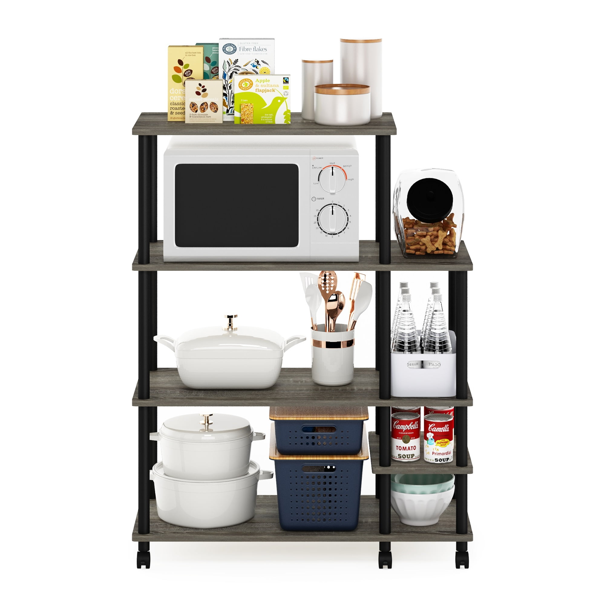 The simple and elegant cart appearance is your best choice for decorating your kitchen. 4-tier open shelves offers plenty space for cooking utensil and kitchen supplies. Manufactured from CARB Grade composite wood with low grade melamine laminate and PVC tubes. Equipped with 3 lockable casters and 3 smooth rolling casters for easy transportation. Easy to assemble. Assembly instruction and hardware pack included. Each shelf holds up to 35 lbs- 5 lbs on small shelf. Product Dimensions:15.6 (D) x 35.2 (W) x 46.1 (H) .