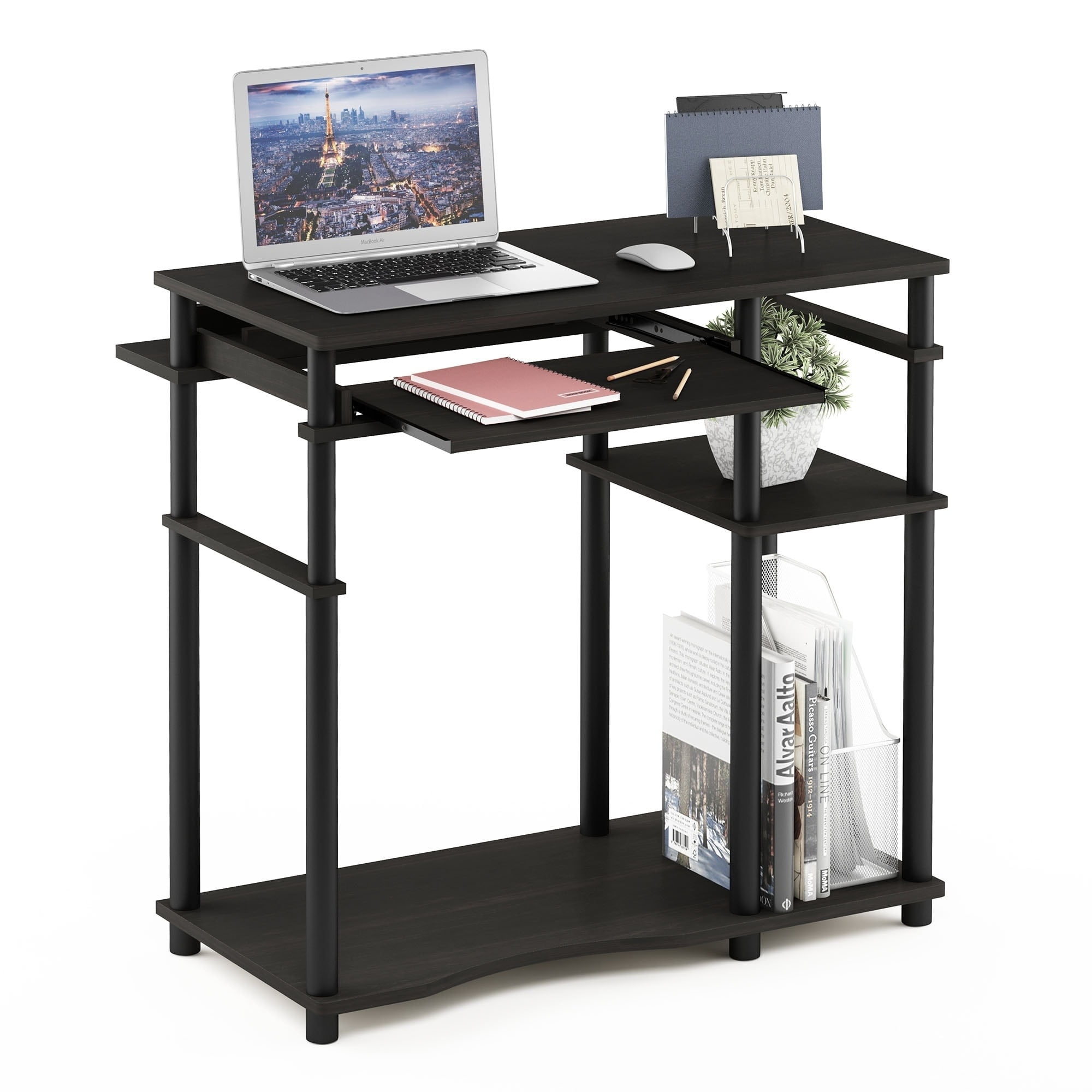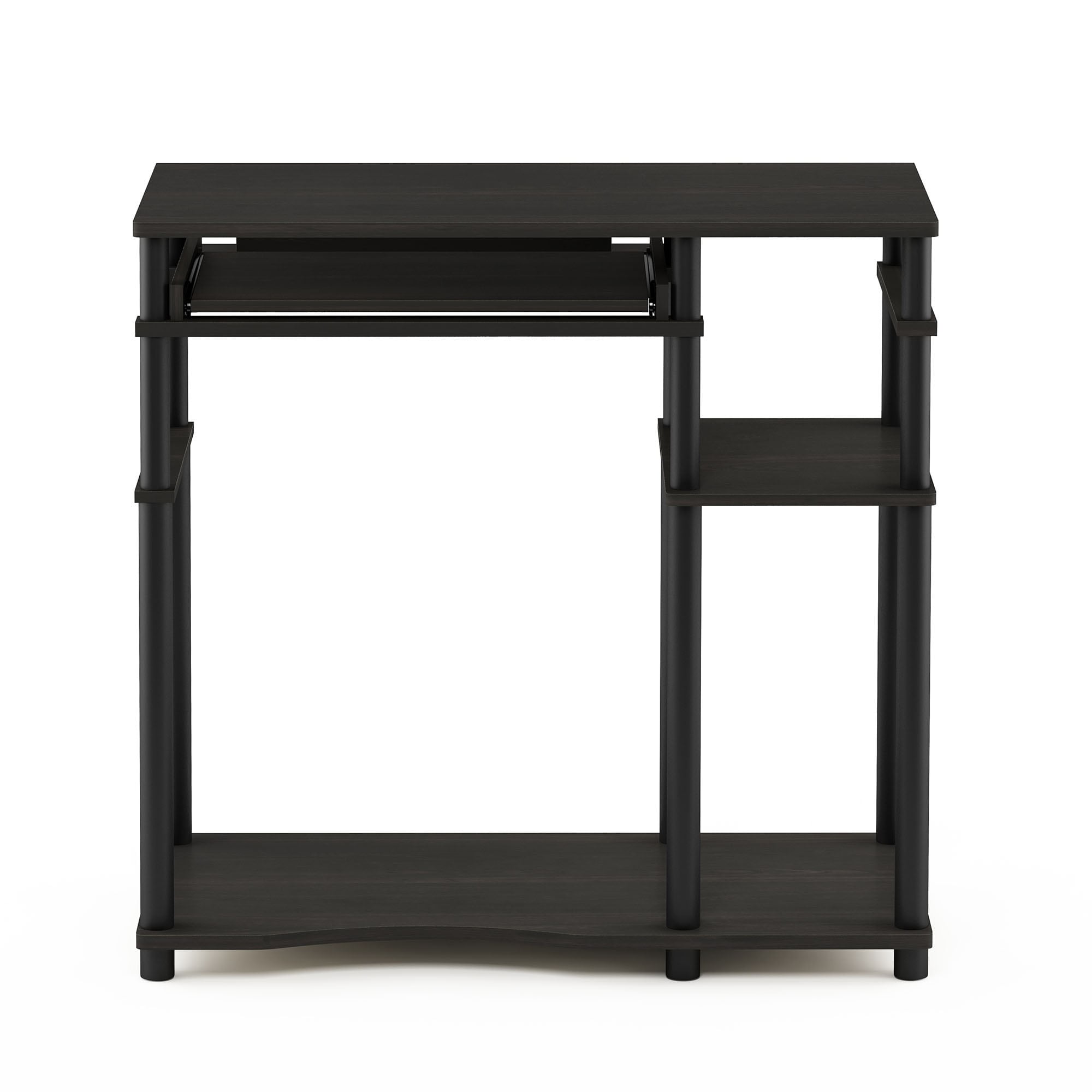 Material: Engineered wood Finish: Espresso, black Sturdy construction made of MDF and PVC tube Sliding tray for storage and easy access to keyboard Fits in your space, fits on your budget Easy assembly with provided hardware and instructions Large open space for a desktop and other items