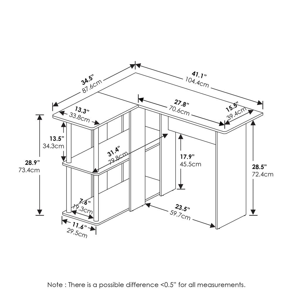 This L-shaped desk is designed to fit in any corner of an office or room space. Perfect choice of desk to maximize your limited space. Fits Space, Fits Budget. The spacious L-shaped desk top provides ample workstation for working, studying, writing and other activities. The side shelves offers storage space for your stationaries, books, files and etc. The desk top surface holds up to 40 lbs; each side shelf holds up to 15 lbs. Manufactured from CARB Grade composite wood. Features rounded edge to reduce the risk of injury. Product Dimensions: 34.5 (D) x 41.1 (W) x 28.9 (H) inches