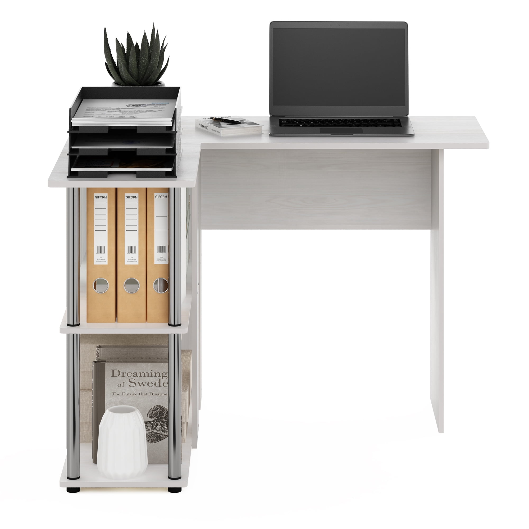 Furinno Abbott L-Shape Desk with Bookshelf, White Oak, Stainless Steel Tubes Furinno Abbott L-Shape Desk with Bookshelf is made with contemporary and exquisite workmanship, manufactured from CARB Grade composite wood. The desk comes in multiple colors, Espresso, and French Oak Grey for customization. The L-Shape design allows for space saving with a larger desk, designed to maximize any corner of an office or home space. There are 2 levels of open shelves available for storing and organizing personal items. The L-shape desk is made of CARB-grade composite wood tested for durability and sturdiness. A simple attitude toward lifestyle is reflected directly in the design of Furinno Furniture, creating a trend of simple nature. Assembly is easy with provided step-by-step instructions. Care instructions: wipe clean with a clean damped cloth. Avoid using harsh chemicals. Pictures are for illustration purposes. All décor items are not included in this offer. The product is entitled to a 1-year warranty against manufacturer defects. This L-shaped desk is designed to fit in any corner of an office or room space. Perfect choice of desk to maximize your limited space. Fits Space, Fits Budget. The spacious L-shaped desk top provides ample workstation for working, studying, writing and other activities. The side shelves offers storage space for your stationaries, books, files and etc. The desk top surface holds up to 40 lbs; each side shelf holds up to 15 lbs. Manufactured from CARB Grade composite wood. Features rounded edge to reduce the risk of injury. Product Dimensions: 34.5 (D) x 41.1 (W) x 28.9 (H) inches – Color: White Oak/Chrome – Color Family: Multi – Item Depth: 34.5 – Item Height: 28.9 – Item Width: 41.1 – Item Weight: 40.26 – Purpose of usage (comerial/residental): Residential – Item Material: Wood