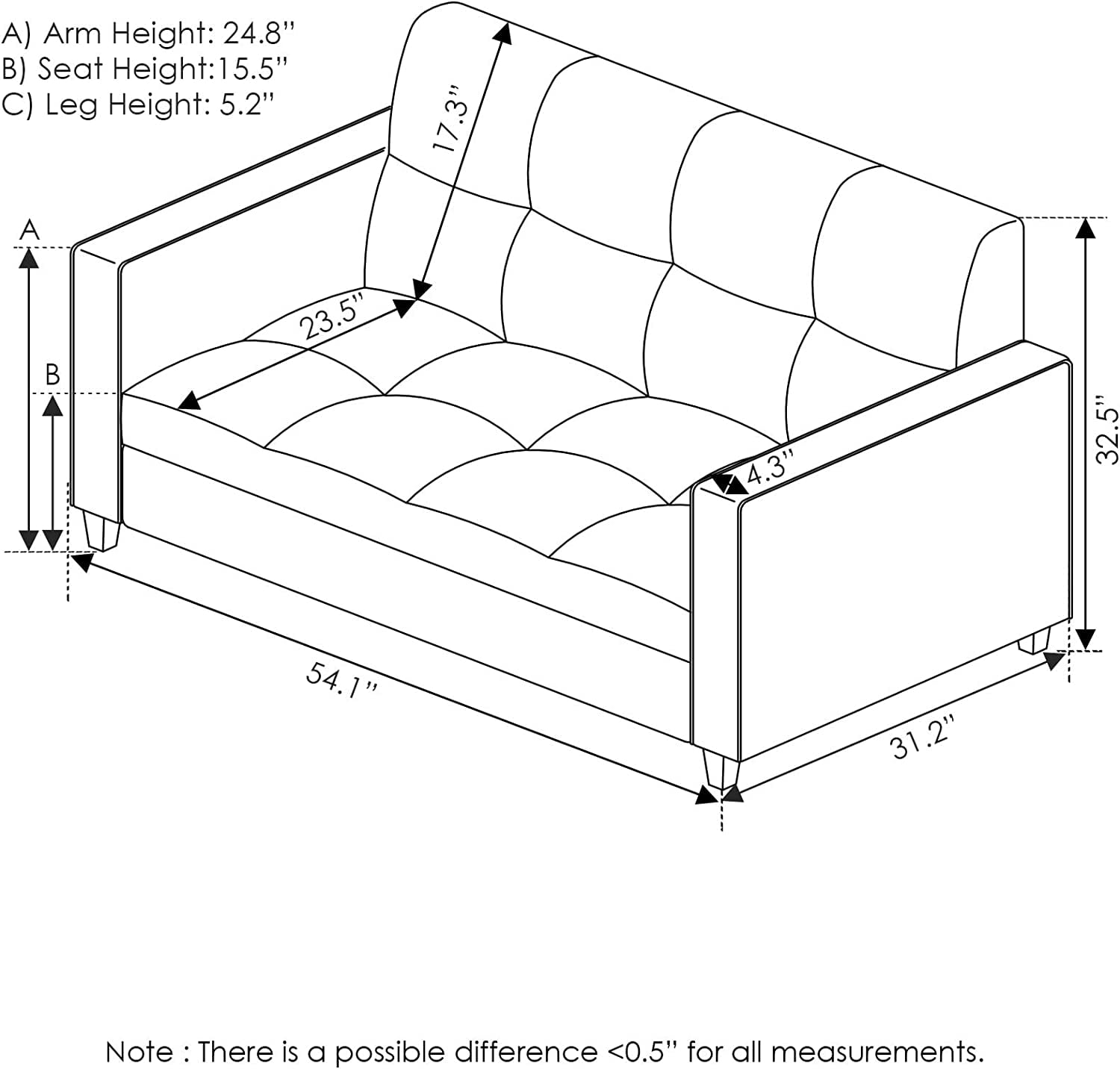 Tufted faux leather upholestery with slightly tapered legs Designed and manufactured to hold up to 550 pounds. Square arms 3 loveseat with cushioned back and seat for enhanced comfort Product Dimensions: 54.13 (W) x 32.28 (H) x 31.89 (D) in