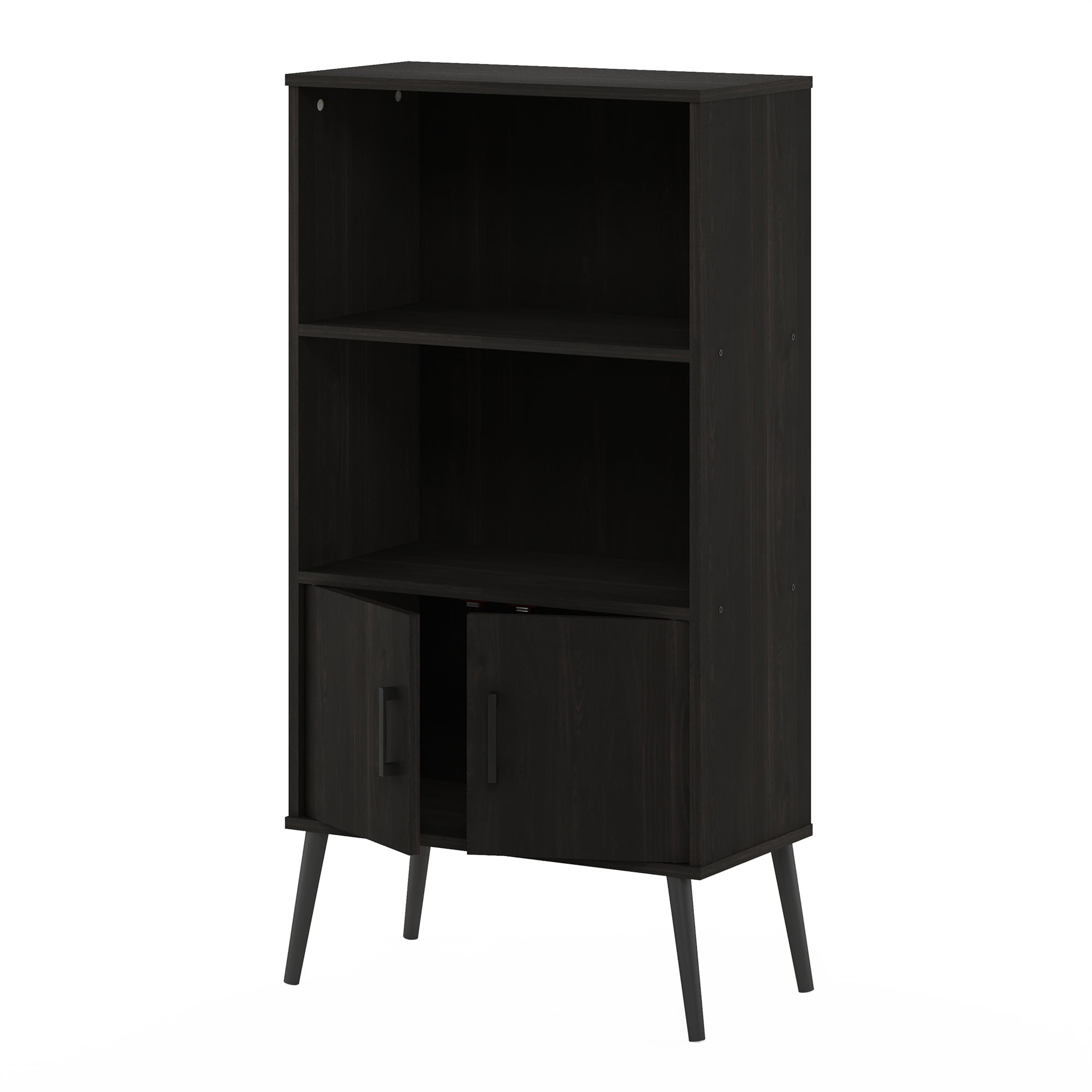 The clean lines design bring mid-century intrigue to your living space. Made of durable CARB Grade composite wood with angled pine wood legs. Fits in your space, fits on your budget. Sturdy on flat surface. Some assembly required. Please see instruction. It comes with anti-toppling hardware to prevent this bookcase from accidentally tipping over. It features 2 tall shelving and a storage cabinet to hold books, games, and decorations.