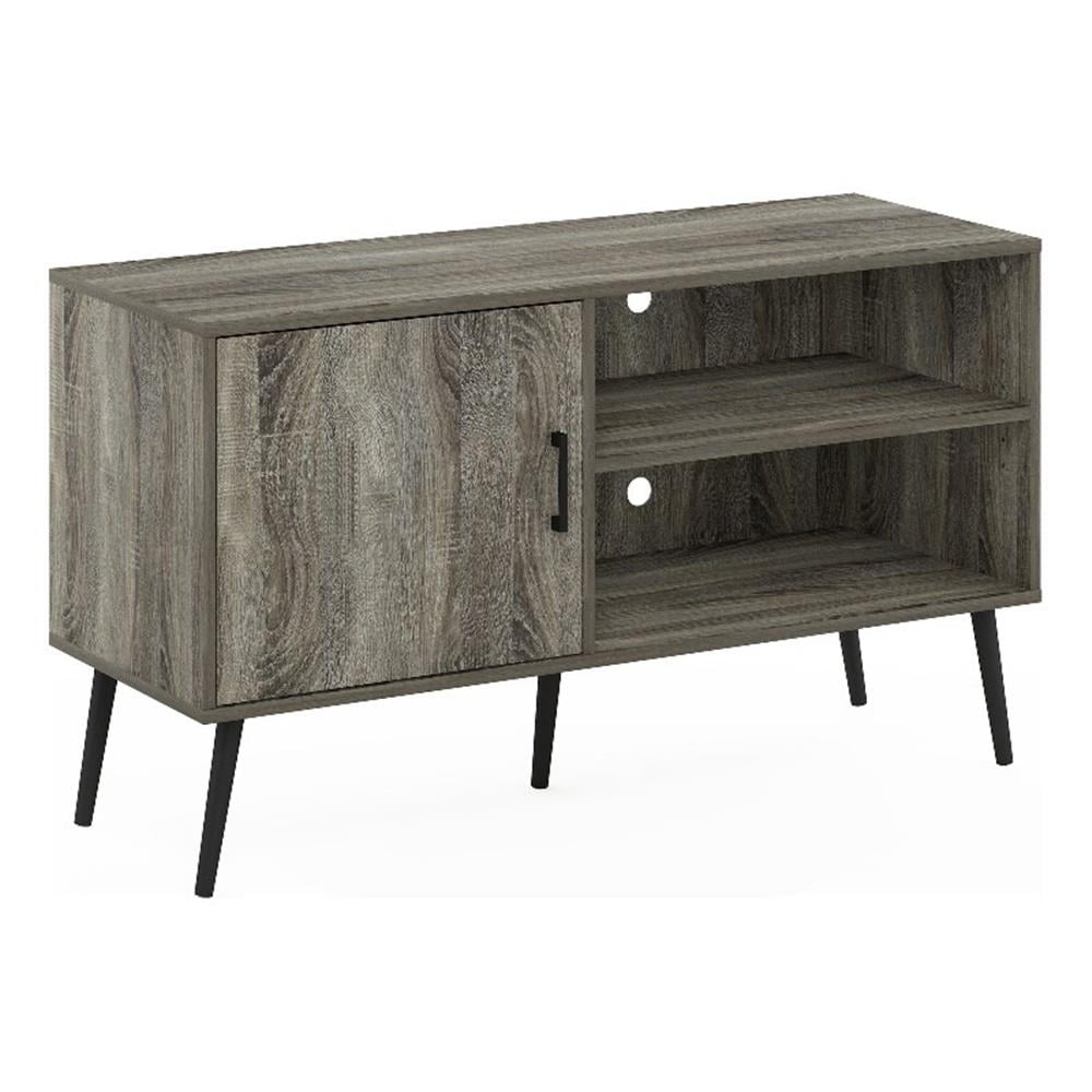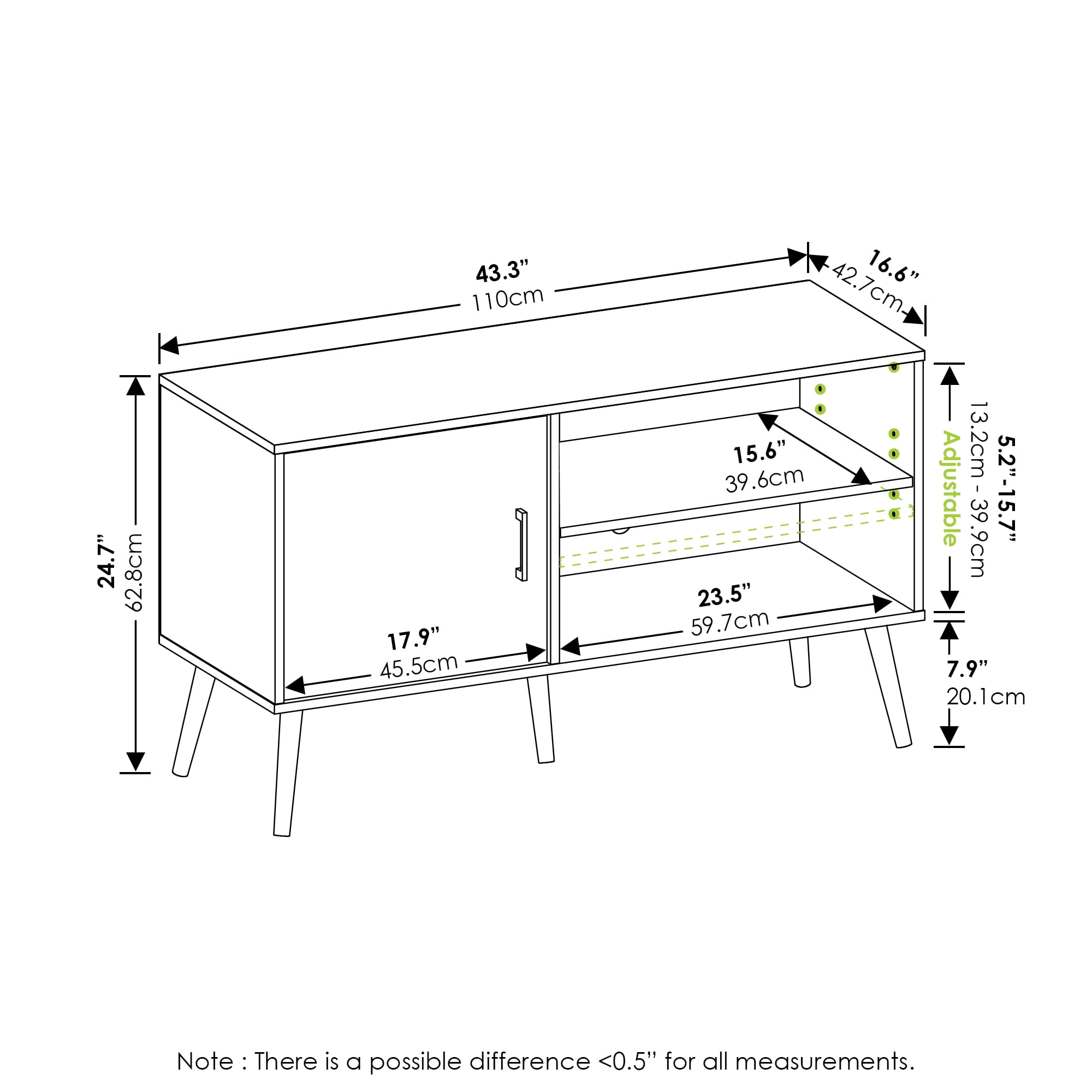 The clean lines design bring mid-century intrigue to your living space. Made of durable CARB Grade composite wood with angled pine wood legs. Fits in your space fits on your budget. Recommended maximum weight is 40 lbs up to 45 in flat screen panel. Cable management hole help to hide unsightly cords. Features with two open storage units and a concealed storage cabinet.