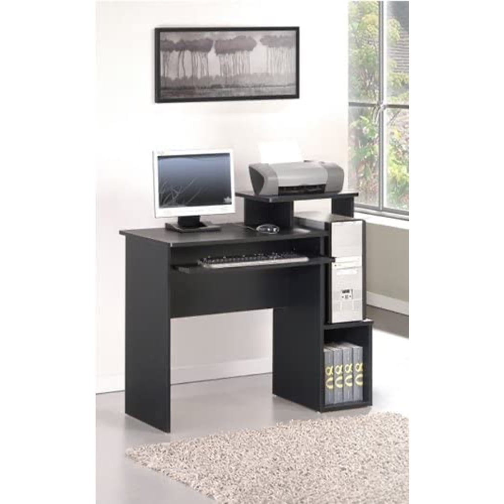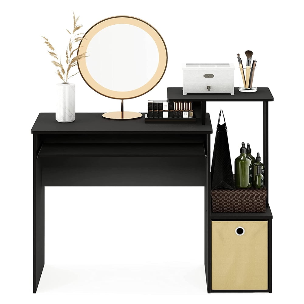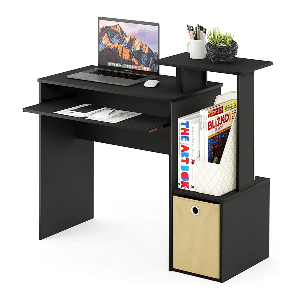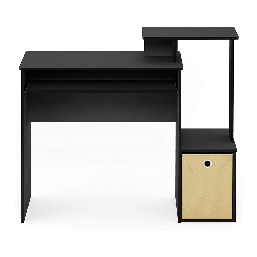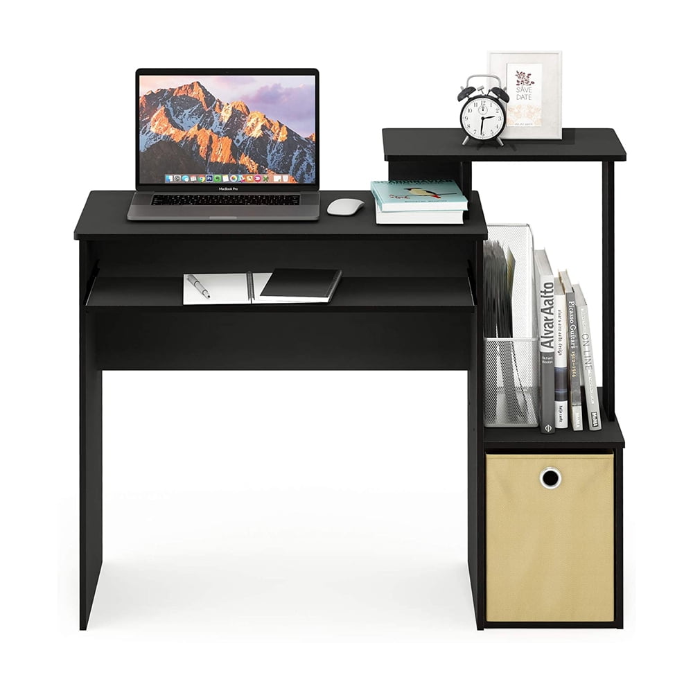 Home office desk with slide-out keyboard tray, side shelves, and a non-woven bin for storage Provides plenty of space and is suitable for small rooms or home offices Main parts of Furinno products are constructed from particleboard that is made from recycled materials from rubber trees, recyclable PVC tubes, and non-woven bits that are all environmentally friendly Designed with round edges for added safety to reduce accidental injuries Don’t break a sweat or drag out your toolbox with this quick and simple setup process Measures 15.8 inches deep, 39.4 inches wide, and 34.1 inches tall Material: Particleboard Color: Black/Brown Dimensions (D x W x H): 15.8 x 39.4 x 34.1 inches Desktop dimensions (D x W x H): 15.8 x 29.6 x 28.5 inches Weight: 35 pounds Manufacturer warranty: 1-year warranty