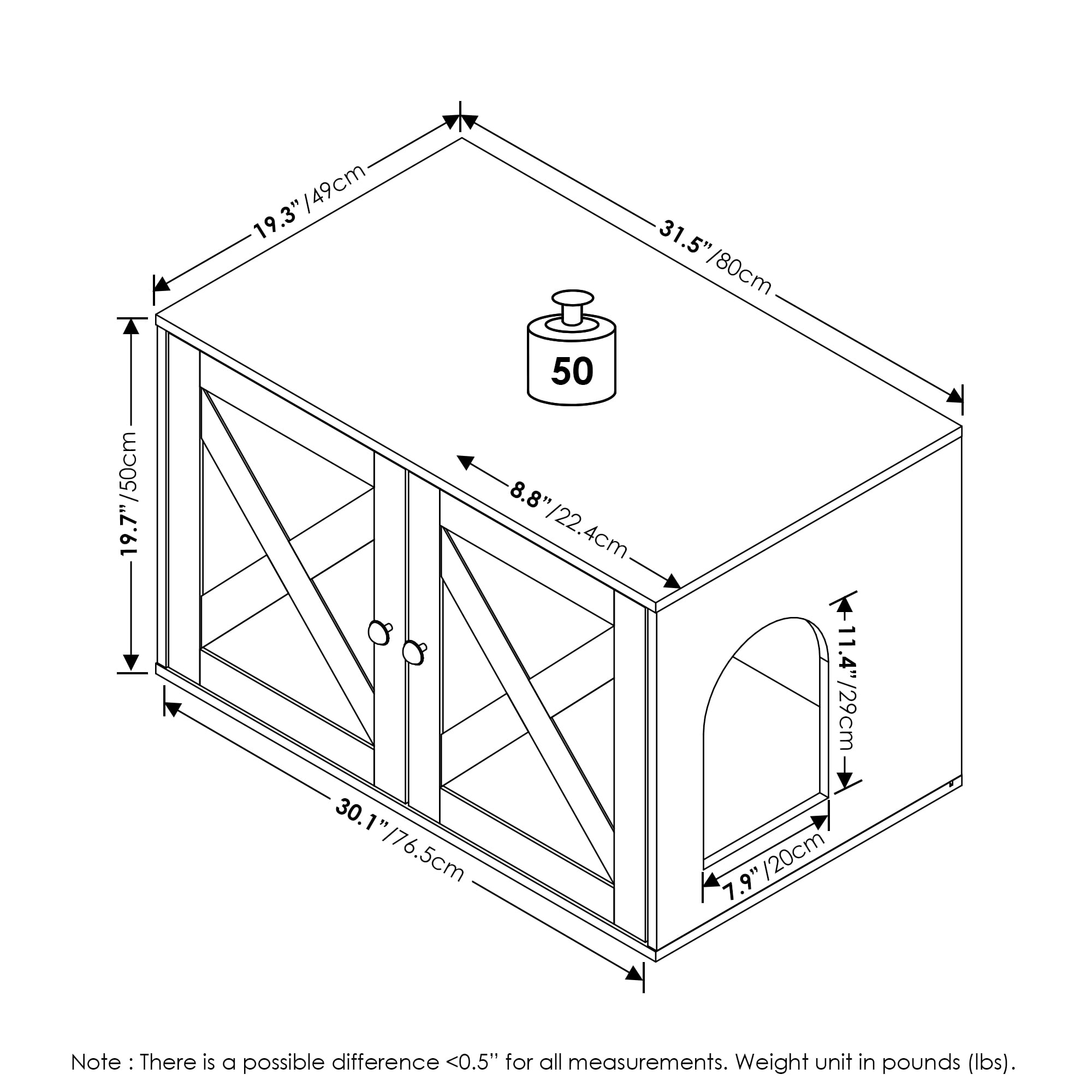 The cat litter box enclosure is a stylish and practical solution for hiding your cat’s litter box. Fits Space, Fits Budget. The enclosure is designed to accommodate most standard-sized litter boxes, providing ample room for your cat to move comfortably. The top surface of the enclosure can be utilized as additional storage or display space for decor items. Manufactured from high-quality durable composite wood, CARB-compliant composite wood carrying the Programme for the Endorsement of Forest Certification (PEFC). Product Dimension: 31.5 (W) x 19.69 (H) x 19.29 (D) Inches.