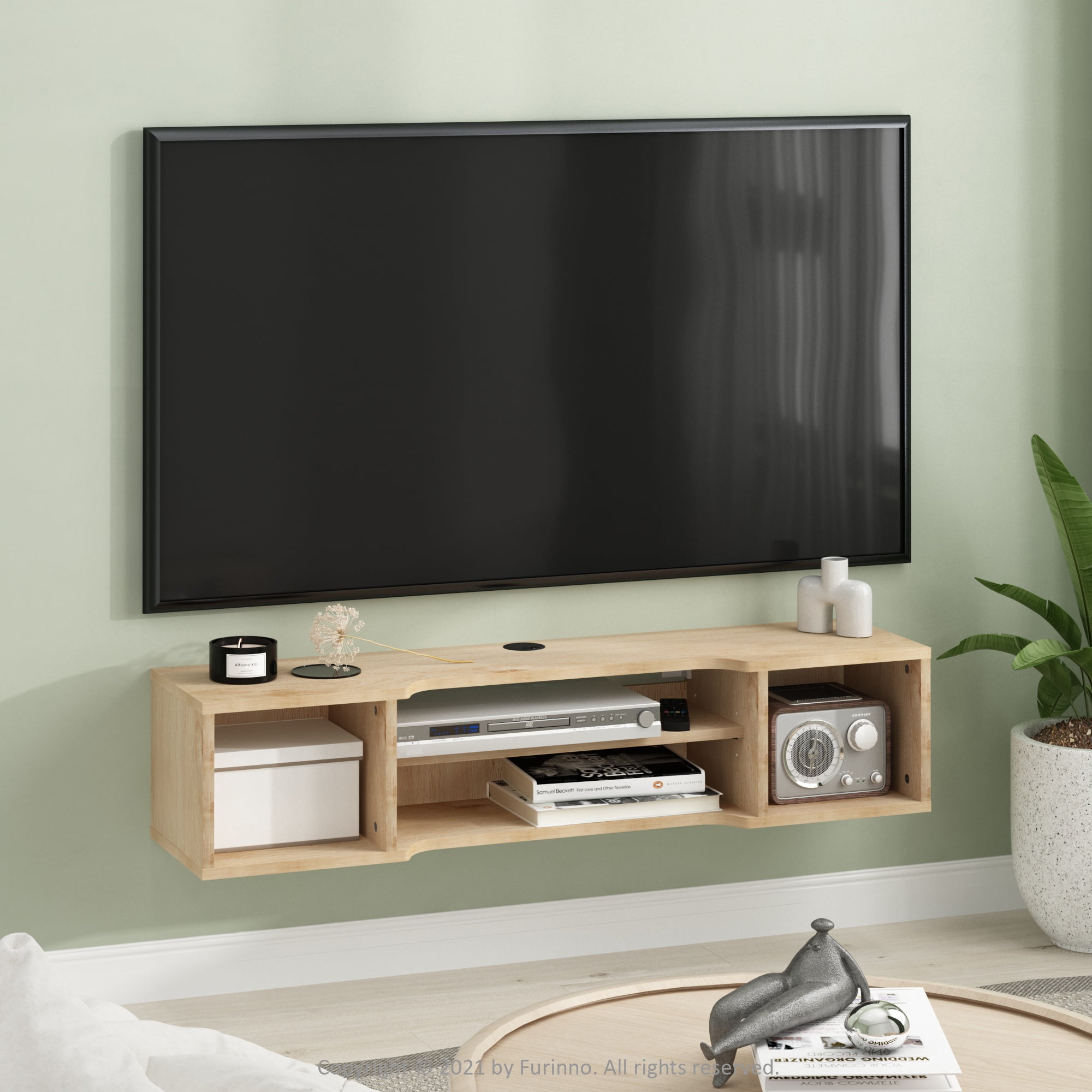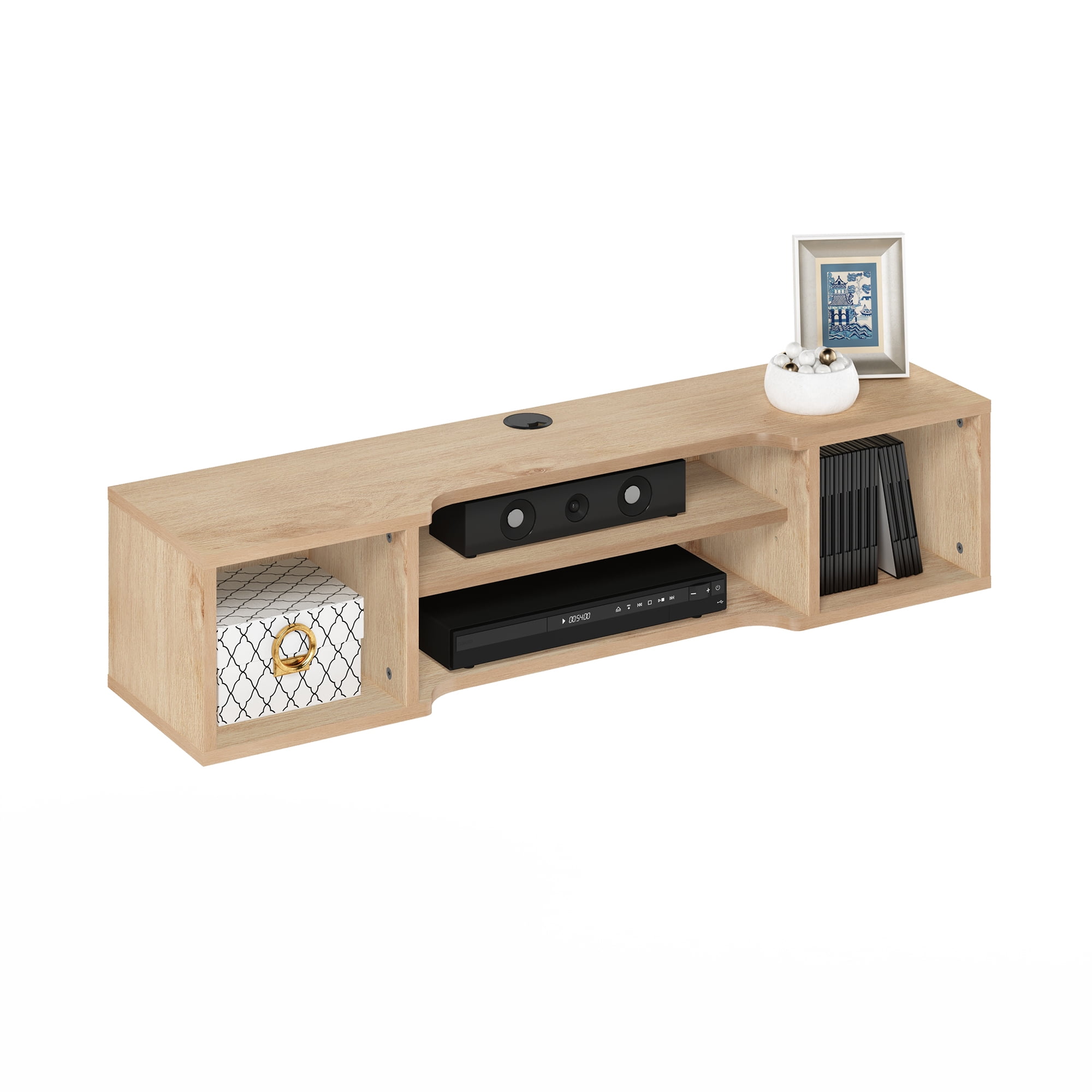 Furinno Indo Wall Mounted Floating Media Console features a minimalist and sleek design which fits in almost all types of room decoration. This wall mount design is perfect for small spaces by free up valuable floor space. The open shelves allow you to display your devices such as game console, DVD players, projector, etc. Cable management holes to keep all the cables and wires neatly organized. Care instruction: wipe clean with clean damped cloth and avoid using harsh chemical to prevent damage to the furniture. All the pictures are for illustration purposes only; decor items are not included in this offer