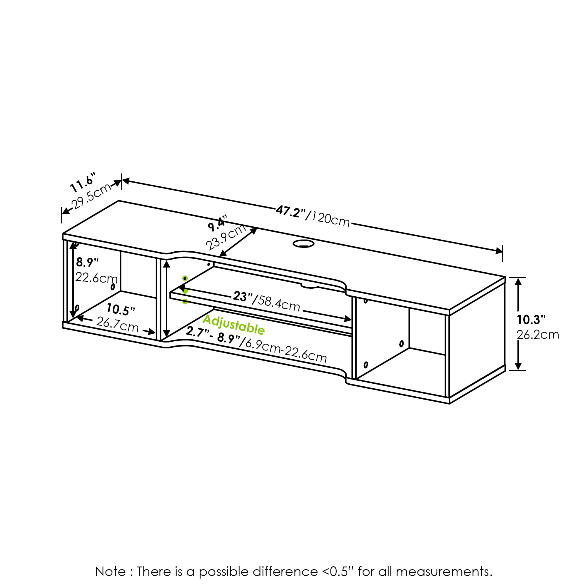 Cable holes for hiding messy cables, keeping your living space neatly organized. Saving valuable floor space. Manufactured from durable CARB Grade composite wood. Product dimension: 47.3(W)x7.6(H)x9.8(D) in.