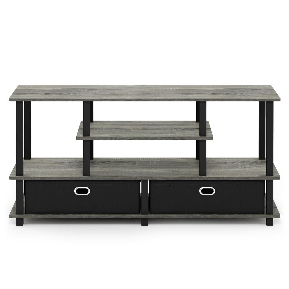 Material: CARB grade composite wood, PVC tubes, engineered wood Finish: French oak gray, black Simple stylish design. Large top panel holds up to 55-Inch flat screen TV. Non-woven storage bins provide a hidden storage space to keep loose stuff such as DVDs, Games and CDs. Easy to assemble. Assembly manual and hardware pack included. Rounded edge design prevents children from potential injuries.