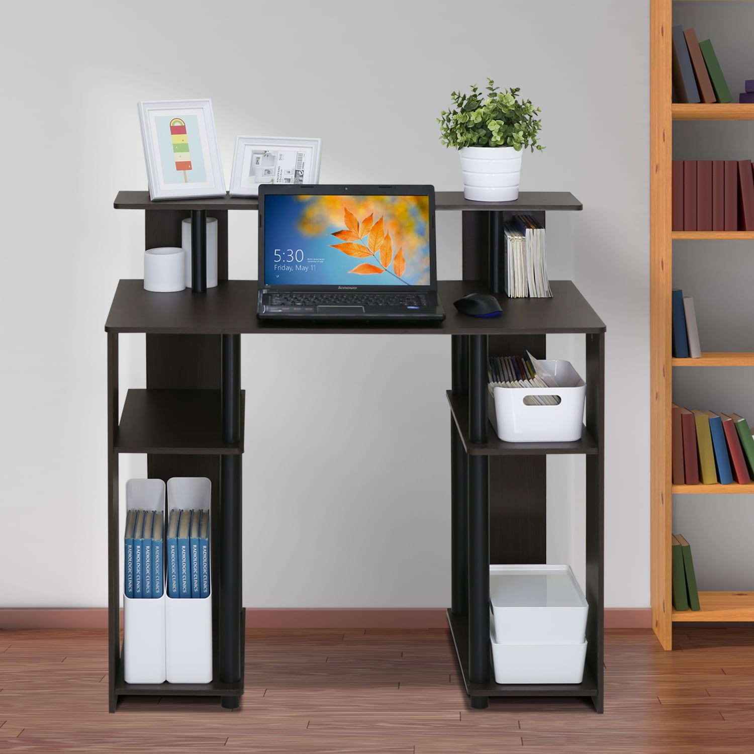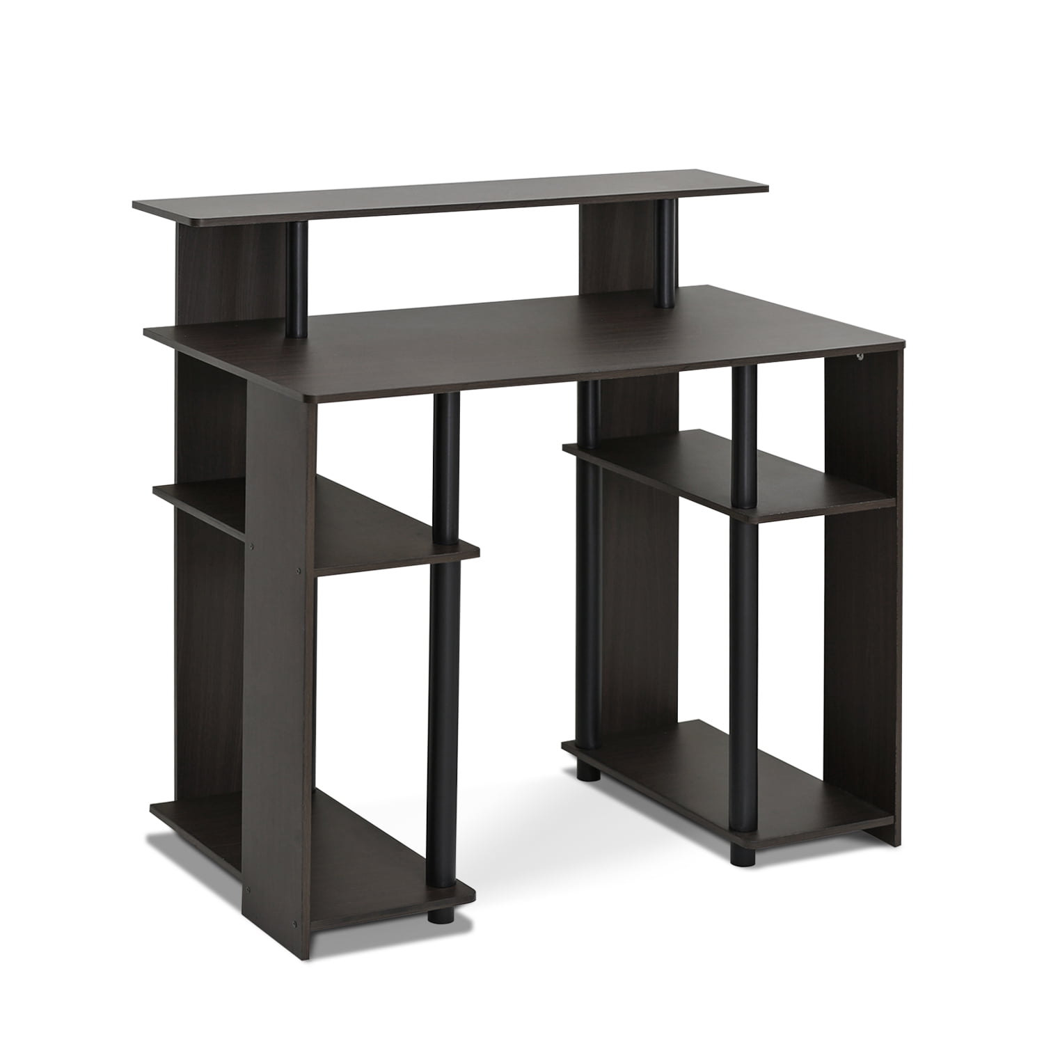 Material: CARB grade composite wood, PVC tubes, engineered wood Finish: Walnut, black Simple stylish design features shelves on both sides for CPU and books, elevated shelf for a compact printer or other stationery decor. Fits in your space, fits on your budget. Suitable for any room that has limited space for a computer Sturdy on flat surface. Some assembly required. Please see instruction.