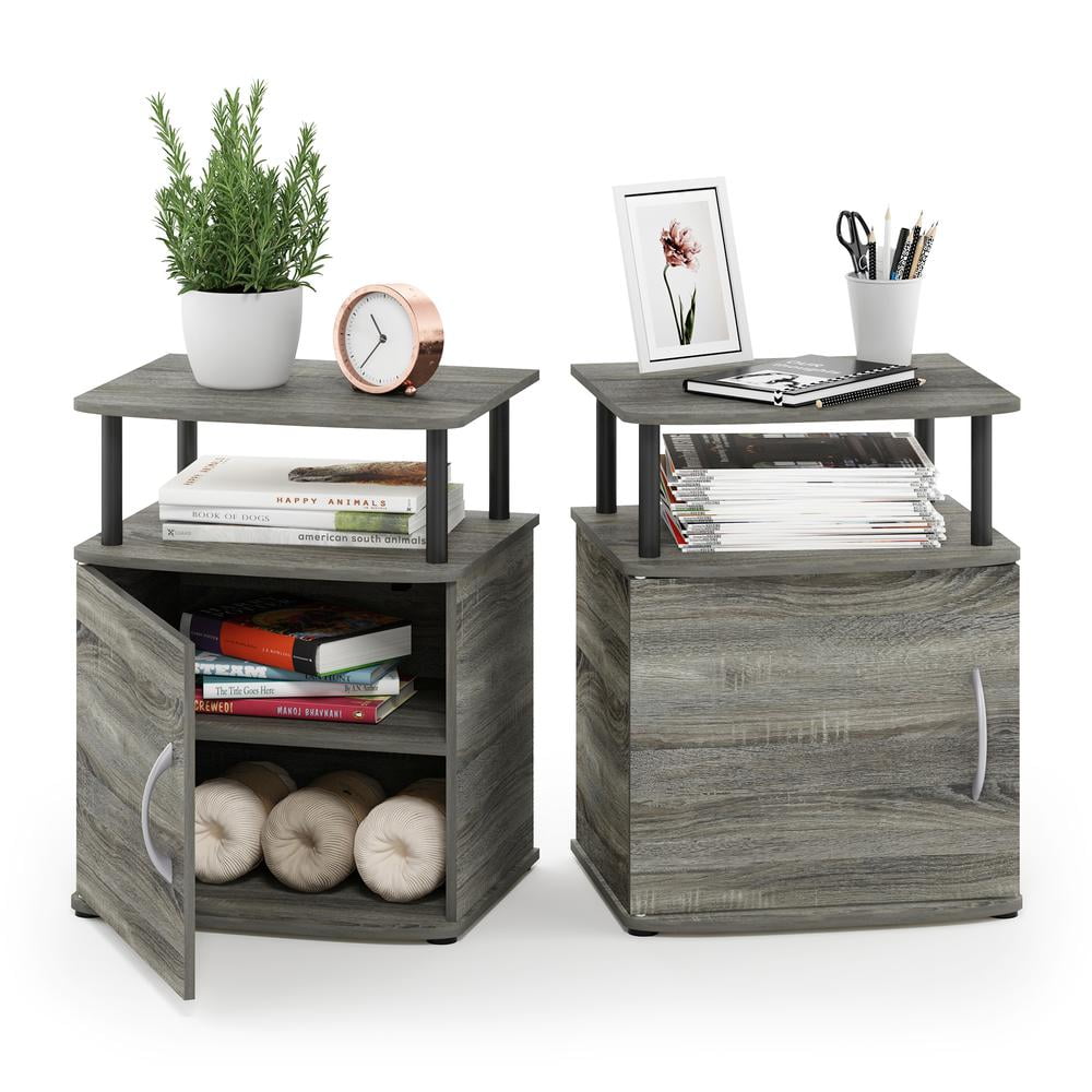 Material: CARB grade composite wood, PVC tubes, engineered wood Finish: French oak gray, black Simple stylish design. Features open display shelf and closed storage compartment. Fits in your space, fits on your budget. Suitable and multi-functional for any rooms. Sturdy on flat surface. Some assembly required. Please see instruction. Sold in set of two Rounded edge design prevents children from potential injuries.