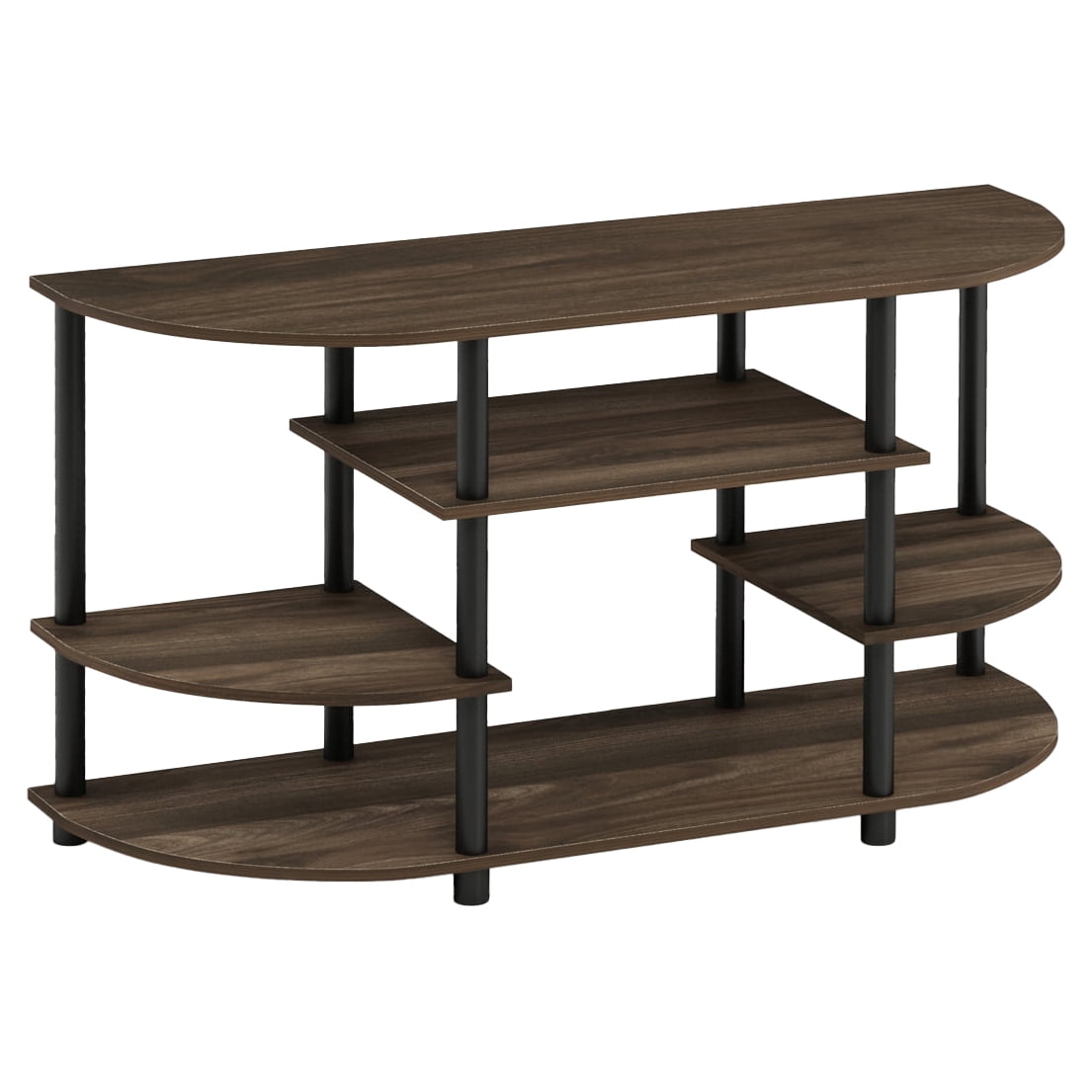 Furinno JAYA Simple Design Corner TV Stand features (1) Unique Structure: Open display shelves provide easy storage and display of TV and other entertainment accessories. Suitable for any rooms. Designed to meet the demand of low cost but durable and efficient furniture. It is proven to be the most popular RTA furniture due to its functionality, price, and the no hassle assembly. (2) Smart Design: Easy Assembly and No tools required. A smart design that uses durable recycled PVC tubes and engineered medium density composite wood that withstand heavy weight. Just repeat the twist, turn and stack mechanism, and the whole unit can be assembled within 10 minutes. Experience the fun of D-I-Y even with your kids. (3) The CARB Grade medium density composite wood is manufactured in Malaysia and comply with the green rules of production. There is no foul smell, durable and the material is the most stable amongst the particle boards. The PVC tube is made from recycled plastic and is tested for its durability. A simple attitude towards lifestyle is reflected directly on the design of Furinno Furniture, creating a trend of simply nature. All the products are produced and assembled 100-percent in Malaysia with 95% – 100% recycled materials. Care instructions: Wipe clean with clean damped cloth. Avoid using harsh chemicals. Pictures are for illustration purpose. Features: Material: Engineered wood Finish: Columbia walnut, black SIMPLE STYLISH DESIGN: Unique open shelf design with plastic tubes. Holds TV up to 46 inch with right base. QUALITY MATERIAL: Manufactured from high quality durable composite wood and plastic tubes. EASY ASSEMBLY: No tools are needed, just twist the tubes FURINNO FITS: Fits in your space, fits on your budget Specifications: Product Dimensions: 22.75″H x 42.04″W x 15.55″D Product Weight: 28.96 lbs