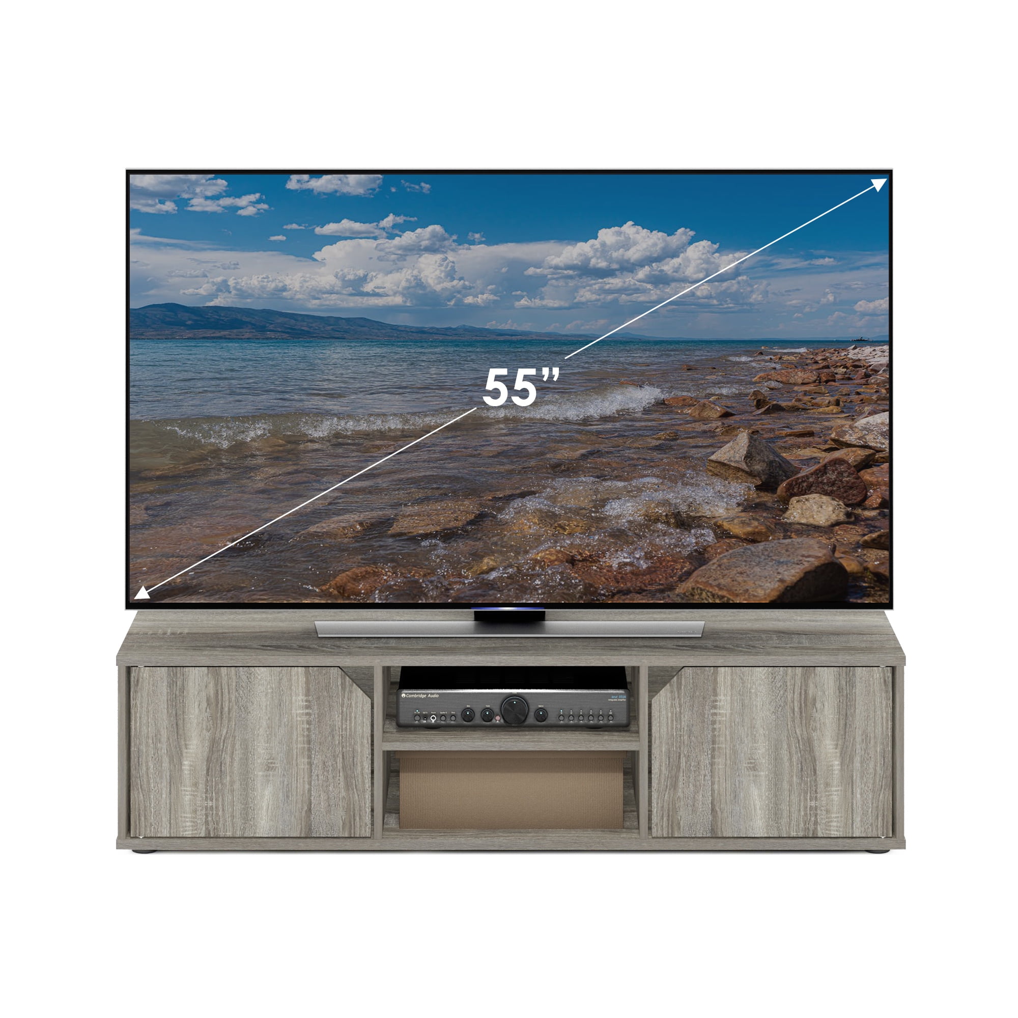 Simple and modern looking centerpieces with compartments are great for display and storage of entertainment equipment. Manufactured from CARB Grade composite wood. Large top panel which holds up to 55-Inch flat screen TV. Hold up to 60 lbs. Weight capacity of 10 pounds on each shelf. Features two doors with a weight capacity of 20 lbs on each compartment to avoid clutter. Product Dimensions: 15.8 (D) x 47.2 (W) x 12.2 (H) Inches