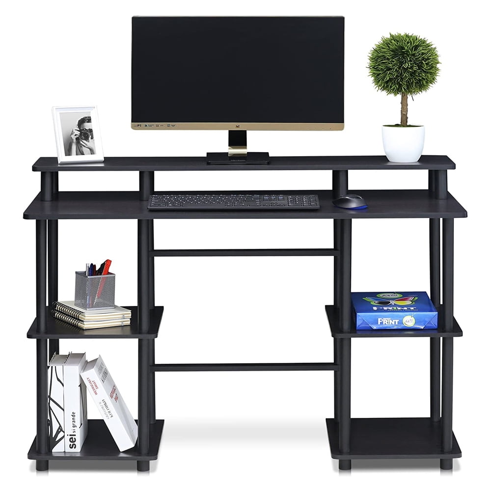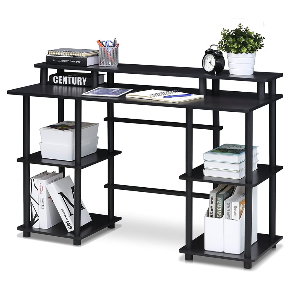 Home office desk features 4 storage shelves and a top shelf for a computer monitor or other supplies Provides plenty of space and is suitable for your study, home office, work, libraries, and bedroom Main parts of Furinno products are constructed from particleboard that is made from recycled materials from rubber trees, recyclable PVC tubes, and non-woven bits that are all environmentally friendly Desktop structure is very sturdy and firm and has a 17.6 weight capacity Measures 18.8 inches deep, 44.5 inches wide, and 33.9 inches tall Material: Particleboard Color: Espresso Dimensions (D x W x H): 18.9 x 44.5 x 33.9 inches Weight: 33 pounds Manufacturer warranty: 1-year warranty
