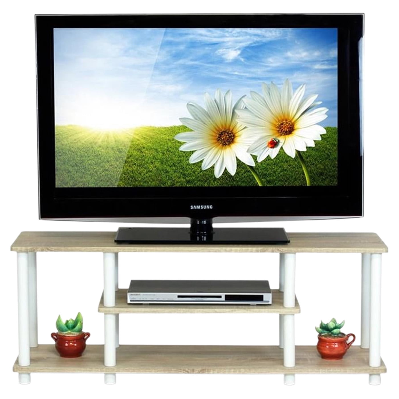 Material: 15mm composite wood, 30gm 3D MDF lamination, 34mm plastic pole, engineered wood Finish: Oak, white Simple stylish design yet functional and suitable for any room. Fits in your space, fits on your budget. Sturdy on flat surface 10-minutes no tools no hassles assembly. Holds up to 50″ Flat Screen Panel and up to 40 lbs with right TV base. Rounded edge design prevents potential injuries.