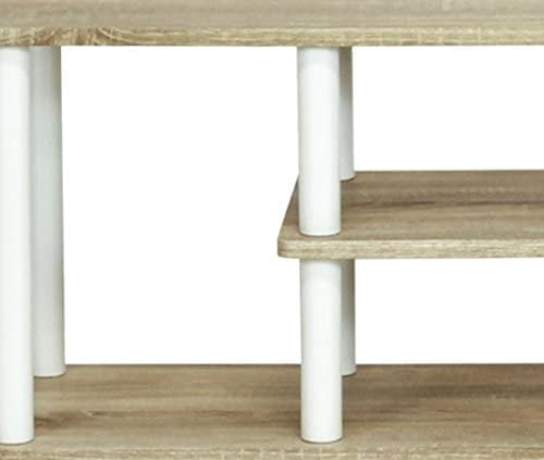Furinno Turn-N-Tube Series: No Tools Entertainment TV Stand.(1) Unique Structure: Open display rack, shelves provide easy storage and display of TV or other audio/video accessories. Suitable for any rooms. Designed to meet the demand of low cost but durable and efficient furniture. It is proven to be the most popular RTA furniture due to its functionality, price, and the no hassle assembly. (2) Smart Design: Easy Assembly and No tools required. A smart design that uses durable recycled PVC tubes and engineered medium density composite wood that withstand heavy weight. Just repeat the twist, turn and stack mechanism, and the whole unit can be assembled within 10 minutes. Experience the fun of D-I-Y even with your kids. (3) The medium density composite wood is manufactured in Malaysia and comply with the green rules of production. It is made from 15mm Composite Wood with 30gm 3D MDF Lamination and 34mm plastic pole. There is no foul smell, durable and the material is the most stable amongst the medium density composite woods. The PVC tube is made from recycled plastic and is tested for its durability. A simple attitude towards lifestyle is reflected directly on the design of Furinno Furniture, creating a trend of simply nature. All the products are produced and assembled 100-percent in Malaysia with 95% – 100% recycled materials. Care instructions: Wipe clean with clean damped cloth. Avoid using harsh chemicals. Pictures are for illustration purpose. Features: Material: 15mm composite wood, 30gm 3D MDF lamination, 34mm plastic pole, engineered wood Finish: Oak, white Simple stylish design yet functional and suitable for any room. Fits in your space, fits on your budget. Sturdy on flat surface 10-minutes no tools no hassles assembly. Holds up to 50″ Flat Screen Panel and up to 40 lbs with right TV base. Rounded edge design prevents potential injuries. Specifications: Product Dimensions: 16.2″H x 43.8″W x 11.7″D Product Weight: 20 lbs