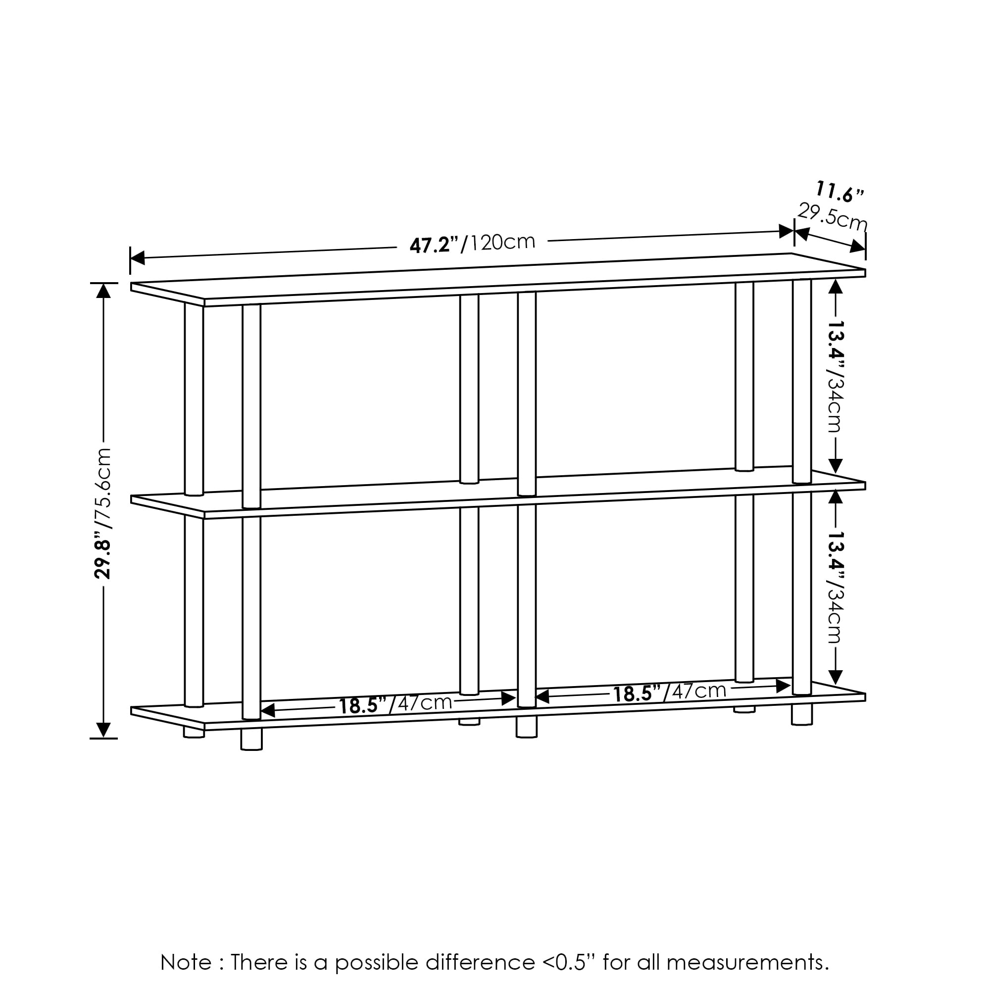 This modern and minimalist design shelf is a perfect fit for any room design Features 3 tiers to meet your storage and display needs Manufactured from CARB Grade composite wood The top and middle panels hold up to 15 lbs; the bottom holds up to 25 lbs Assembly is easy with instruction and hardware pack included Product Dimension: 47.2 (W) x 29.8 (H) x 11.6 (D) Inches