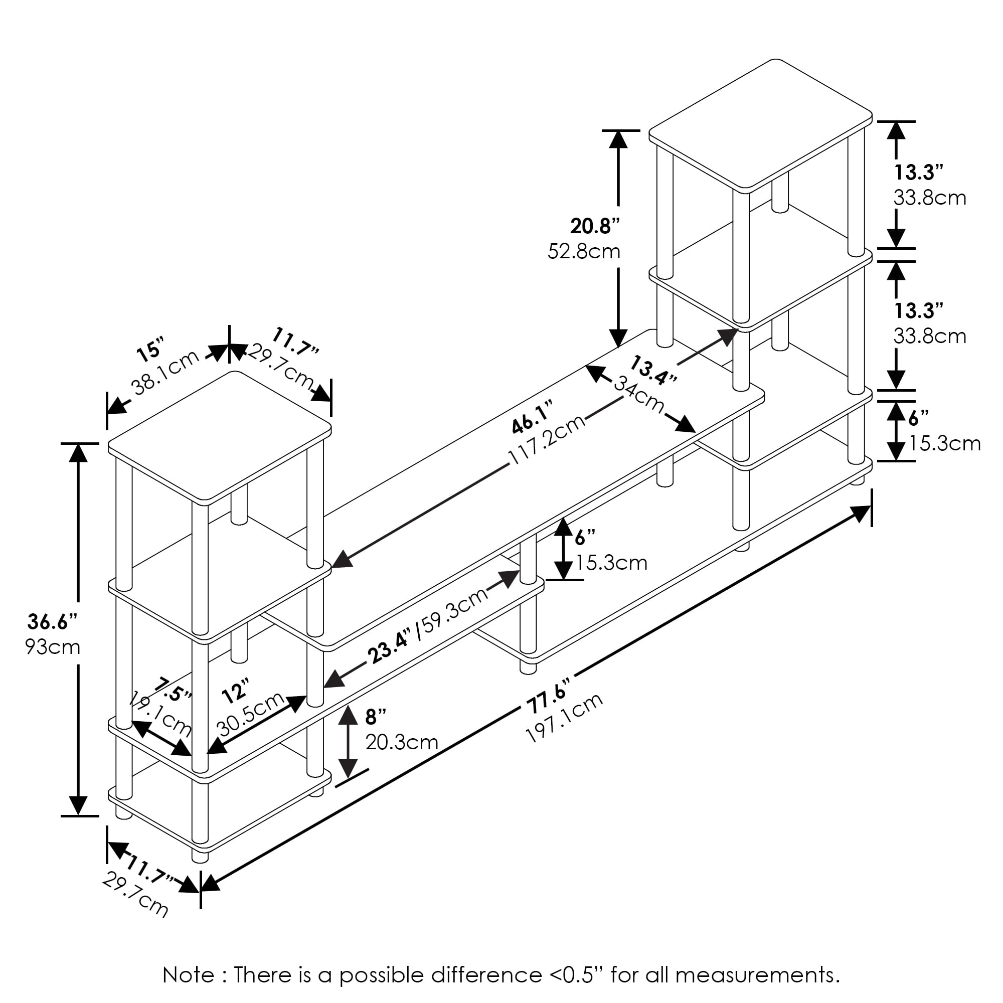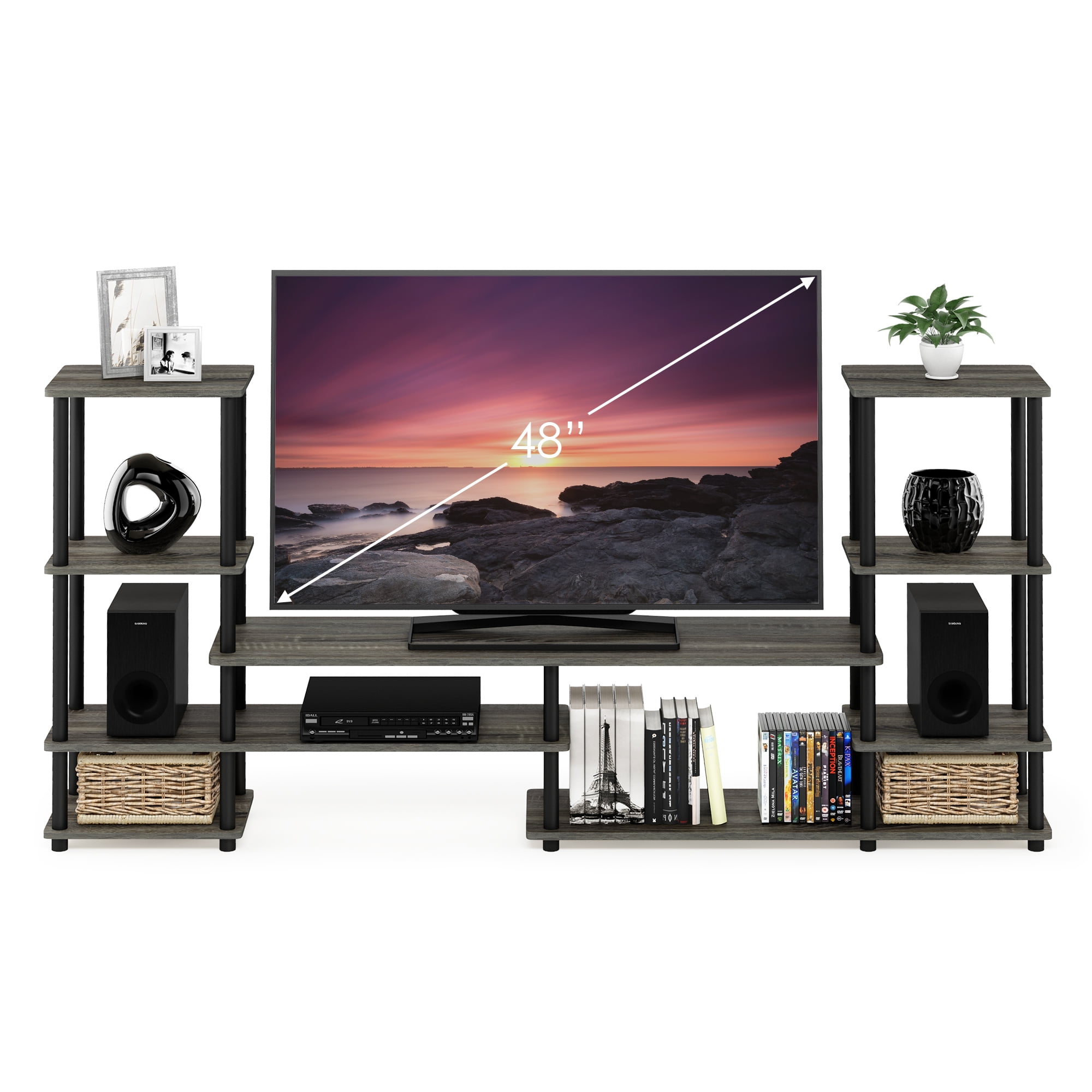 Furinno Turn-N-Tube Grand Entertainment Center is not simply just an entertainment center; it can also be used as a multipurpose rack, a display rack or even a shoe rack. The entertainment center has several racks and shelves to hold your loose stuffs or decorations. It has simple and clean style that can match most home. It is made of particle boards and round poles. It may seem to have many parts to put together but it is very simple and easy. Just follow the instruction of turning and twisting poles against the boards. All the parts are tested for durability and strength. Care instruction: Wipe clean with clean damped cloth and avoid using harsh chemical to prevent damage to the furniture. All the pictures are for illustration purposes only; decor items are not included in the set. Features: Material: Engineered wood Finish: French oak gray Multipurpose entertainment center that hold up to 50-inch TV Comes with two color options: Espresso and French Oak Gray Made of particle boards and PVC poles; manufactured in Malaysia Assembly is easy, just turn and twist the poles against the boards. Specifications: Product Dimensions: 36.6″H x 77.6″W x 11.7″D Product Weight: 46.2 lbs Weight Capacity: (Center top panel) 30 lbs; (Top panel) 10 lbs; (Shelf panel) 15 lbs