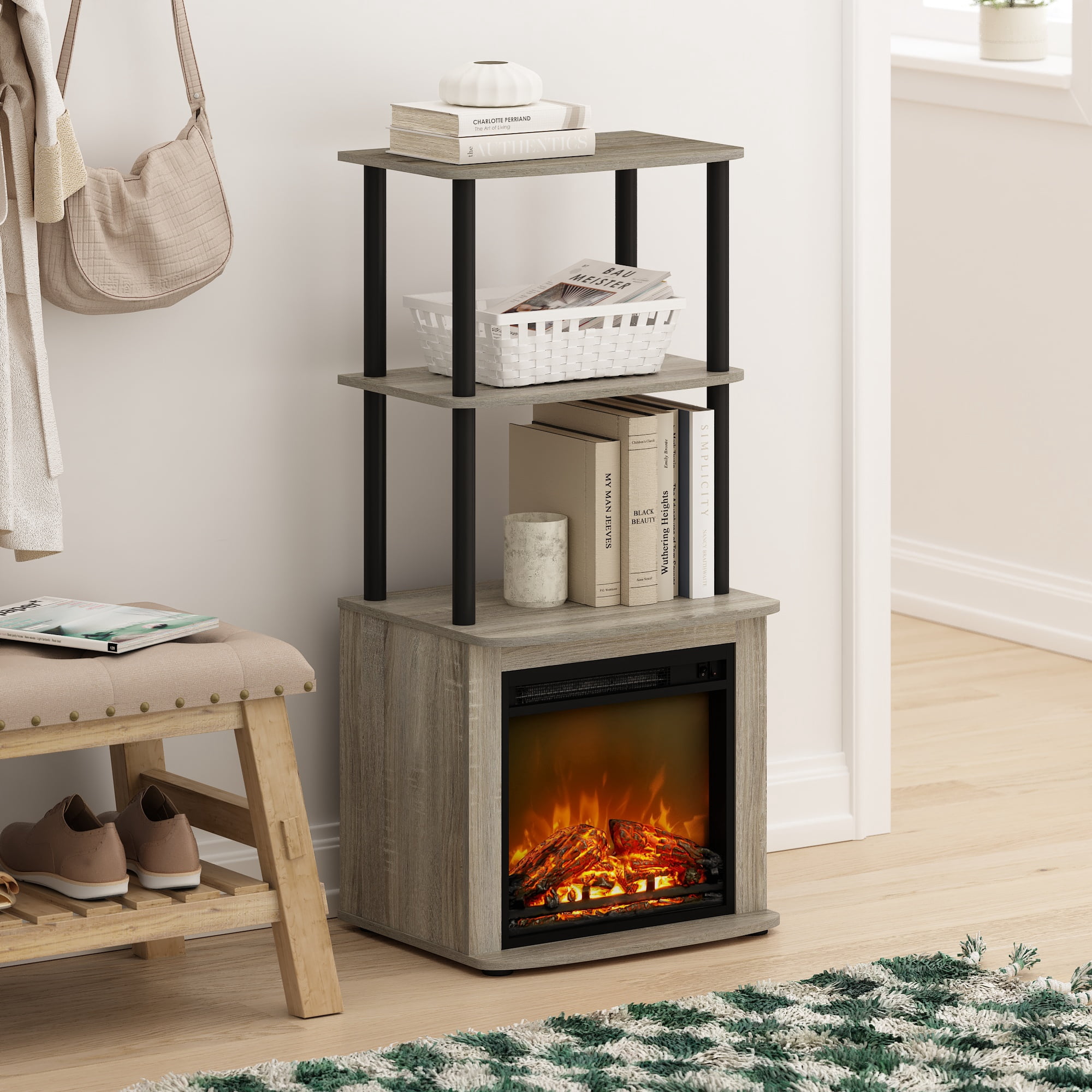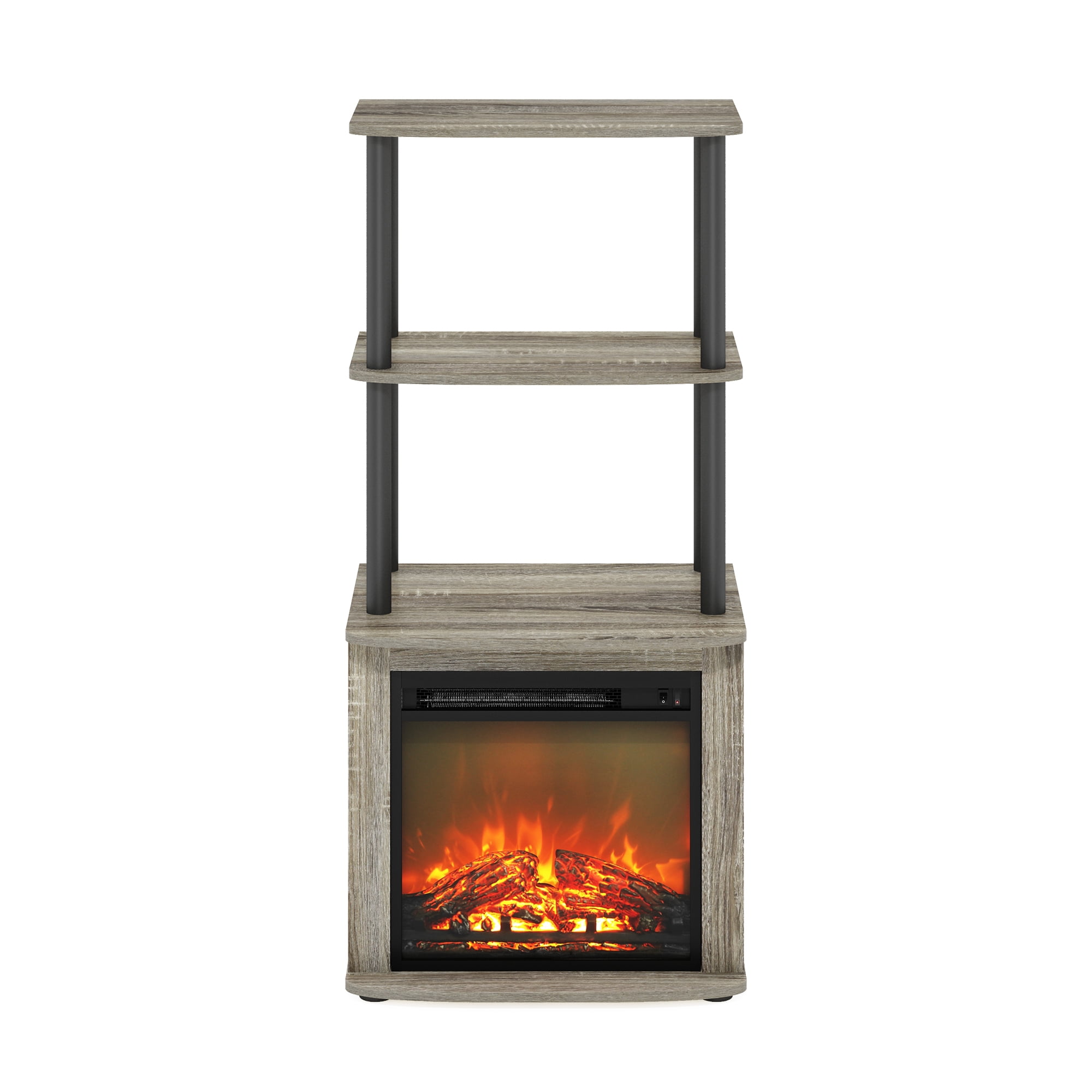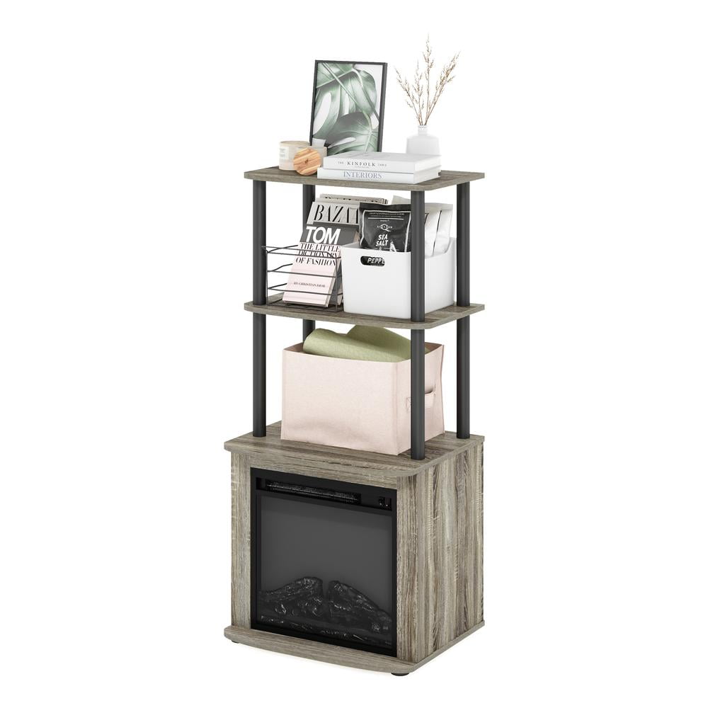 TV Entertainment Side Table Display Rack with Fireplace Insert The Furinno Turn-N-Tube 2-Tier Tall TV Entertainment Side Table Display Rack is an innovative and space-saving solution for your entertainment needs. It includes a unique fireplace insert, adding warmth and a relaxing ambiance to your living area. This multifunctional piece features two spacious tiers for decorative items and storage, all while its compact design makes it ideal for small spaces, blending functionality with contemporary style.The side table is made of CARB-grade composite wood tested for durability and sturdiness. Assembly is easy with provided step-by-step instructions. Care instructions: wipe clean with a clean damped cloth. Avoid using harsh chemicals. Pictures are for illustration purposes. All decor items are not included in this offer. The product is entitled to a 1-year warranty against manufacturer defects. Fits Space,Fits Budget. The sleek and simple design provides a contemporary look, while the electric fireplace adds a cozy ambiance, suitable for a variety of room settings. Two open shelves provide ample storage for storing media devices, books, or decorative items. Includes electric fireplace insert (no remote), heats up to 400 sq. ft. (4600 BTU). Individual switch for fireplace display and heat. Manufactured from high-quality durable composite wood, CARB-compliant composite wood carrying the Programme for the Endorsement of Forest Certification (PEFC) and PVC tube. . Product Dimensions: 14.8 (D) x 18.66 (W) x 40.43 (H) inches – Number of Pieces: 1 – Item Depth: 14.8 – Item Height: 40.43 – Item Width: 18.66 – Item Weight: 31.02 – Item Color: Multi – Item Material: Wood/Metal – Vendor Color: French Oak Grey/Black
