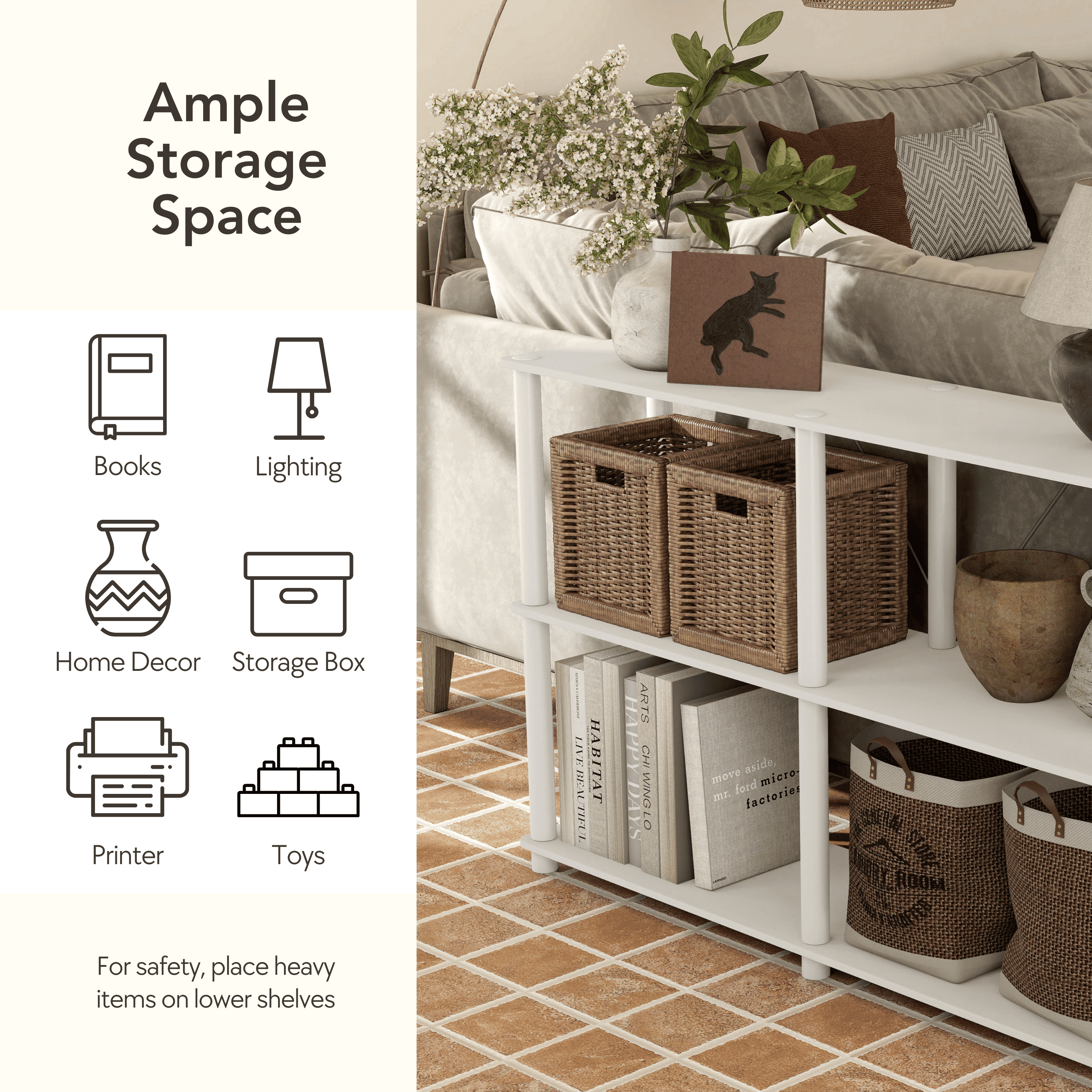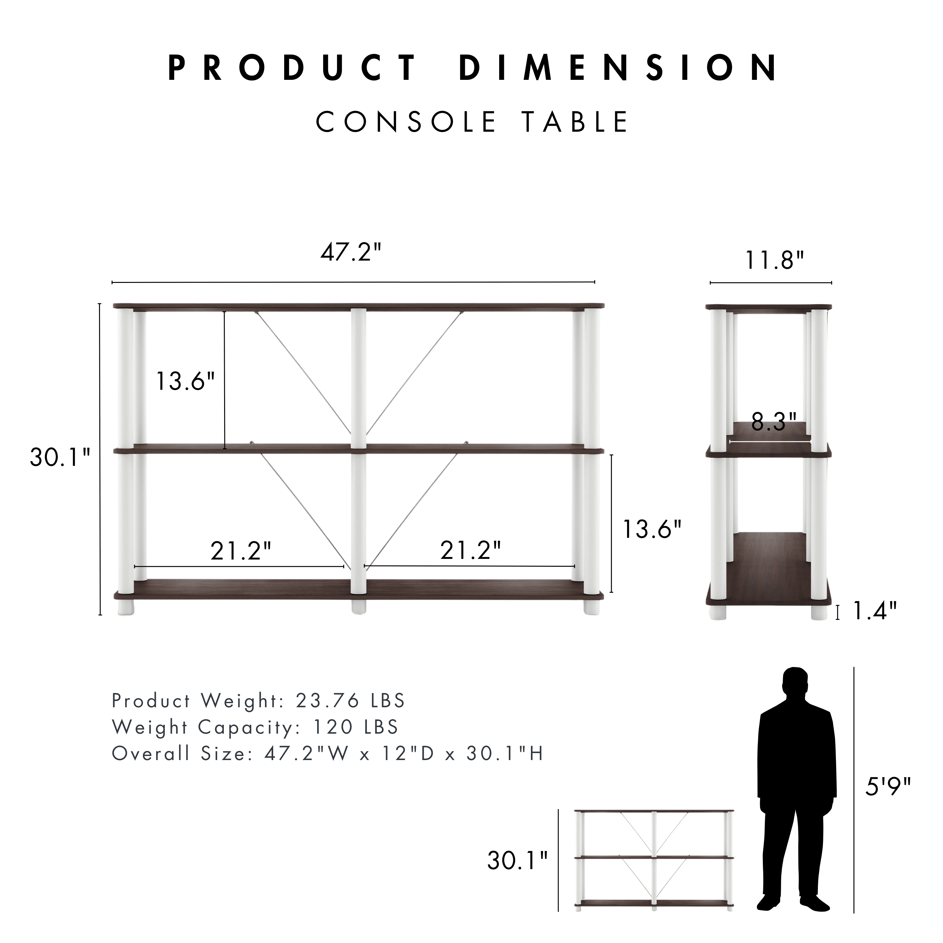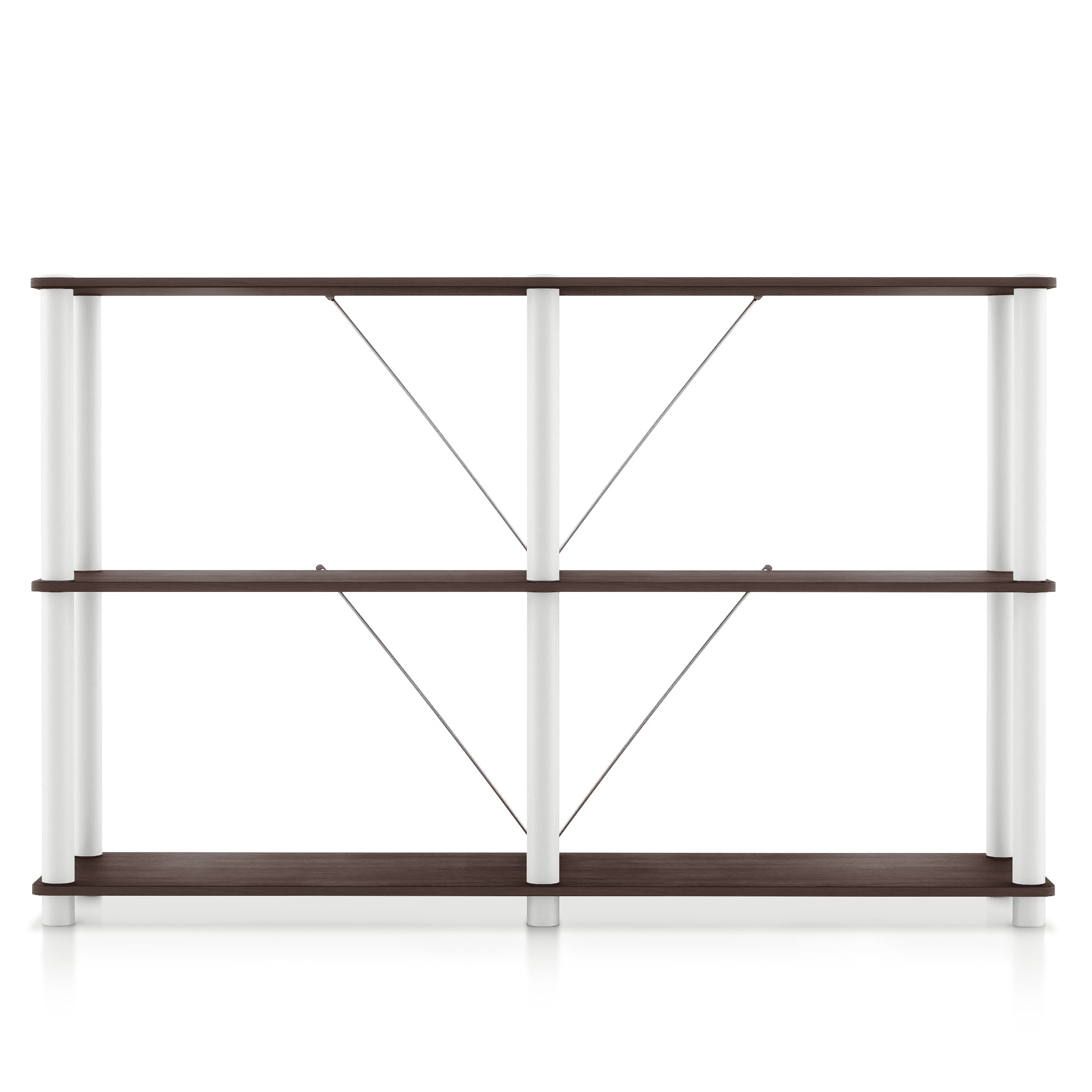 Shop the entire Brooks Collection EMBRACE STORAGE SERENITY: Say hello to neatness and style with our open cube storage shelves. Perfect for both spacious and limited areas, they redefine storage efficiency, inviting order and calm into every corner. IDEAL FOR STANDARD CUBE BINS: Tailored to accommodate 11 x 11 x 11-inch cube bins, these shelves are a snug haven for your beloved novels, important files, and much more. Organize your space with unparalleled ease and watch flexibility meet perfect functionality. HASSLE-FREE ASSEMBLY: Our straightforward, no-fuss assembly means you’ll have these shelves up in no time. They’re not just for homes; these shelves are also perfect for studios, dorms, and offices, bringing about an organized transformation wherever placed. SLEEK DESIGN, SEAMLESS FIT: Crafted with modern minimalism at the helm, our storage shelves blend effortlessly with any interior design, ensuring a match made in organizational heaven. Furniture of America Brooks Open Display Bookcase, 3-Tier 47-inch Console Table Includes: One (1) Open Display Shelf Style: Modern Materials: Plastic, Iron, Particle Board A standard 11x11x11 inch storage bin can be used for your storage needs Quick and easy setup with the included assembly guide Ships in 1 box Color and Finish: Espresso Shelves with White Tubes Dimensions and Weights Overall dimensions: 47.24″W x 12″D x 30.11″H Weight capacity: 120 lbs. Product weight: 23.76 lbs.