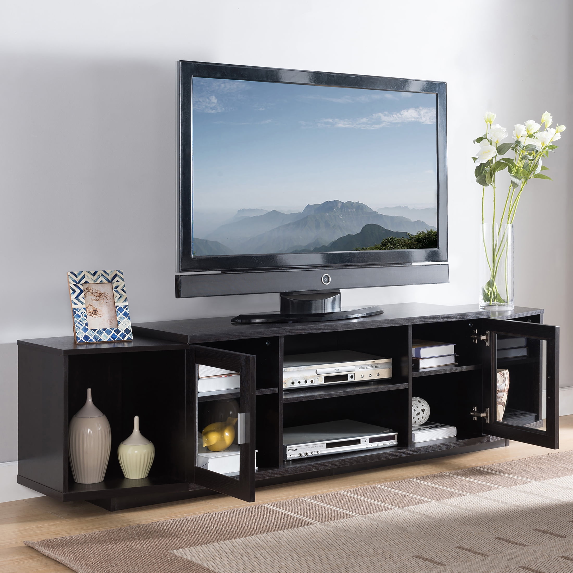 Furniture of America Daytona TV Stand for TVs up to 80″, Cappuccino Includes: One (1) TV Stand Style: Contemporary Materials: MDF, Particle Board CONVENIENT CABLE MANAGEMENT – 3 cut-out holes in the back for cable placement Two (2) spacious cabinets with 2 shelves within each Four (4) open shelves Sturdy wooden construction Easy to follow step by step assembly guide included Ships in 1 box Color and Finish: Cappuccino Dimensions & Weights: Overall Dimensions: 72″W x 15.5″D x 19.25″H Weight Capacity: 150 lbs. Product weight: 76 lbs. Click here to view the assembly guide