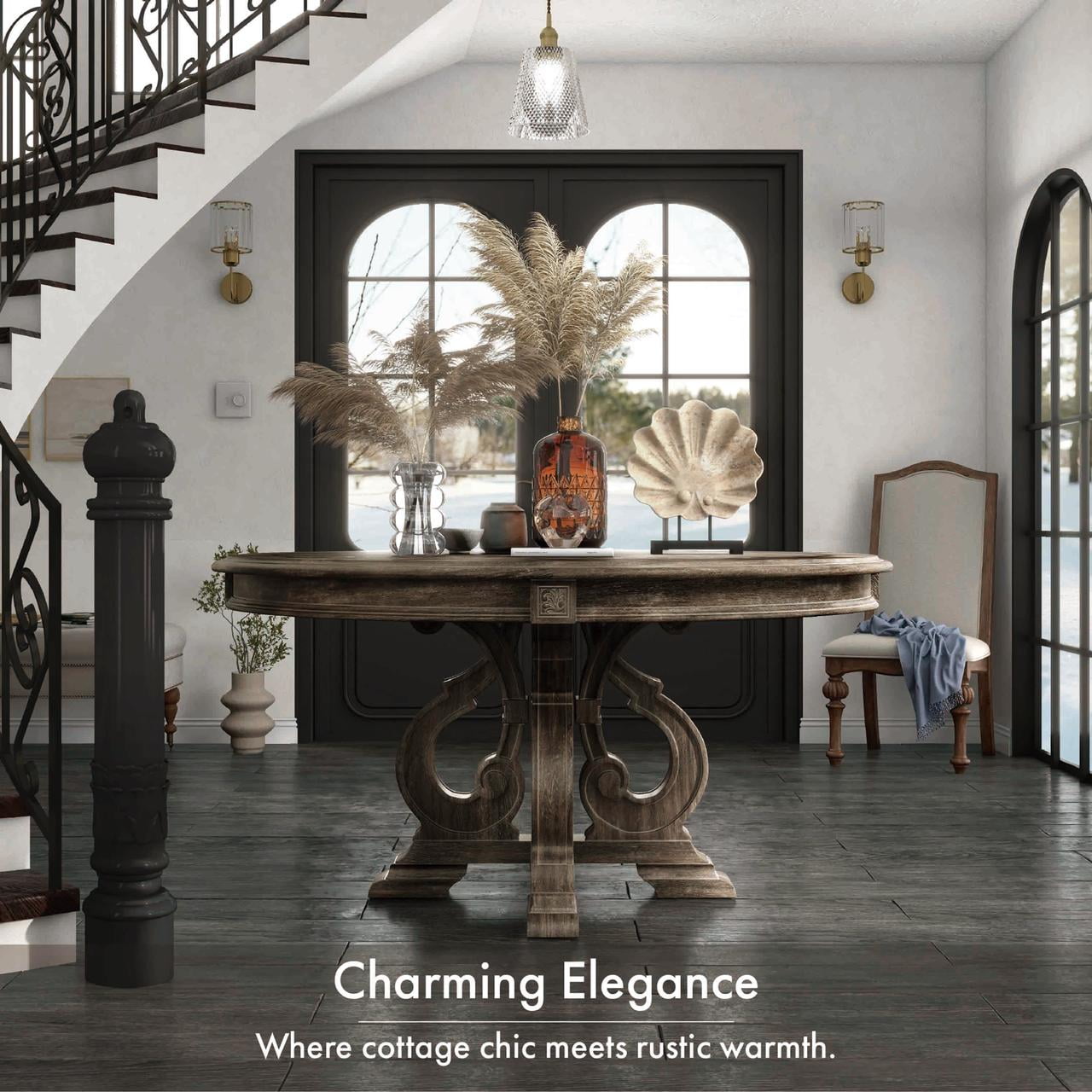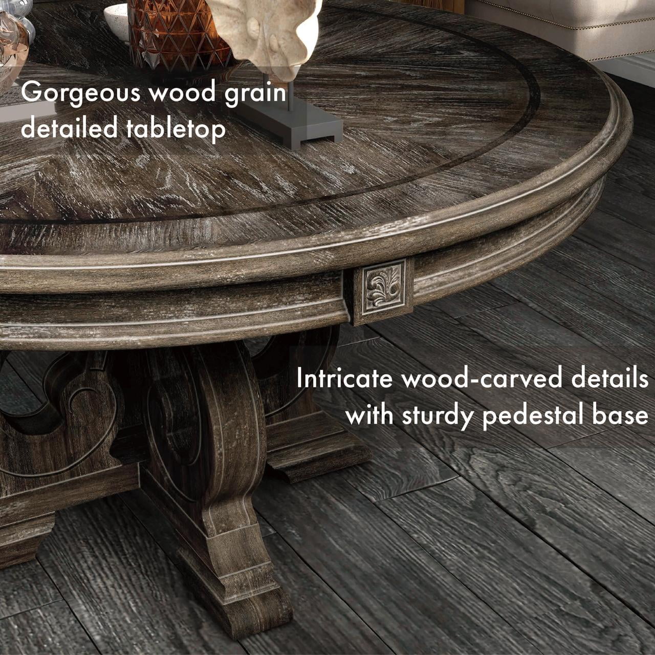 Furniture of America Ethelyn Wood Pedestal Dining Table, Natural Tone Includes: One (1) Round Dining Table Style: Rustic Material: Solid Wood, Wood Veneer Round table shape Pedestal base Uniquely carved wood details and scrolled base Assembly required Ships in 1 box Color and Finish: Rustic Natural Tone finish Dimensions & Weights: Overall dimensions: 60″L x 60″W x 30.5″H Weight capacity: 80 lbs. Product weight: 149 lbs. Click here to view the assembly guide