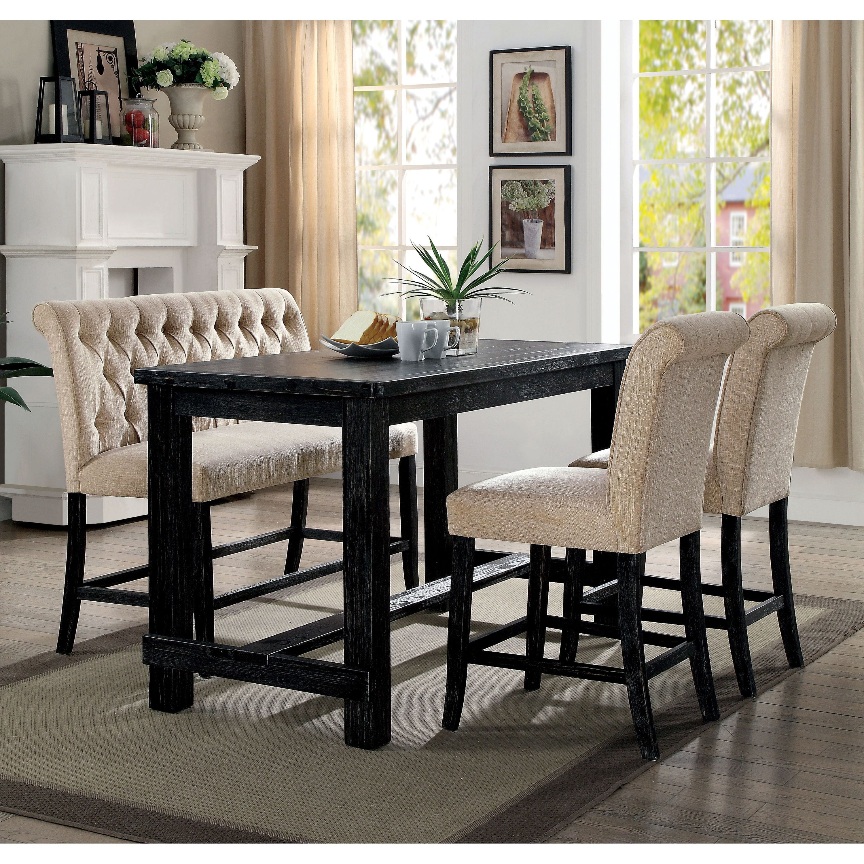 Perfectly suited for a farmhouse style cabin or French country dining room, this rustic Counter Table from the Freiden collection offers an elegant yet casual design. With a distressed, antique black finish, this dining table is sure to add an air of sophistication to any room. Capable of seating up to four guests, this dining table is fantastic for small homes and apartments.