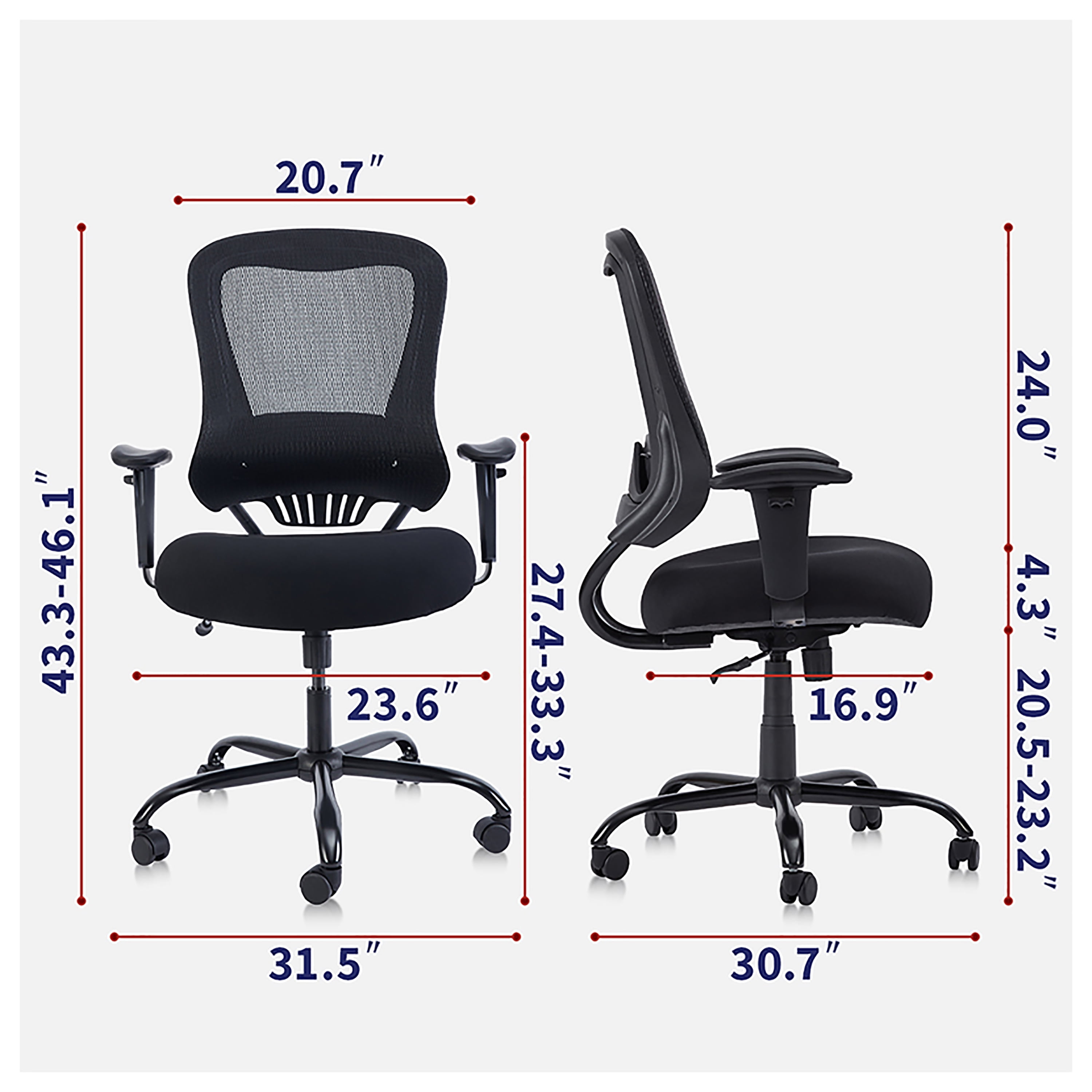 Furniture of America Lulo Ergonomic Mesh Office Chair, Black: Includes: One (1) office chair Style: Modern Finish: Black Materials: Mesh, Metal Convenient adjustable arms Adjustable lumbar support Tilting adjustable backrest Spot wipe and clean Assembly required Ships in 1 box Dimensions & Weights: Overall dimensions: 31.5″ L x 30.7″ W X 43.3 – 46.1″ H Seat width: 23.6″ Seat depth: 16.9″ Seat height: 20.5 – 23.2″ Weight capacity: 350 lbs. Product weight: 45 lbs
