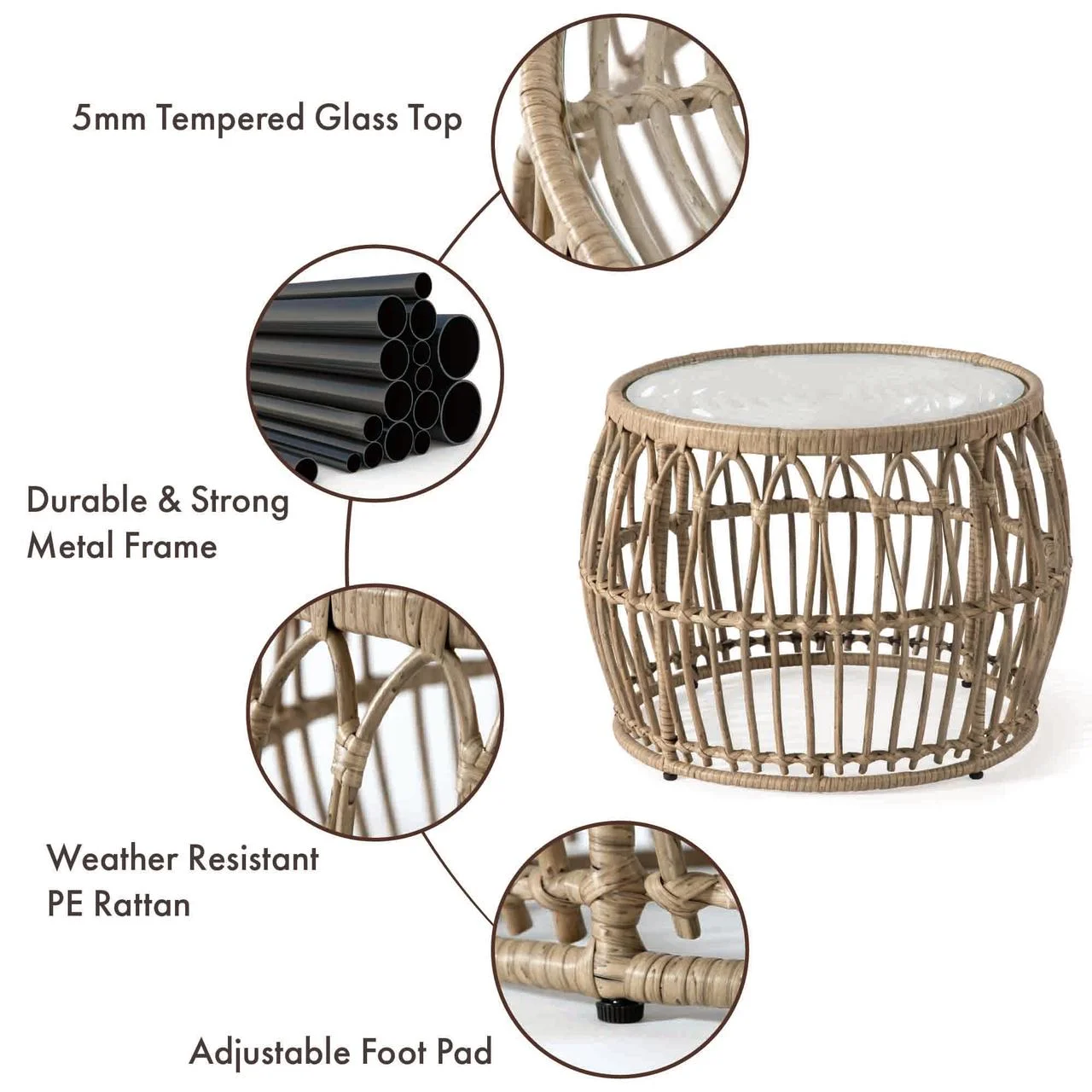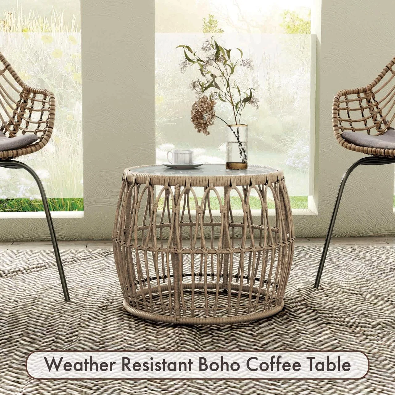 Furniture of America Roja Round Glass Top and Rattan Natural Coffee Table Includes: One (1) Outdoor Coffee Table Style: Coastal Materials: Steel with Powder Coated, Wicker, Tempered Glass PE rattan wicker is a convenient choice for outdoor tables due to its durability and weather resistance, it’s easy to maintain, won’t fade or crack, and provides a stylish yet practical option for your outdoor space, enjoy the convenience of a long-lasting and beautiful outdoor table with PE rattan wicker Steel frame is convenient for an outdoor side table as it provides durability and stability, it’s weather-resistant, won’t rust, and can withstand harsh outdoor conditions, plus, it’s easy to maintain and will last for years to come, making it a great investment for your outdoor space Boho style outdoor side table is beautiful and adds a touch of unique charm to your outdoor decor, with its natural materials, intricate patterns, and vibrant colors, it creates a relaxed and inviting atmosphere in your outdoor space, it’s a perfect addition to any boho-inspired setting Minimal assembly required Ships in 1 box Color and Finish: Natural Dimensions & Weights: Overall Dimensions: 21.65″W x 21.65″D x 15.75″H Weight Capacity: 30 lbs. Product Weight: 16 lbs.Click here to view the assembly guide About Furniture of America Furniture of America® is proud to be the family friend that always has your back. We’re more than just a business. Our customer care team is part of a larger FOA community dedicated to delivering a happy home. So browse our selection and invite warmth and character into every room in your home.