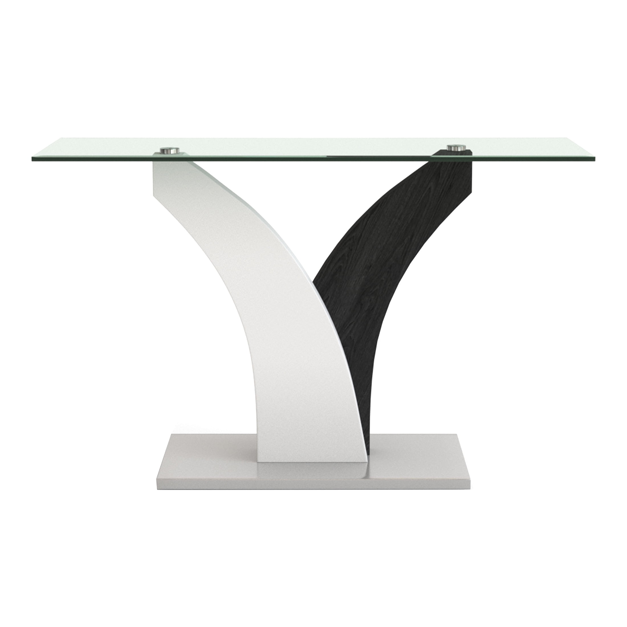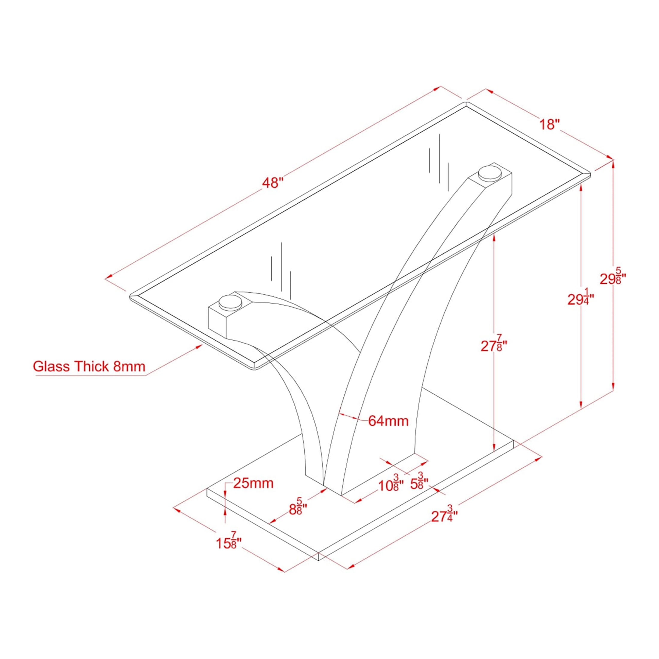 Furniture of America Talon Glass Top Console Table, White Includes: One (1) Console Table Style: Contemporary Materials: Glass, Stainless Steel 8mm tempered and beveled glass tabletop Supported on two tone V-shaped legs Sturdy, reflective steel base Bold and elegant design Easy to follow step by step assembly guide included Ships in 2 box Color and Finish: White, Dark Gray, Chrome Dimensions & Weights: Overall Dimensions: 48″W x 18″D x 29.5″H Weight Capacity: 100 lbs. Product weight: 55 lbs. Click here to view the assembly guide