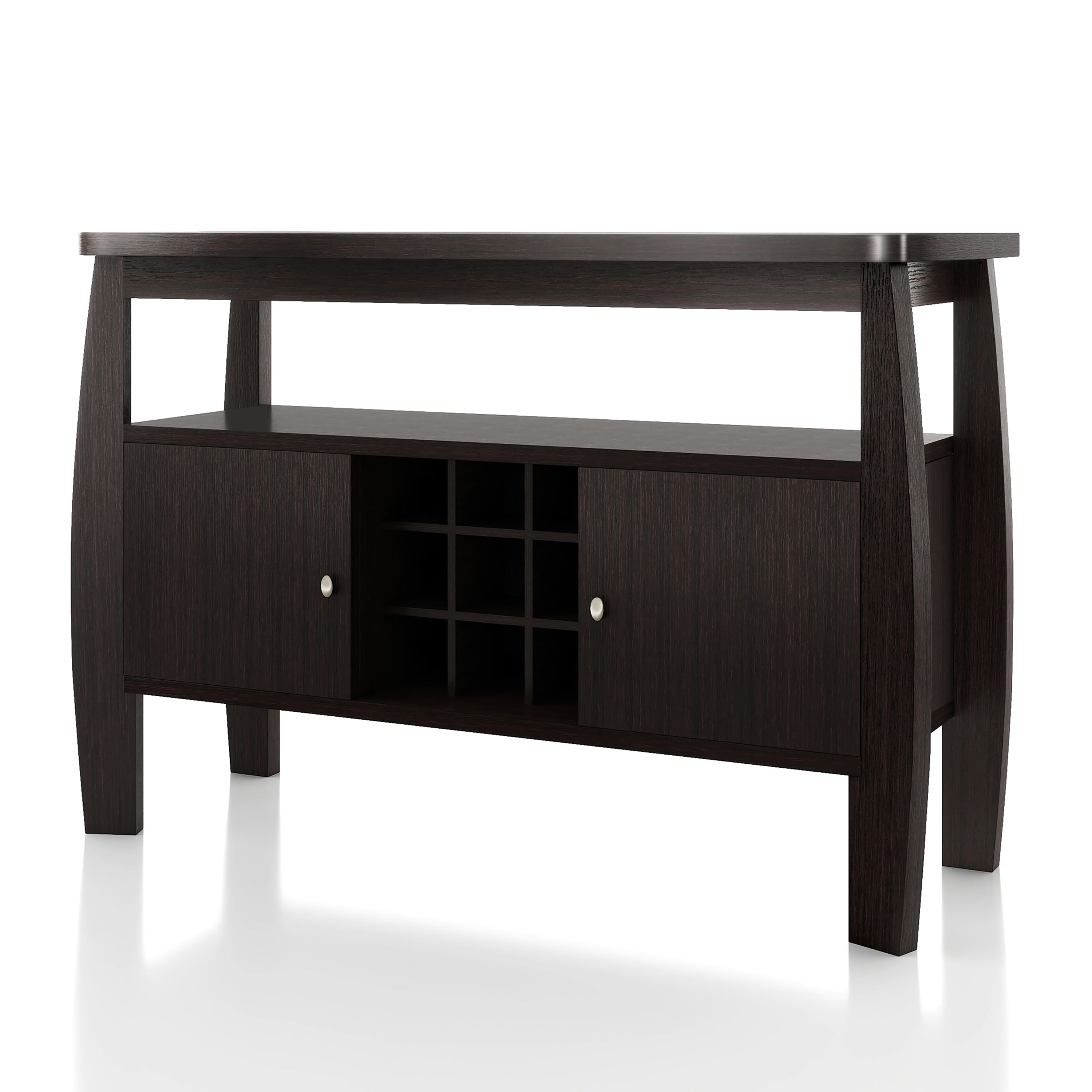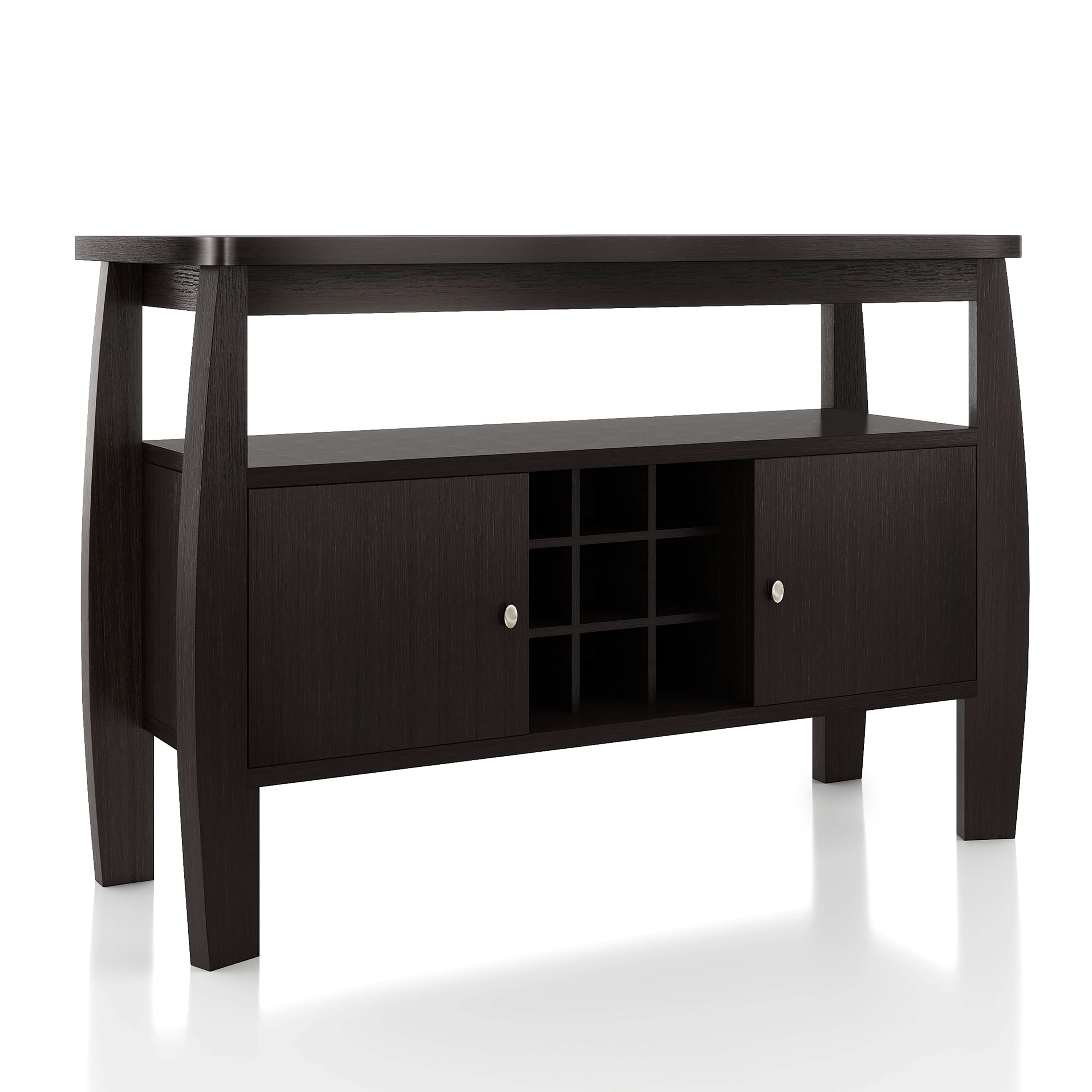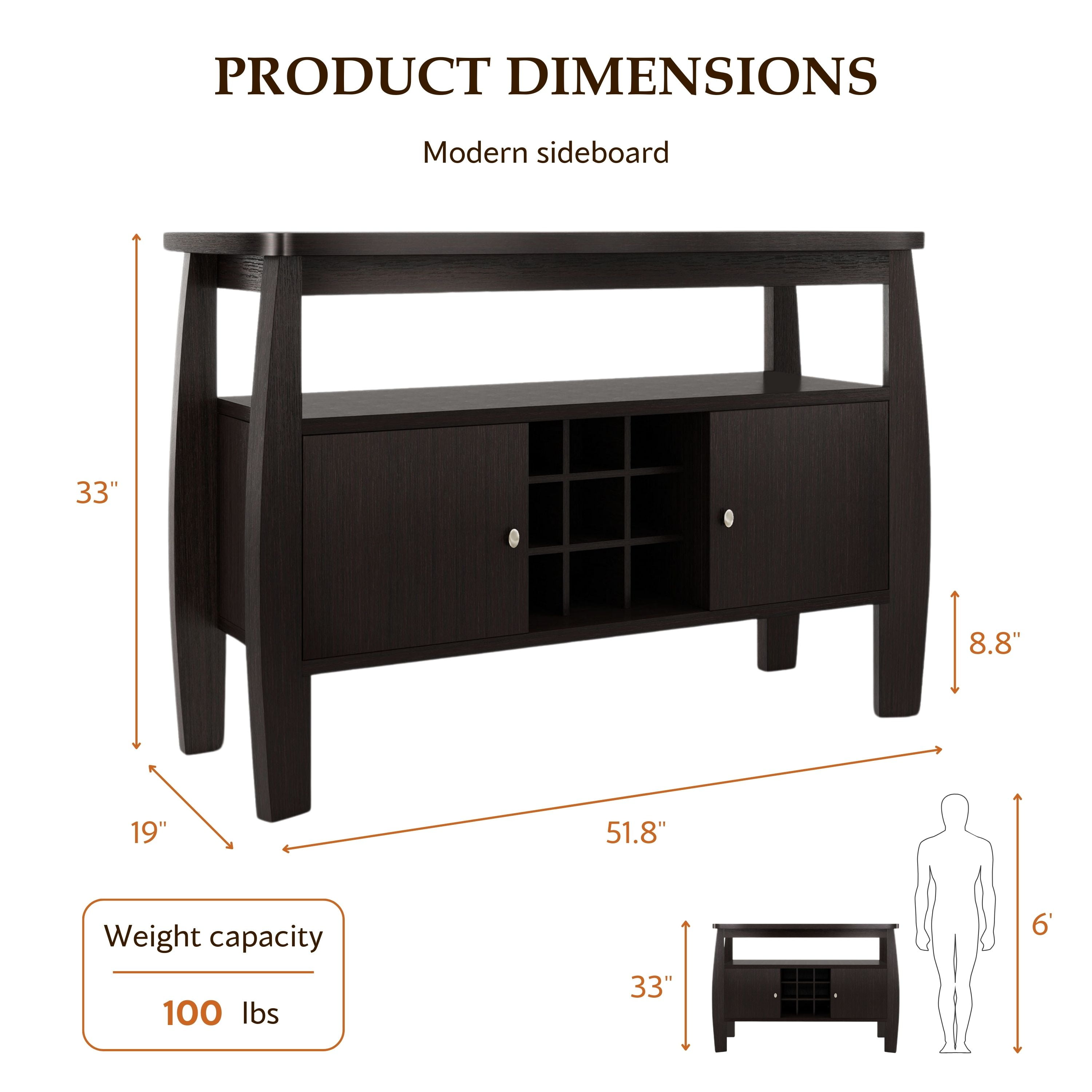 Furniture of America Vera Multi-Storage Wood Buffet Table, Espresso Includes: One (1) Buffet Style: Contemporary Finish: Espresso Materials: MDF, Particle Board 2 side cabinets for enclosed storage Built-in wine rack features 9 slots Open the top shelf for additional storage space Clean, linear lines with curved accents Easy to follow step by step assembly guide included Ships in 1 box Color and Finish: Espresso Dimensions & Weights: Overall Dimensions: 51.75″W x 19.00″D x 33.00″H Closed Cabinets: 15.50″W x 14.75″D x 13.75″H Open Storage Space: 44.75″W x 12.50″D x 7.25″H Each 9-grid Standard Sized Wine Bottle Rack: 4.25″W x 6.00″D x 4.25″HClick here to view the assembly guide About Furniture of America Furniture of America® is proud to be the family friend that always has your back. We’re more than just a business. Our customer care team is part of a larger FOA community dedicated to delivering a happy home. So browse our selection and invite warmth and character into every room in your home.