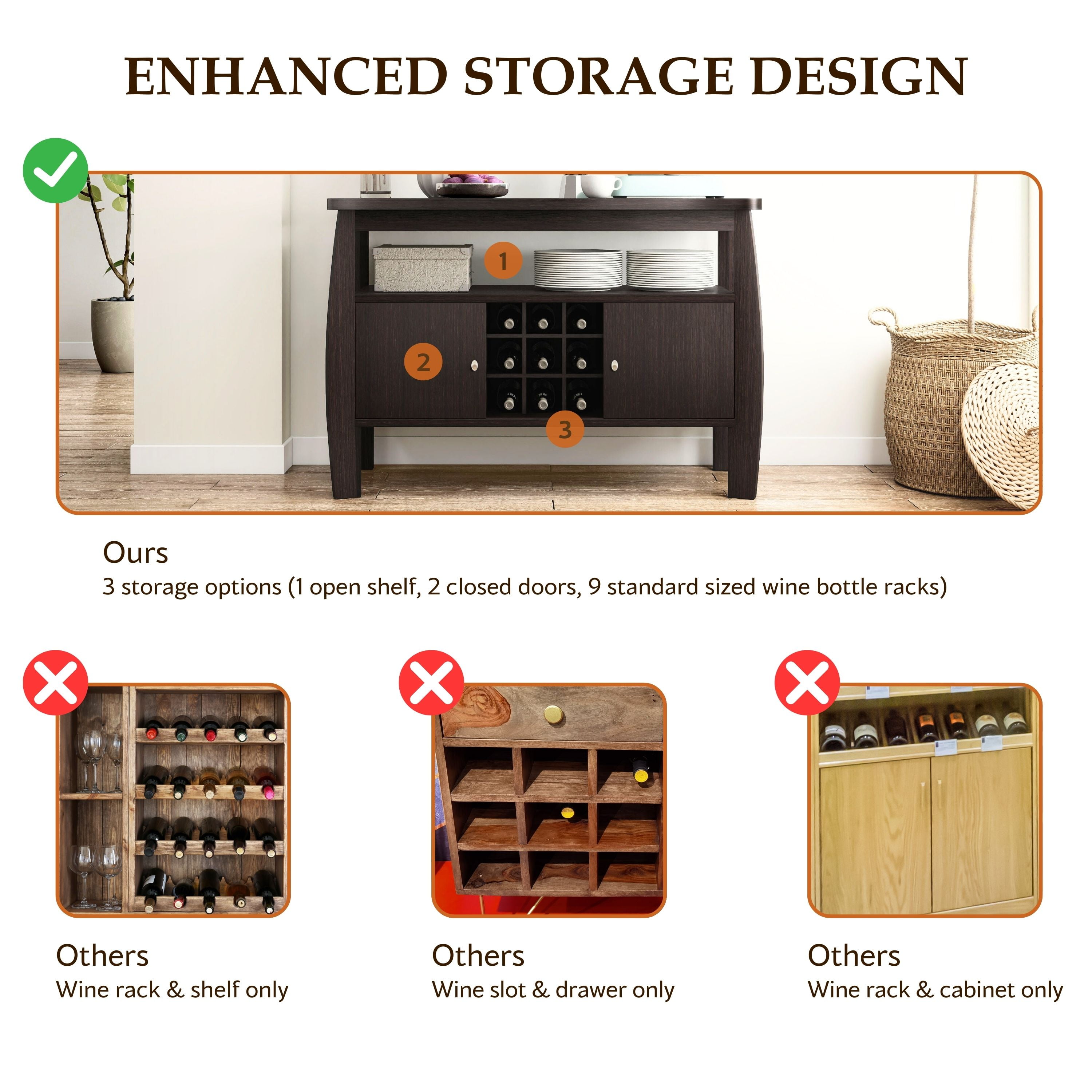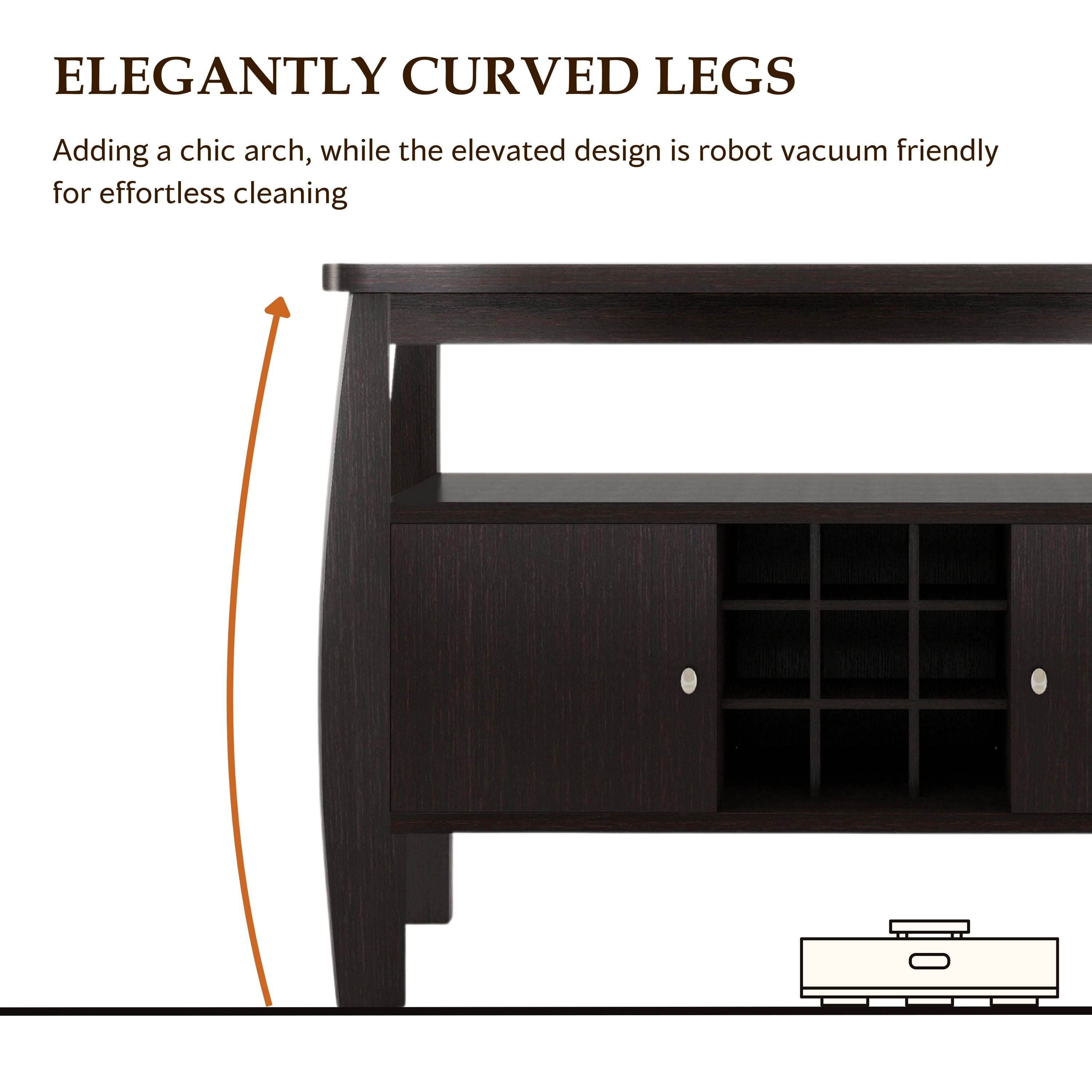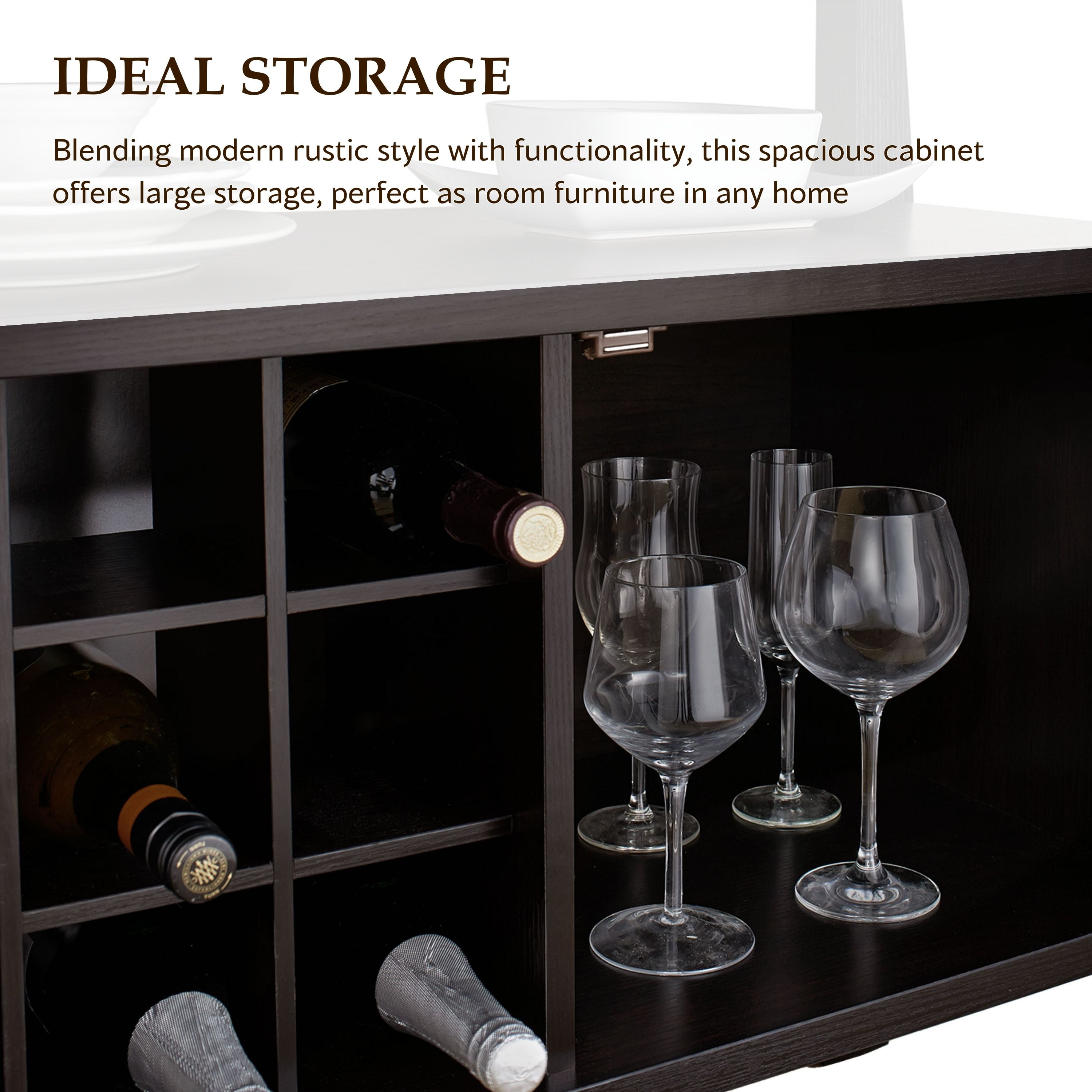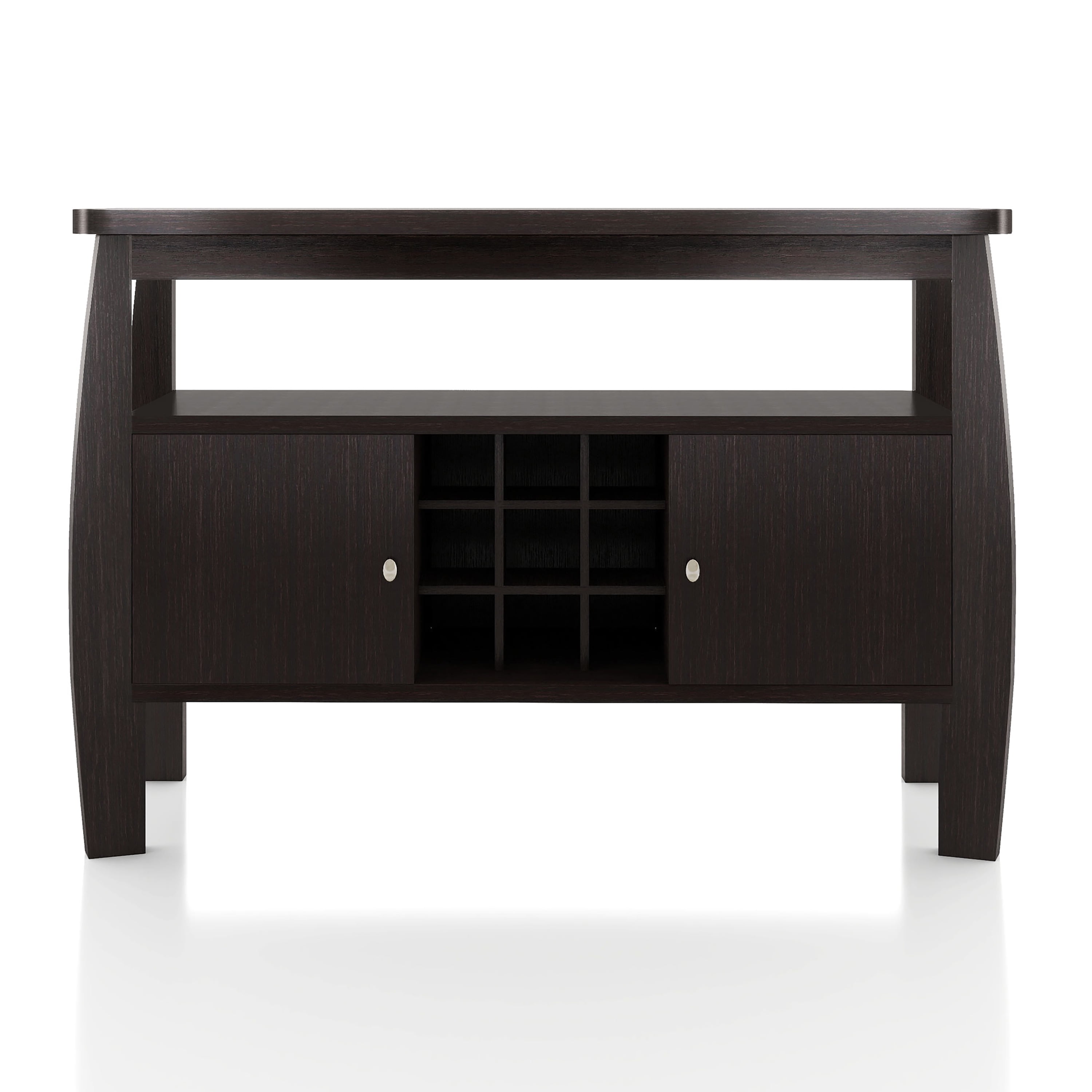 Furniture of America Vera Multi-Storage Wood Buffet Table, Espresso Includes: One (1) Buffet Style: Contemporary Finish: Espresso Materials: MDF, Particle Board 2 side cabinets for enclosed storage Built-in wine rack features 9 slots Open the top shelf for additional storage space Clean, linear lines with curved accents Easy to follow step by step assembly guide included Ships in 1 box Color and Finish: Espresso Dimensions & Weights: Overall Dimensions: 51.75″W x 19.00″D x 33.00″H Closed Cabinets: 15.50″W x 14.75″D x 13.75″H Open Storage Space: 44.75″W x 12.50″D x 7.25″H Each 9-grid Standard Sized Wine Bottle Rack: 4.25″W x 6.00″D x 4.25″HClick here to view the assembly guide About Furniture of America Furniture of America® is proud to be the family friend that always has your back. We’re more than just a business. Our customer care team is part of a larger FOA community dedicated to delivering a happy home. So browse our selection and invite warmth and character into every room in your home.