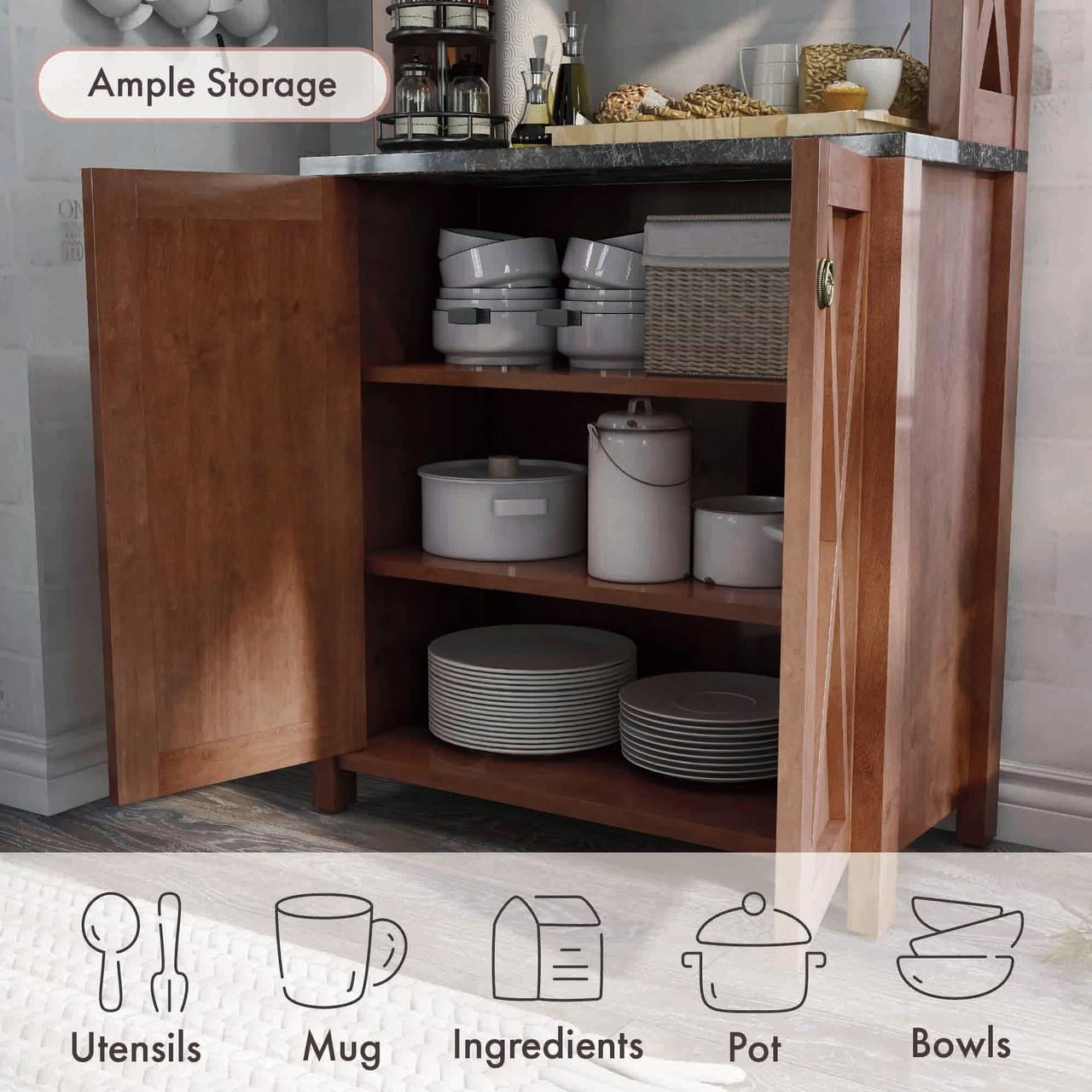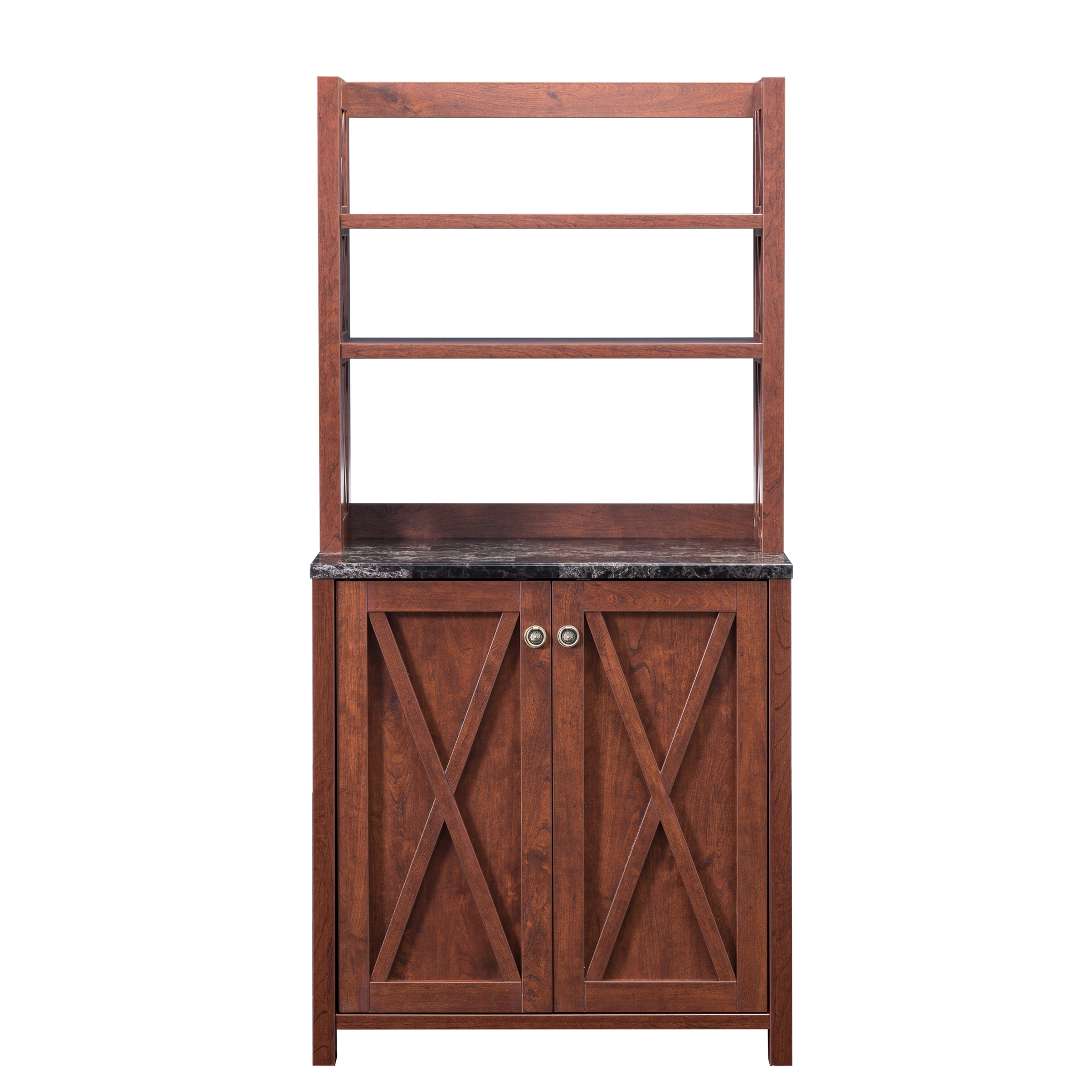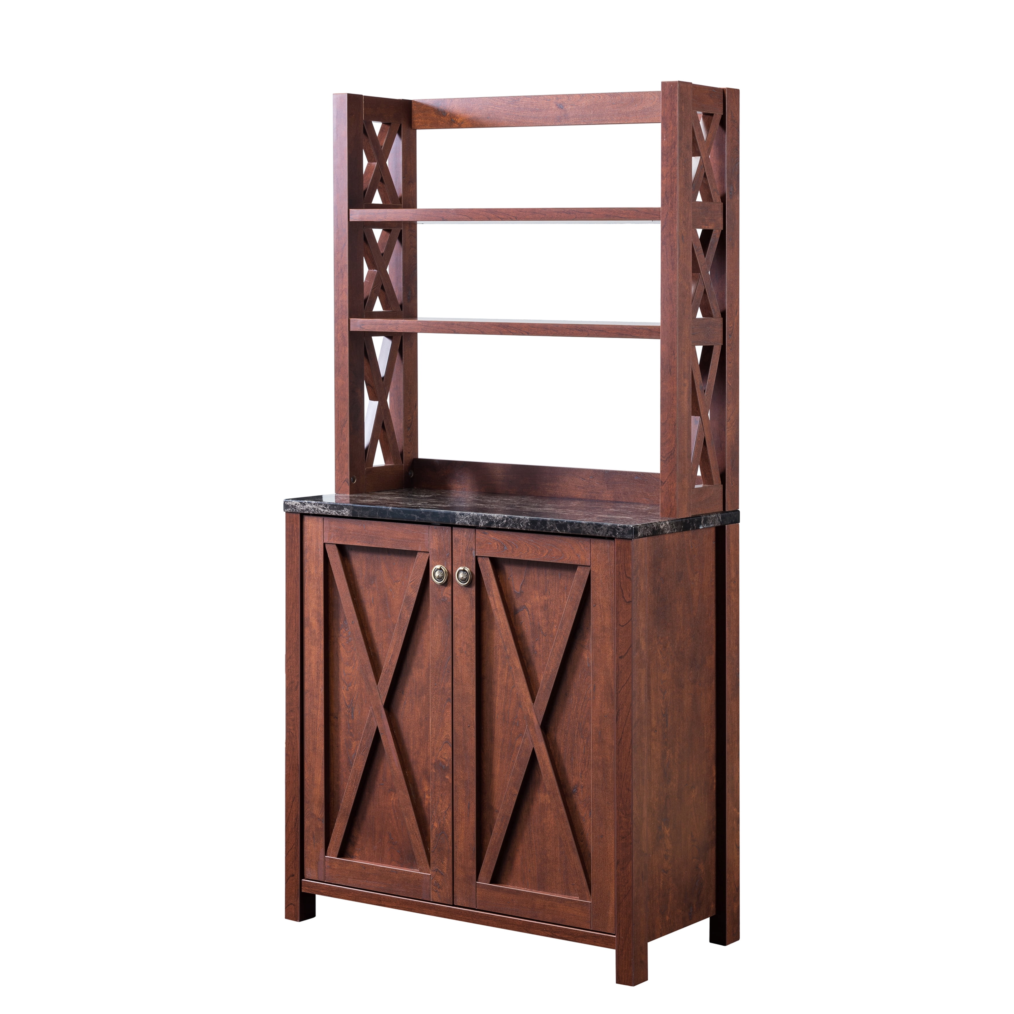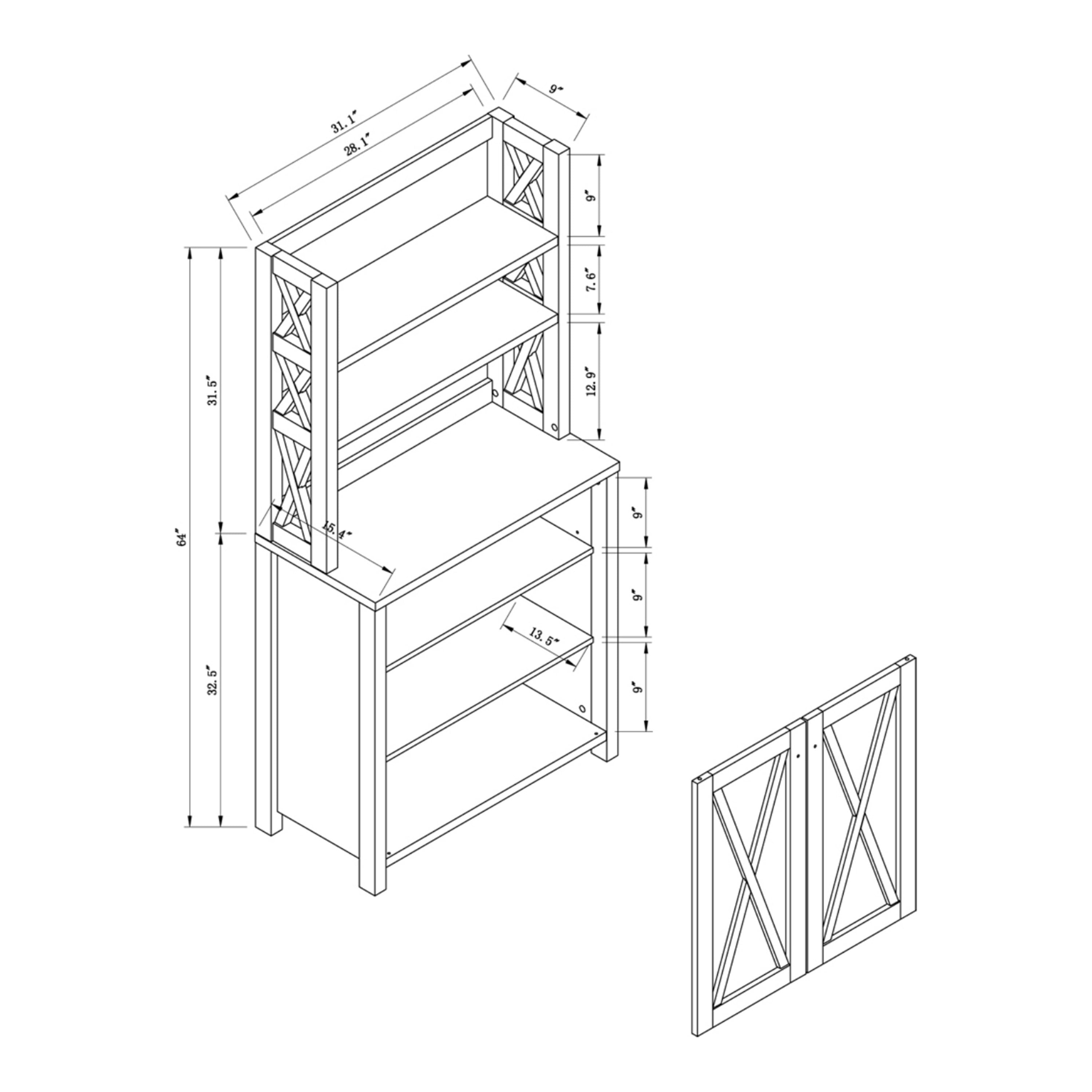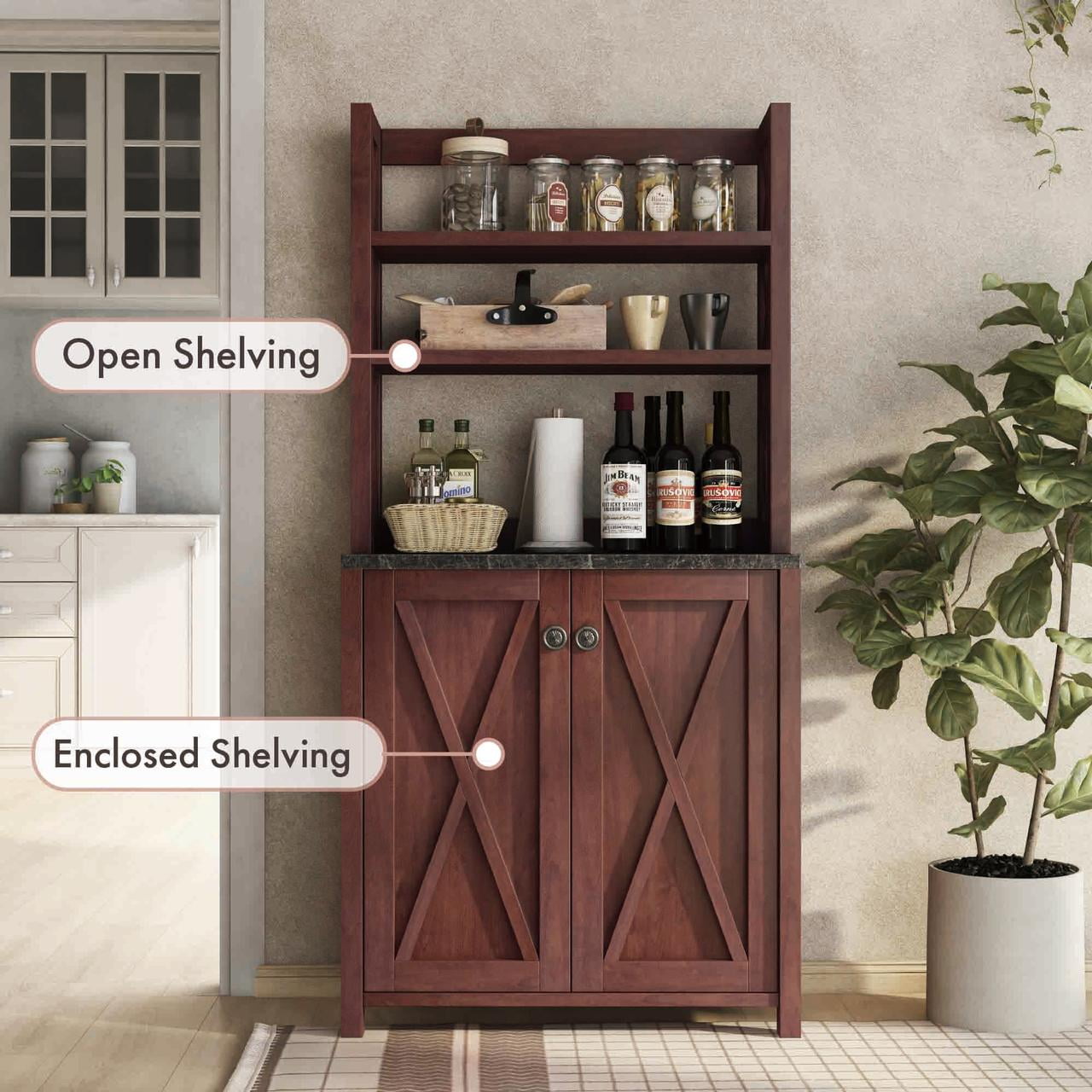 Furniture of America Wilkes Rustic 2-Door Bakers Rack, Vintage Walnut Includes: One (1) baker’s rack Style: Rustic Finish: Vintage Walnut Material: Particle Board, MDF Two (2) upper open shelves Barn inspired criss-cross paneling Faux marble prep area Comes with assembly instructions Ships in 1 box Dimensions & Weights: Overall dimensions: 31″W x 15.25″D x 64″H Weight capacity: 50 lbs Product weight: 82 lbs Click here to view the assembly guide About Furniture of America Furniture of America® is proud to be the family friend that always has your back. We’re more than just a business. Our customer care team is part of a larger FOA community dedicated to delivering a happy home. So browse our selection and invite warmth and character into every room in your home.