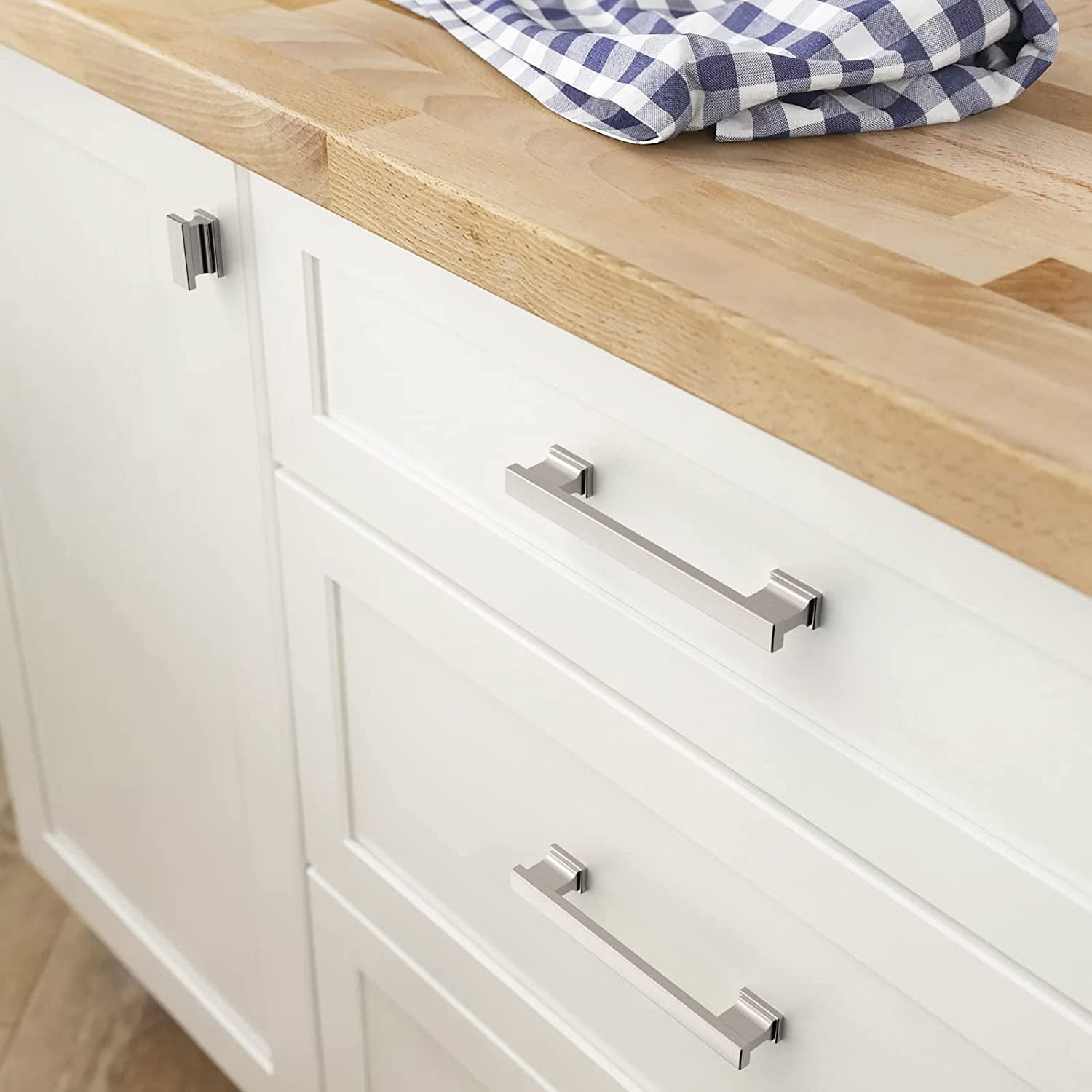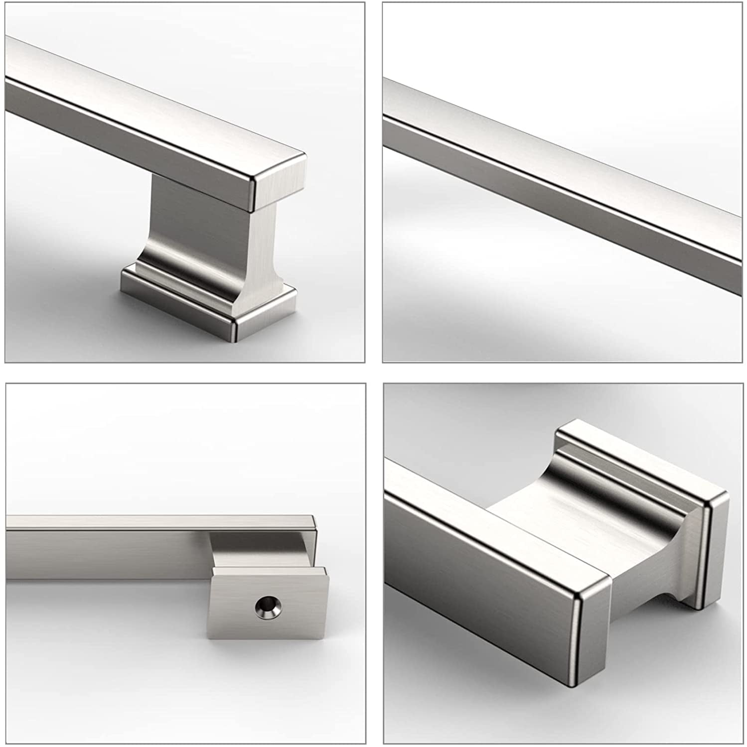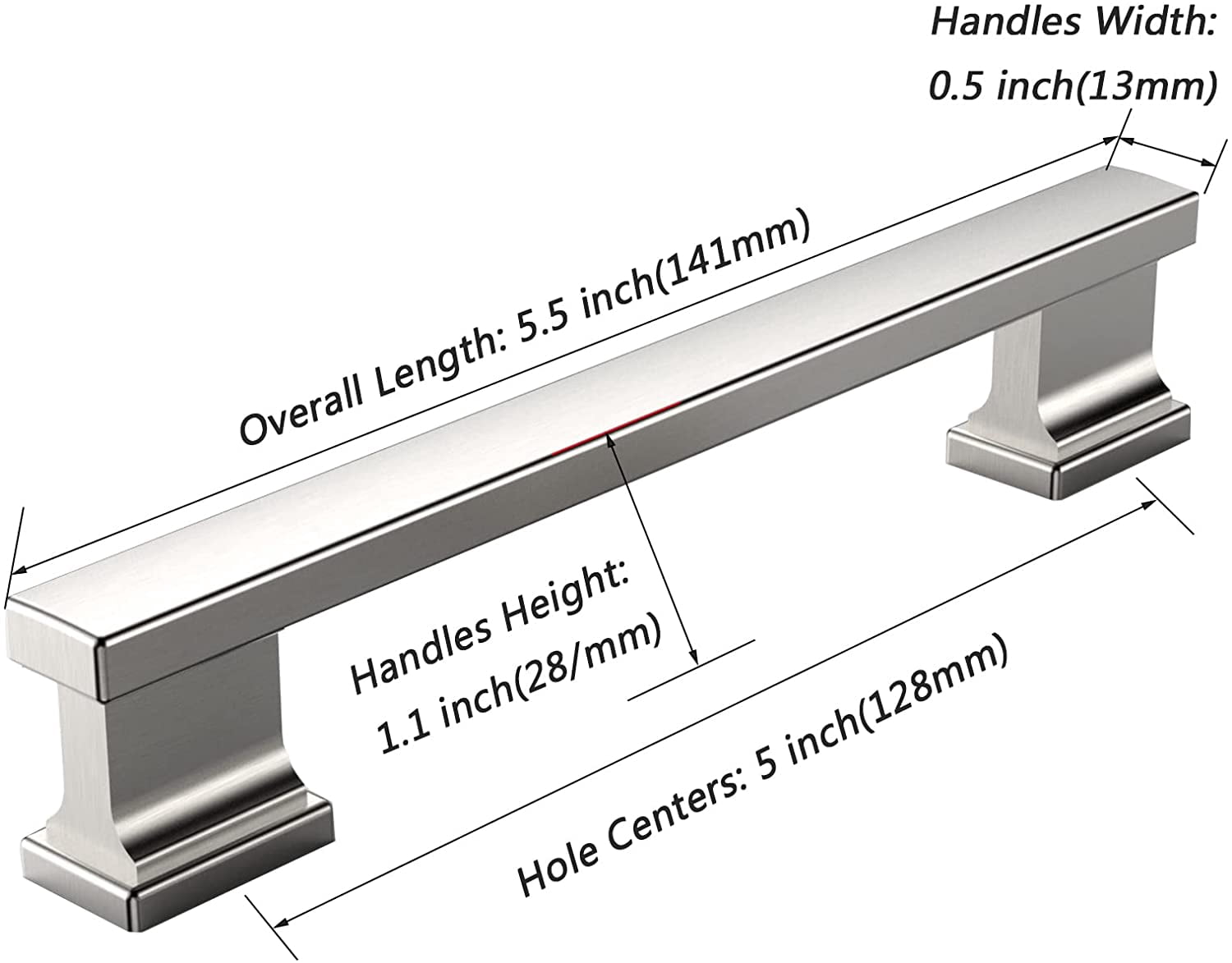 The Classic Brush Satin Nickel Finished enhances the grade of your kitchen, bedroom, and bathroom, suitable for all kinds of drawers, closets, and cabinets, etc. Made of High-Quality Zinc Alloy with Brushed Satin Nickel Finish, Heavy Duty Cabinet Pulls Fits most cabinets, each handle includes 2 sets of mounting screws(1″ and 1.77″) Our Cabinet Handle with 5″(128mm) Hole Center and 5.5″ (141mm) in Overall length.