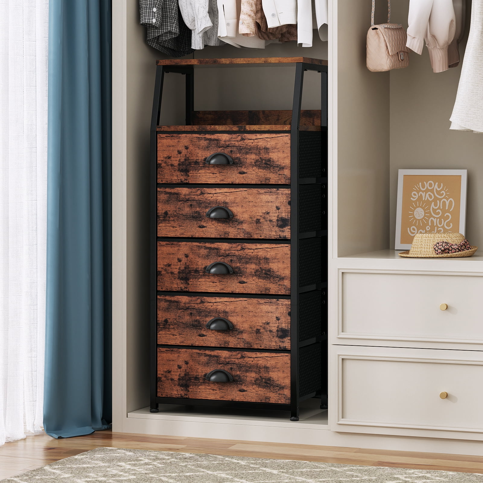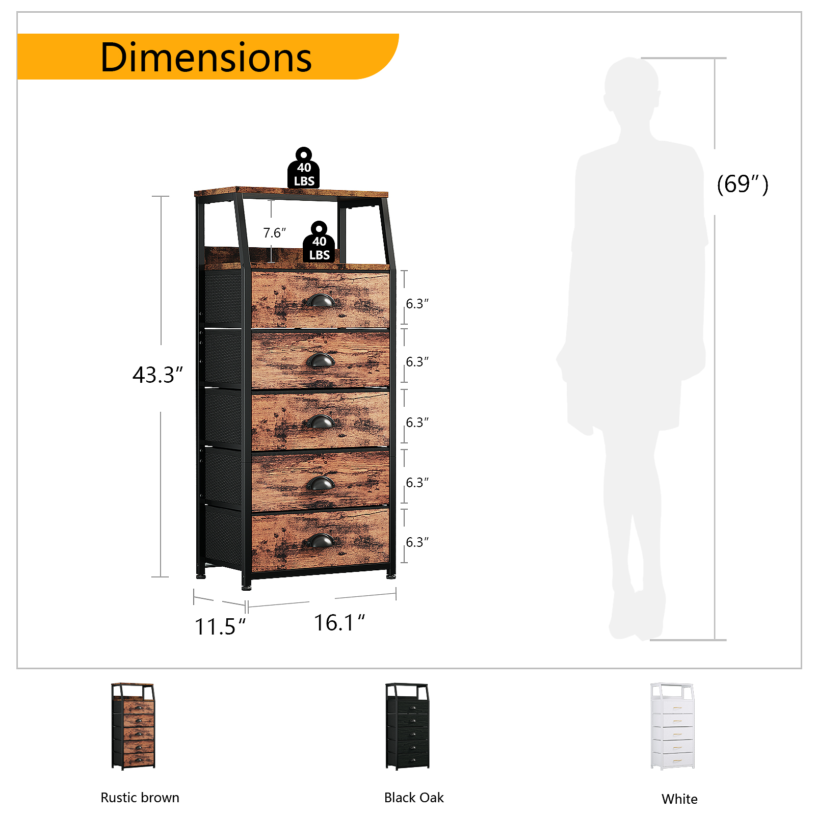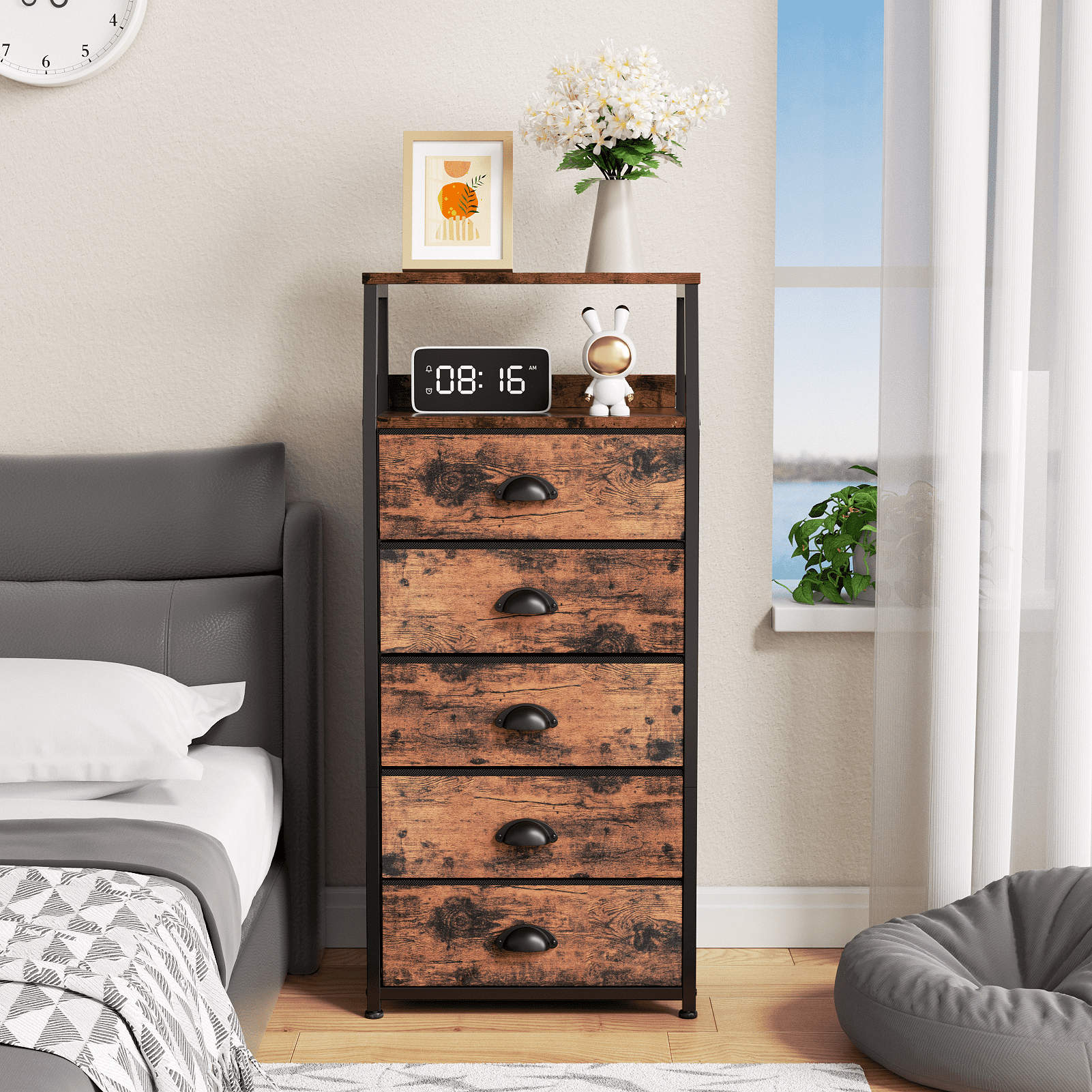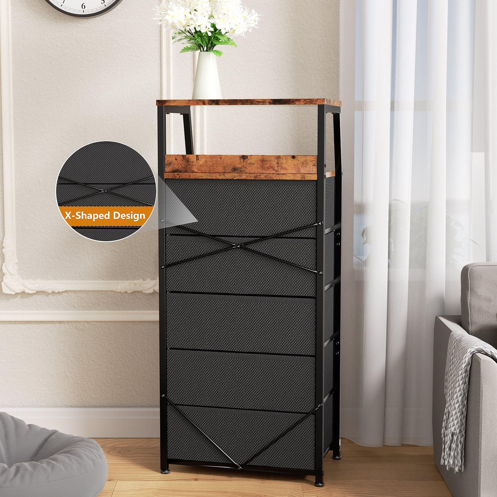 Furologee 5-Drawer Dresser Fabric Bin, Vertical Storage Organizer with Bins for Living Room, Bedroom Side Table, Stable Nightstand for Adults & Kids, Rustic Brown
