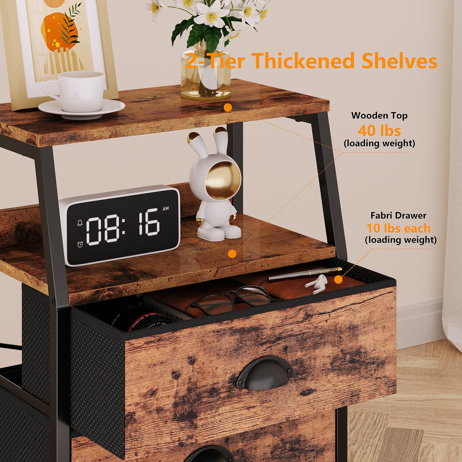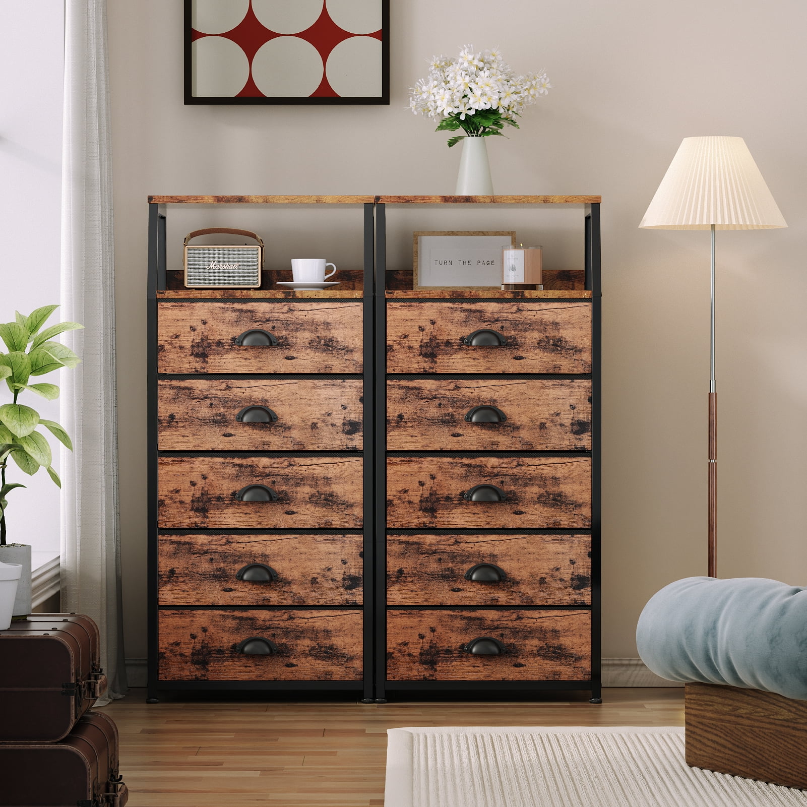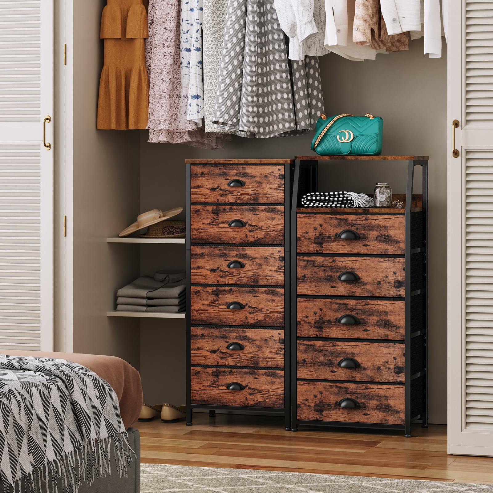 Anti Tip Kit: Friendly to kids or young ones. Fixing the dresser on the wall with the anti-tip kit can provide a safe environment for your family Adjustable Feet: The storage dresser is equiped with 4 adjustable feet which can help to adjust the height of the dresser if your ground is uneven Multi-scene Application: This dresser is designed in a rustic industrial style, which is classic and functional, making it suitable for any room Sturdy Structure: The chest of drawer is made with sturdy metal frame, which offers high strength support and ensure years of use. Anti-toppling device is provided to prevent it from falling down Shelf with Back Board: The second shelf of the dresser has an additional back board to ensure that it is more stable and can effectively prevent small items from falling Durable Storage Drawer: Features foldable storage drawers. Each fabric drawer (NOT WOOD) offers large storage space, perfect for organizing clothes, toys, socks, underwear, scarves, blankets and other accessories. The drawers are made of linen fabric, lightweight and durable, and won’t pinch hands, also safe for child to use Double Display Shelf: Specially designed with the double-layer shelf. The wooden top is solid and wear-resistant. It can display vases, photo frames, lamps, decorations, etc. Easy to Assemble: The package includes all the tools and accessories, you can install it in 20 minutes with the instruction. The wood dresser is slim and light, and does not take up much space. Perfect Gift for a housewarming or your family and friends