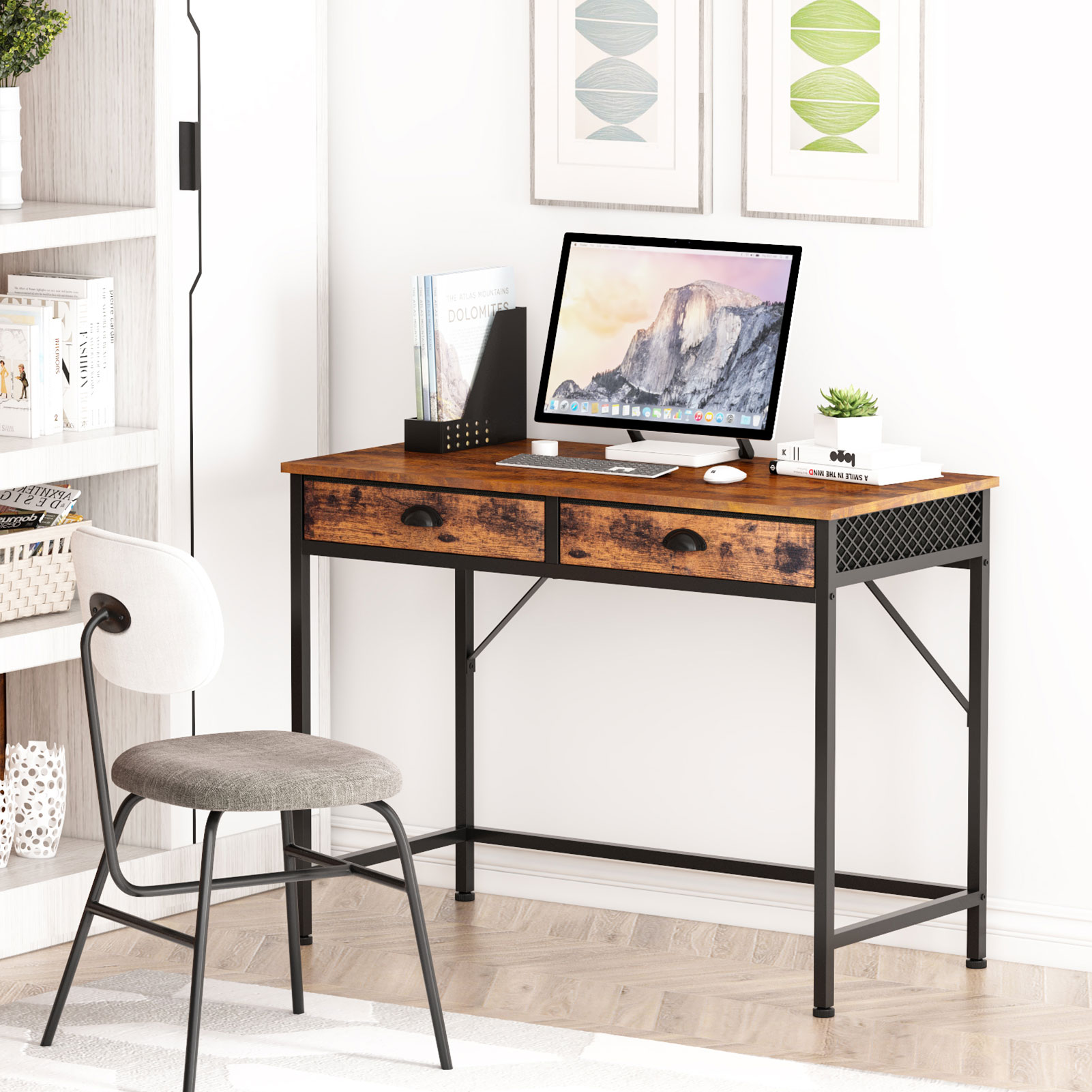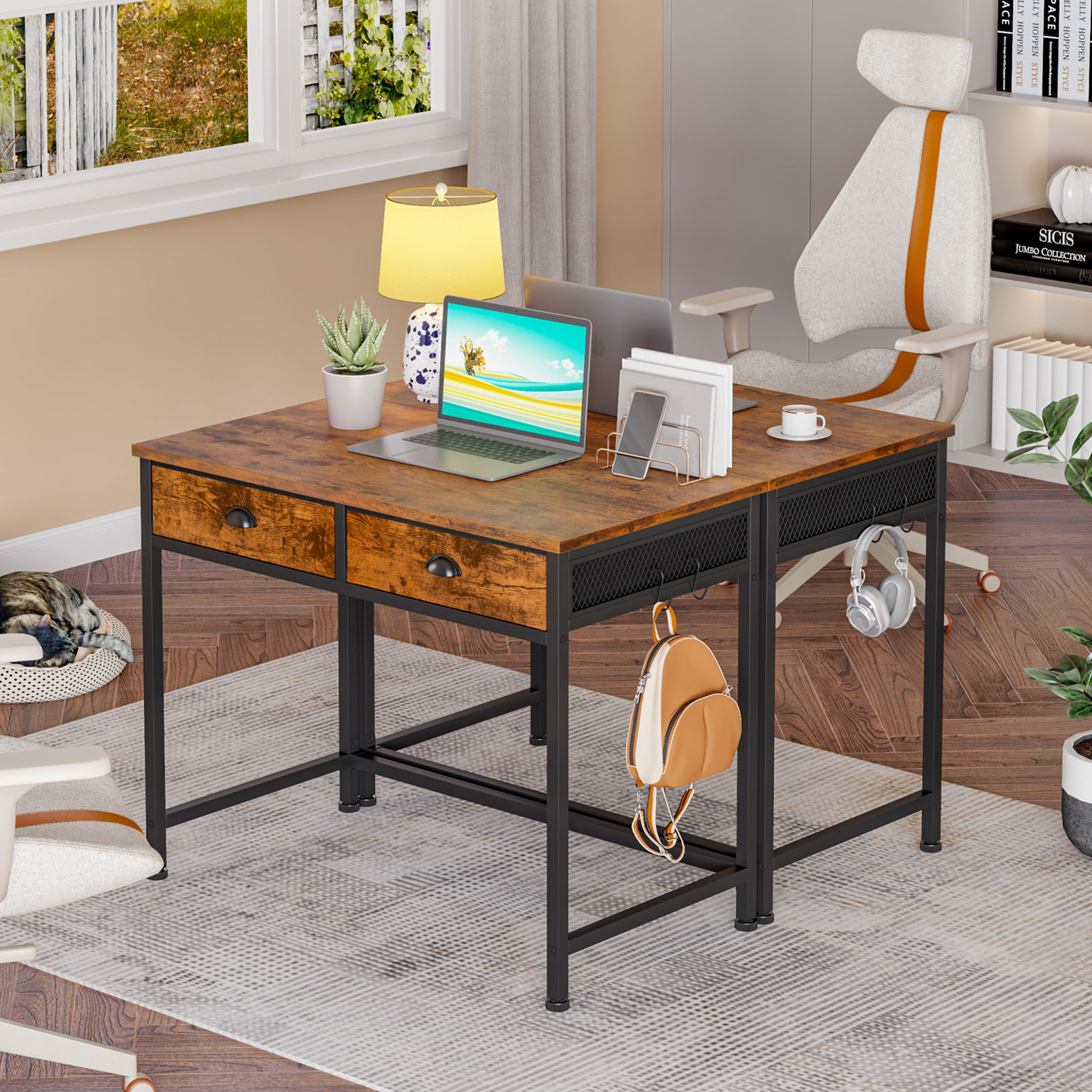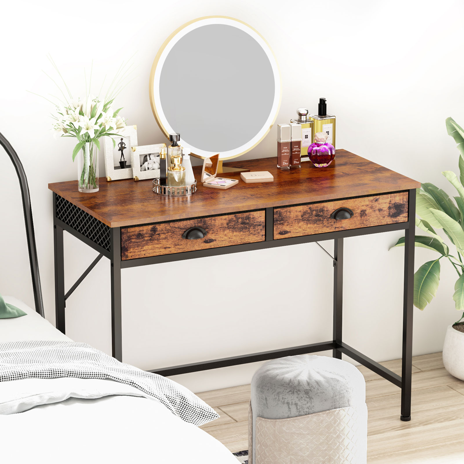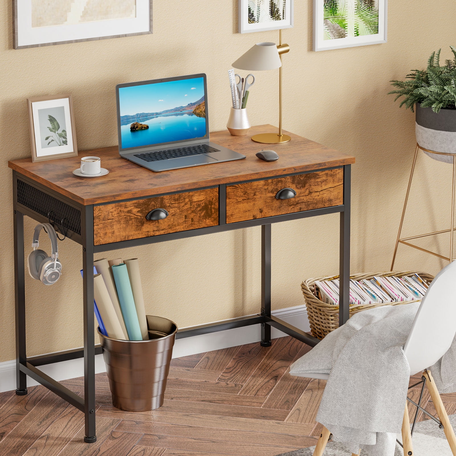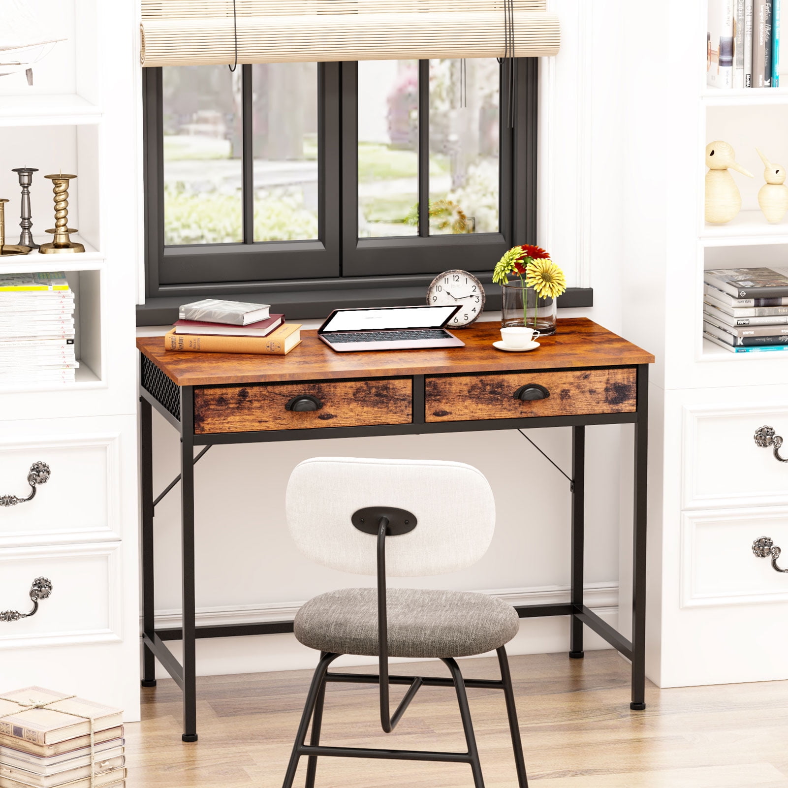 Furologee Computer Desk Home Office Writing Desk with 2 Fabric Drawers, Rustic Brown Desk with 2 Fabric Drawers: Two storage drawers provide ample space to store books, cosmetics, jewelry, and other daily necessities. The drawers are made of non-woven fabrics (NOT WOOD DRAWER), making assembly more convenient compared to traditional wooden drawers, while effectively meeting your storage needs and maximizing desktop space Orderly Desktop: Two removable hooks can be used to hang bags, headphones, etc. With daily necessities stored in the drawers, the desk offers plenty of space for a PC, laptop, printer, keyboard, and mouse, making it ideal for writing, learning, makeup, and other home office activities. The underside of the writing desk provides ample legroom, suitable for generally adjustable chairs Multipurpose Desk: This small desk is suitable for various spaces such as bedrooms, living rooms, and children’s rooms. It can be used as a dressing vanity table, writing desk, study desk, computer desk, or gaming desk with drawers. A great gift choice for a beloved wife, girlfriend, or mother Sturdy Design Desk: The small vanity desk is constructed with a premium metal frame and E1 particle board to ensure strength and better load-bearing capacity. This writing desk can hold up to 100 kg/220 lbs. Four adjustable feet keep the desk stable on uneven ground and protect the floor from scratches Easy to Assemble: Comes with a manual featuring detailed operation instructions, hardware, and tools included. Each accessory is labeled for easy installation. Customer service is available before and after purchase; feel free to contact us with any questions