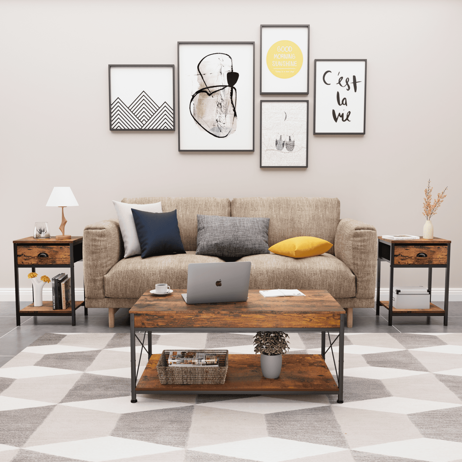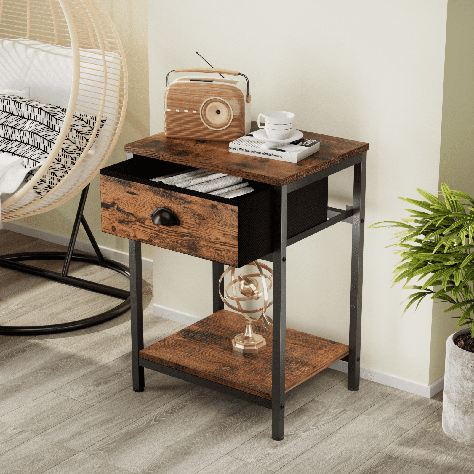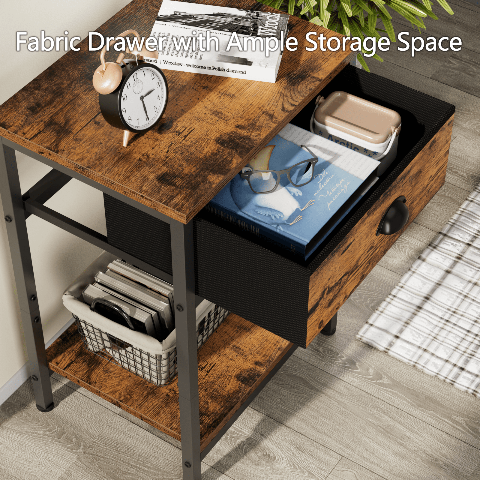 Stable & Sturdy: The bedside table features a fabric drawer with sturdy particleboard panels and steel side frames, durable and load-bearing capacity up to 44 lbs. 4 adjustable feet keep the table level to avoid scratching the floor 3-Tier Storage Option: The tall side table includes 2 tiers of open shelves provide ample space for storage and display. The open top shelf is perfect for displaying picture frames and plants. A drawer with handles provides more space to store personal items you want to put in Multi-function Stand: You can place it in many places, such as a bedside table, a small dresser in your dorm room, a printer stand or a coffee table next to your sofa. Decorate your space with an industrial style nightstand Upgraded Fabric Drawer: The metal end table features easy-pull arch handles and storage drawers made of high-quality non-woven fabric that is lightweight, breathable and prevent dust. The fabric drawer front is veneered with engineered wood in a rustic look Pretty Easy to Assemble: Manual with detailed operation instructions, the hardware and tools included and each accessory is labeled for easy installation. We provides customer service before and after purchase. If you have any questions, please feel free to contact us