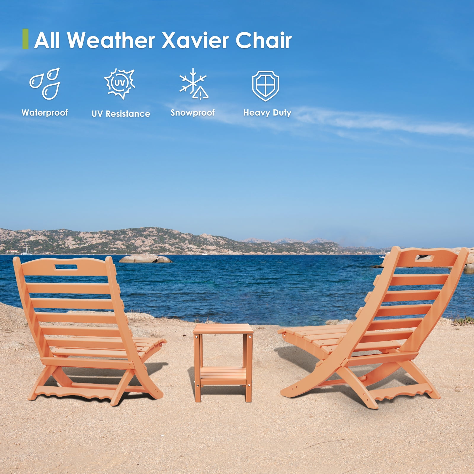 X-shape & Ergonomic — Folding Xavier Chair is low-slung, portable seating with waterproof HDPE frame, seat and back. The charming and comfortable design is perfect for outdoor relaxation or activities, and also folds easily for storage or transport. No Assembly Needed — Comes with 1 backrest piece & 1 slated seating piece. Takes 1 second to put them together or disassemble them. No hardware or tools needed! Can be used all season long with basic care and be easily stored away in the off-season. True HDPE HDPE — (High Density Polyethylene), gives a better quality and safer experience than typical material PE or PS.Unlike the normal wood chair, HDPE Xavier chairs are waterproof, weather-resistant, fade-resistant, and will not chip, peel crack, and rot as well, making it the perfect choice for outdoor useOverall product dimensions: 18.9″W x 25.8″D x 28.2″H (Single Chair). Maximum weight capacity: 350 lbs. Product weight: 18 lbs (Single Chair). It brings you an amazing outdoor experience no matter you?re fishing in lakes or having a wonderful conversation with your mates around the campfire.