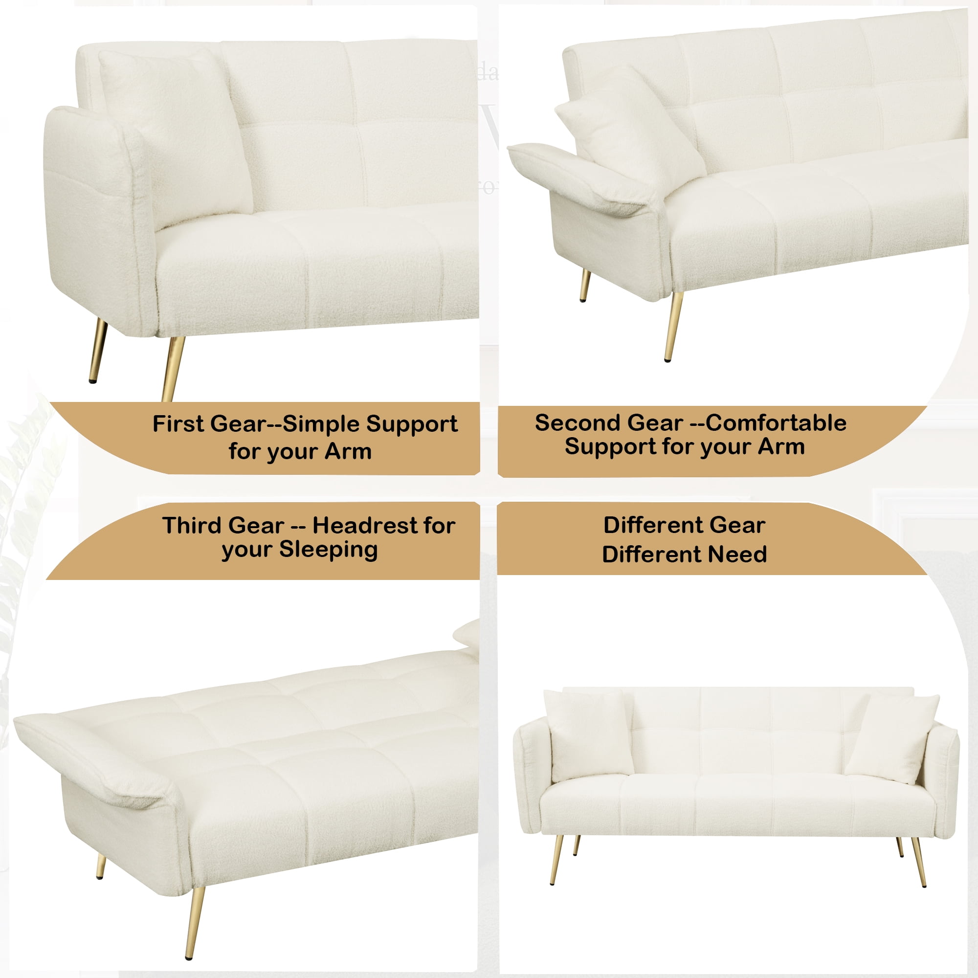 Contemporary Sofa with Golden Stainless Steel Legs The backrest of this sofa folds down to three angles, meaning you have the freedom to adjust the sofa’s comfort and use to your needs and preferences. The sofa can also be easily transformed into a comfortable bed, providing a comfortable stay for your family and guests. The armrests of the sofa can also be folded down and turned into a comfortable pillow for extra support and relaxation. This folding armrest design makes this sofa even more versatile for your different use needs. Package Size Length (in.):63.77 Width (in.):38.58 Height (in.):6.88 Weight (lbs.):81.57 High Quality: The Teddy Velvet is soft,skin-friendly and breathable,and the wood frame is sturdy Easy to assemble: The sofa adopts a simple assembly design, you only need to assemble the legs on the sofa to complete the assemble