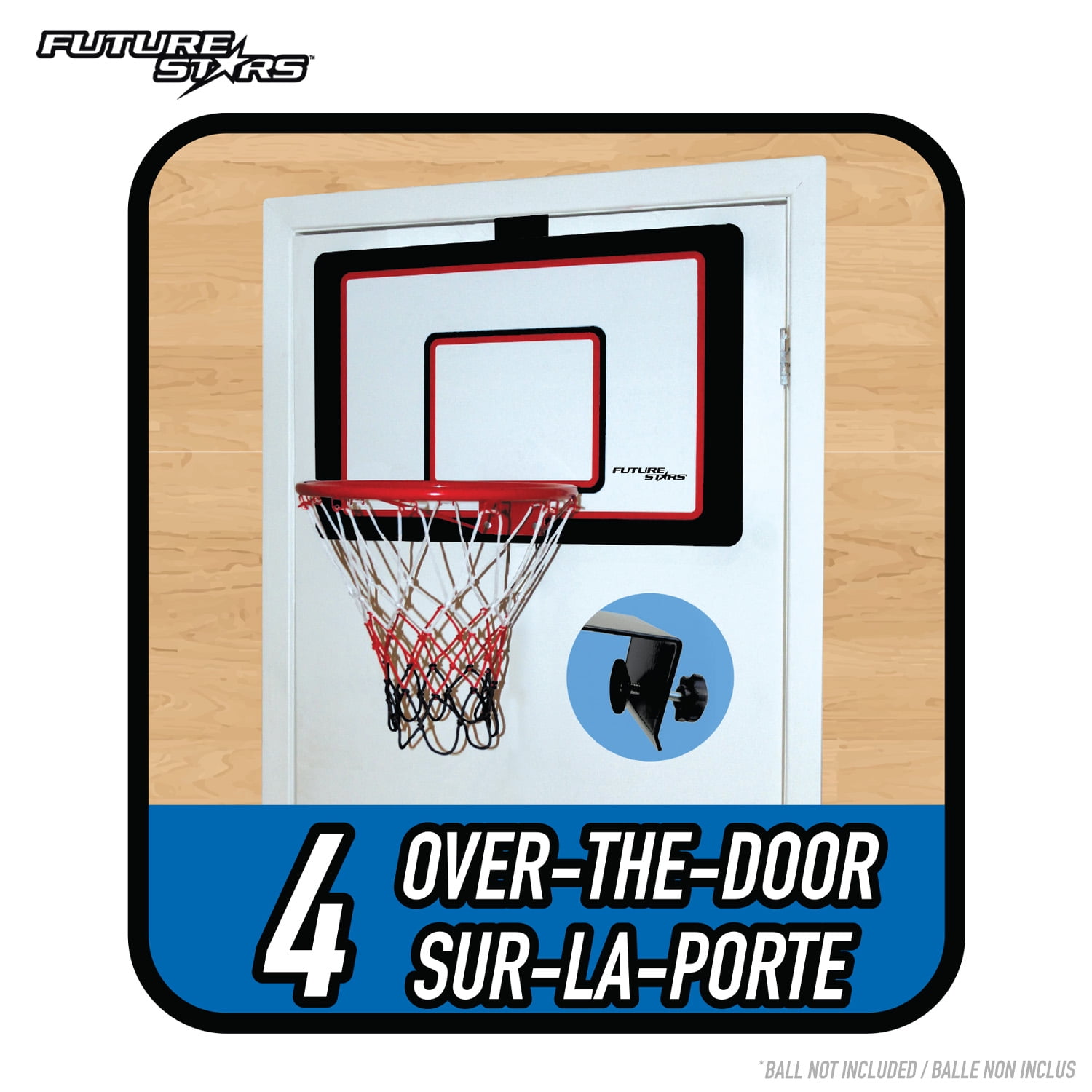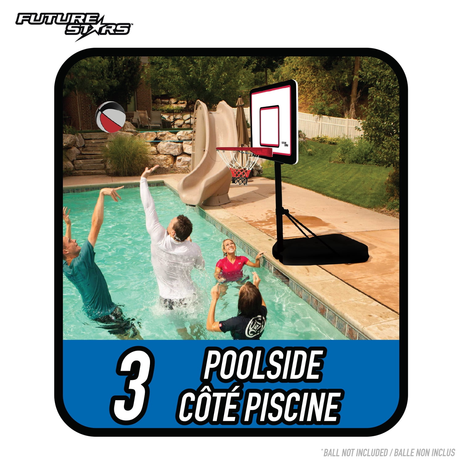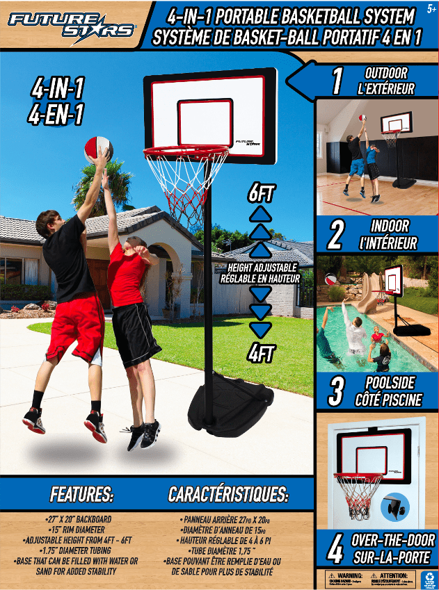 Future Stars 4 in 1 Basketball System – Outdoor, Indoor, Pool-Side and Over the Door! Height Adjustable from 4′ to 6′ with a telescopic pole. 27″ Injected Backboard is perfect for the driveway, playroom, by the edge of the pool and then fits over most doors! 15″ Metal Rim with Nylon, weather coated, tri-color mesh, you can use a regulation size basketball. Portable wheeled base can move around easily and it can be filled with water or sand. Specially designed backboard can be removed from the metal stand, equipped with the over-the-door hook and placed on any door! Tightening toggle on the padded over the door hook ensures the backboard is tight to the door to avoid rattling.