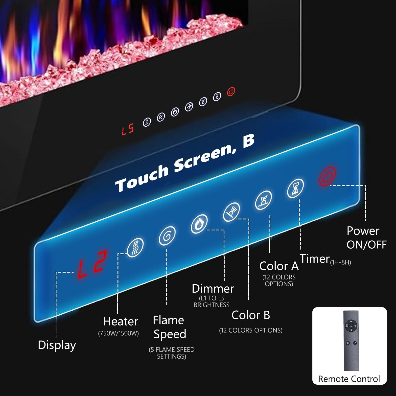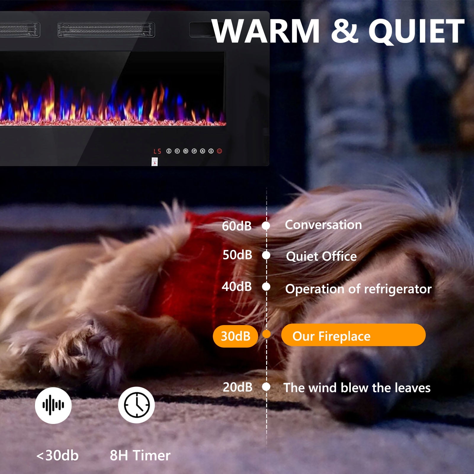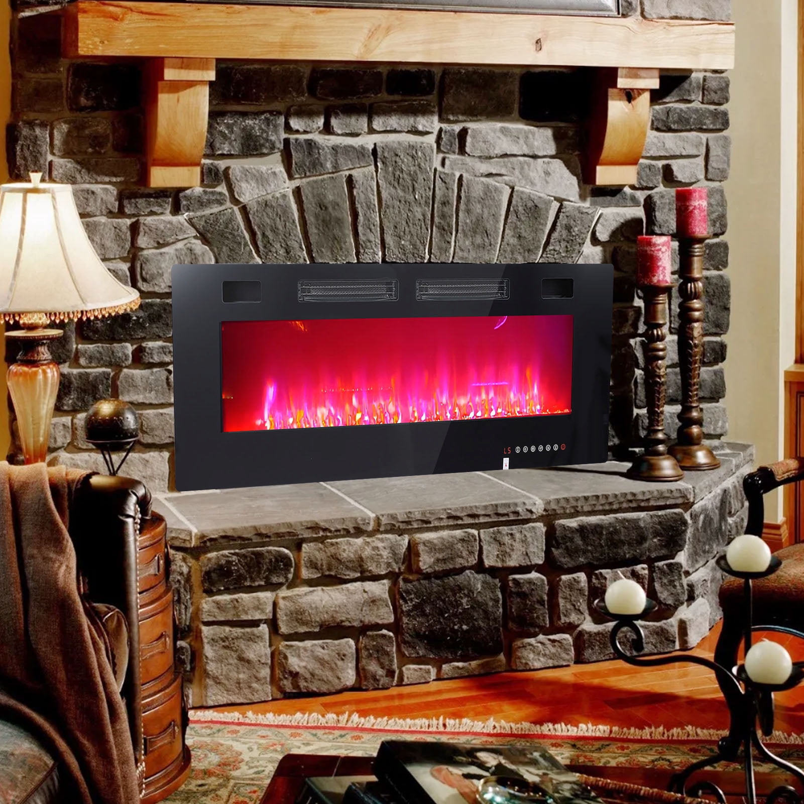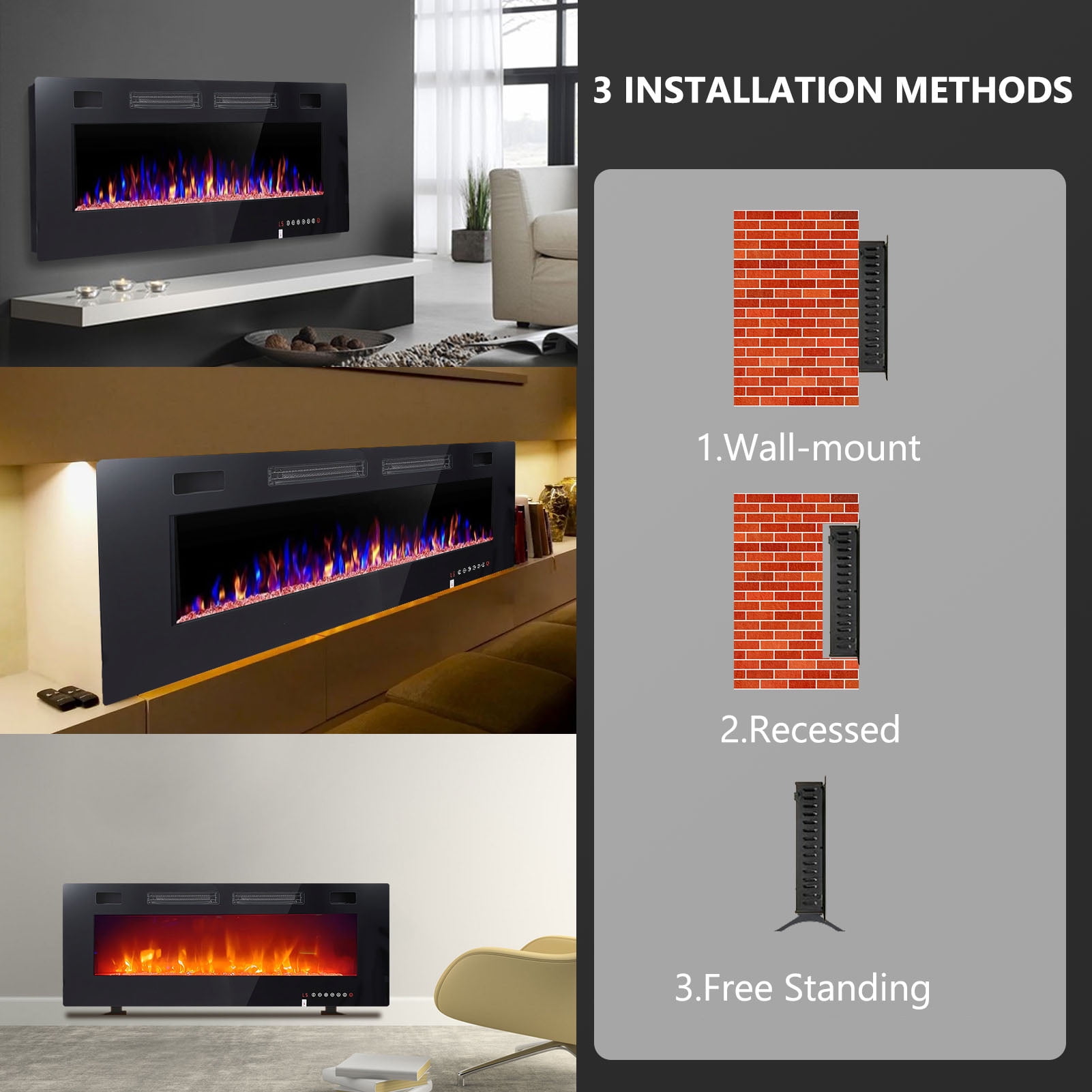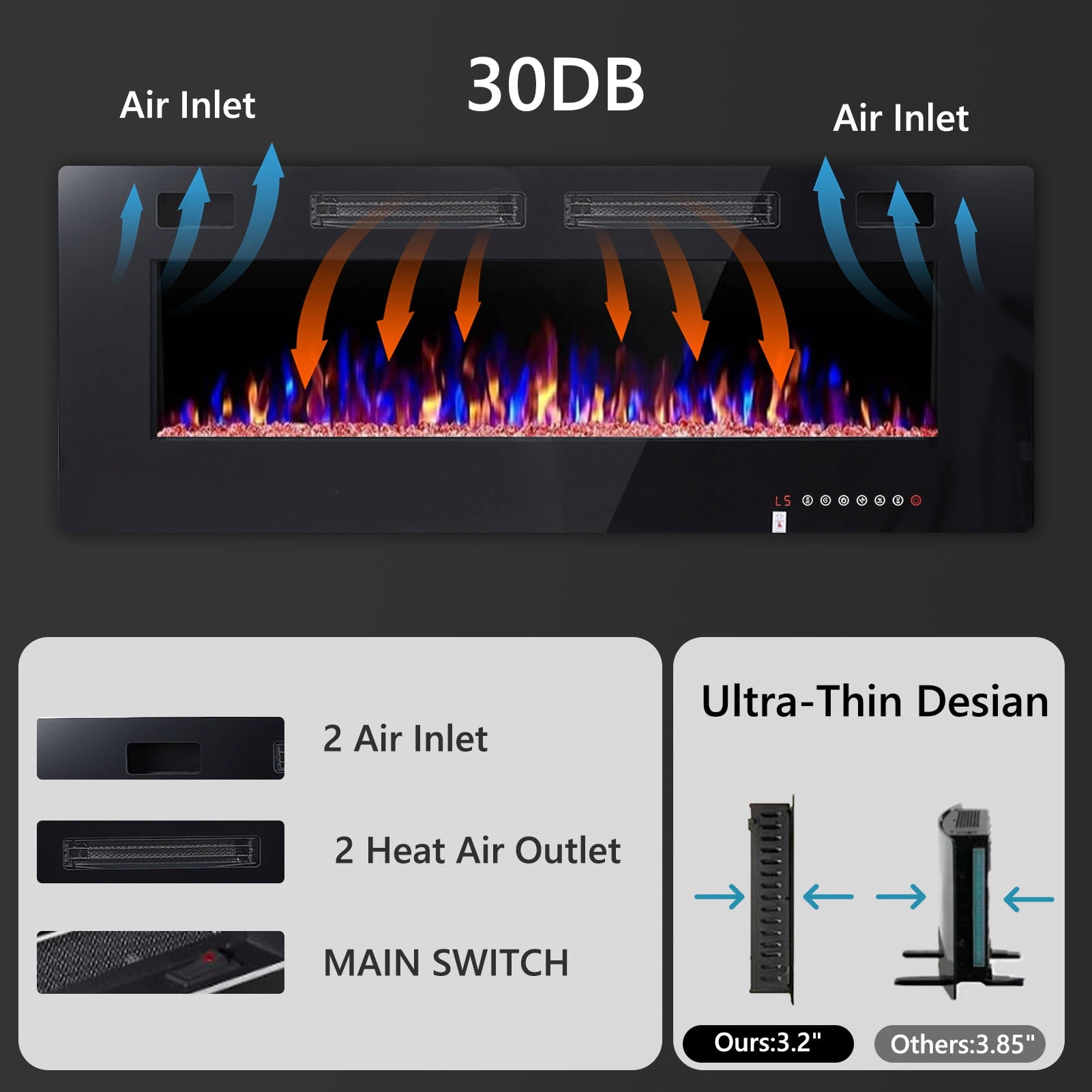 Product Description: Our ultra-slim quiet electric fireplace, a perfect blend of modern aesthetics and advanced heating technology. Designed to elevate the ambiance of any room, this fireplace is not just a source of warmth but a stunning visual centerpiece that exudes sophistication.With its profile, the fireplace seamlessly integrates into your wall, offering a minimalist look that complements contemporary interior designs. The ultra-slim design ensures it takes up minimal space, making it ideal for apartments, offices, or any room where style and functionality are paramount. Our electric fireplace is different from other fireplaces in that it has two hot air outlets, which is 30% more efficient than traditional fireplaces with 1 hot air outlet. In addition, the fireplace has two heating modes, 750W and 1500W, and has 5 brightness adjustments and 5 flame speed adjustments, as well as 12 flame colors and 12 LED colors to choose from, which can meet your different needs. Equipped with the remote control, you can operate it as you like. Our electric fireplaces also have ETL, CE certification and overheat protection to ensure the Safe of use, you can rest assured! Features: ????【Dual Heat Vents】 This fireplace has two heat vents for double warmth and comfort in cold weather, heating efficiency increased by about 30% compared to traditional, increase the wind volume while reducing the noise generated, ultra low noise so that children and waking elderly can rest at ease.It can heat up to 600 sq ft with low noise. ????【Multiple Flame Colors】 12 Flame colors and 12 LED colors, to give guests more and better choice, better experience, flame color upgrade, more vivid, close to the true color, large flame can show the sense of line, visual experience more impact. ????【Multifunction】 5 levels of brightness adjustment, 5 levels of flame burning speed adjustment, timer shutdown 1‑8 hours, 2 heating levels, can be set 750W/1500W power, energy saving and high efficiency coexist, can meet the needs of 430 Sq.FT of space.The thickness of the fireplace is only 3.2 inch.20% thinner than the other fireplace. ????【Safe And Comfortable】 Certified by ETL, CE, etc., with internal overheating protection and auto-heat kill safety devices to avoid overheating. The heat is conducive to maintaining the nature humidity in the air without over‑drying the room. It is more likely to ensure safe use while enjoying life. ????【Multiple Installation Methods】 Insert the electric fireplace into the wall or hang it on the wall or on the floor, you can enjoy the comfort of the fireplace conveniently without taking up too much space. The use of remote control makes your enjoyment more upgraded, and the good‑looking electric fireplace can add fashion to your bedroom, living room, office. ????【7×24 Hour Customer Service】 We are confident in this Electric Fireplace and so will you. If for some crazy reason you are not 100% satisfied or your Electric Fireplace accessory is damaged, please contacting us! We will solve the problem for you quickly. Don’t worry about after-sales service! We will always be at your service. Specification: Item Type: Electric Fireplace Power: 1500W Material: Alloy, Glass Remote Control Battery: 2 x AAA Batteries (not Included) Features: Dual Fan Turbocharging, Reduce Less Noise Increase Wind Power Package List: 1 x Electric Fireplace 27 x Screws10 x Expansion Bolts 1 x Remote Control 1 x Instruction Manual 2 x Bracket 1 Pack x Decorative Crystals