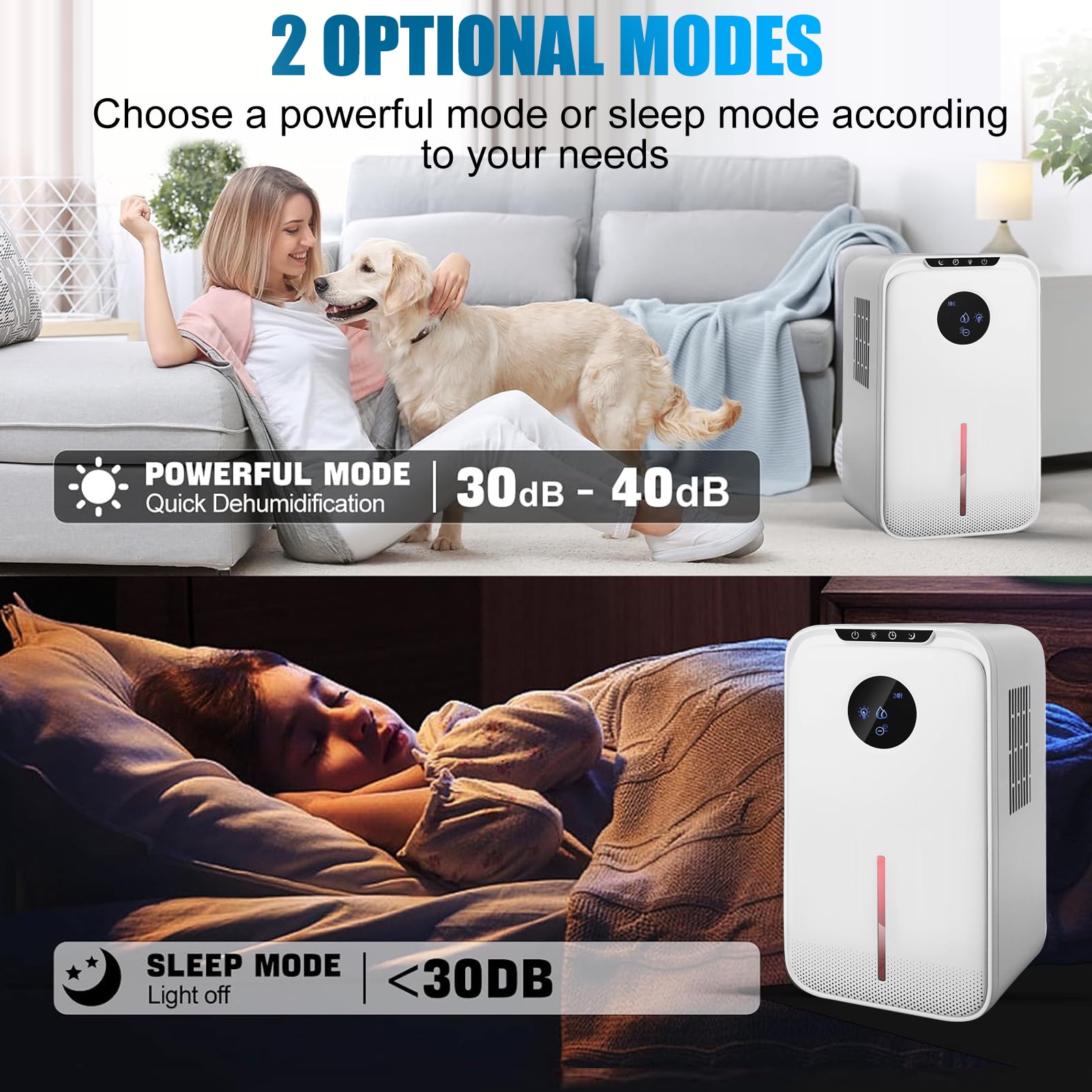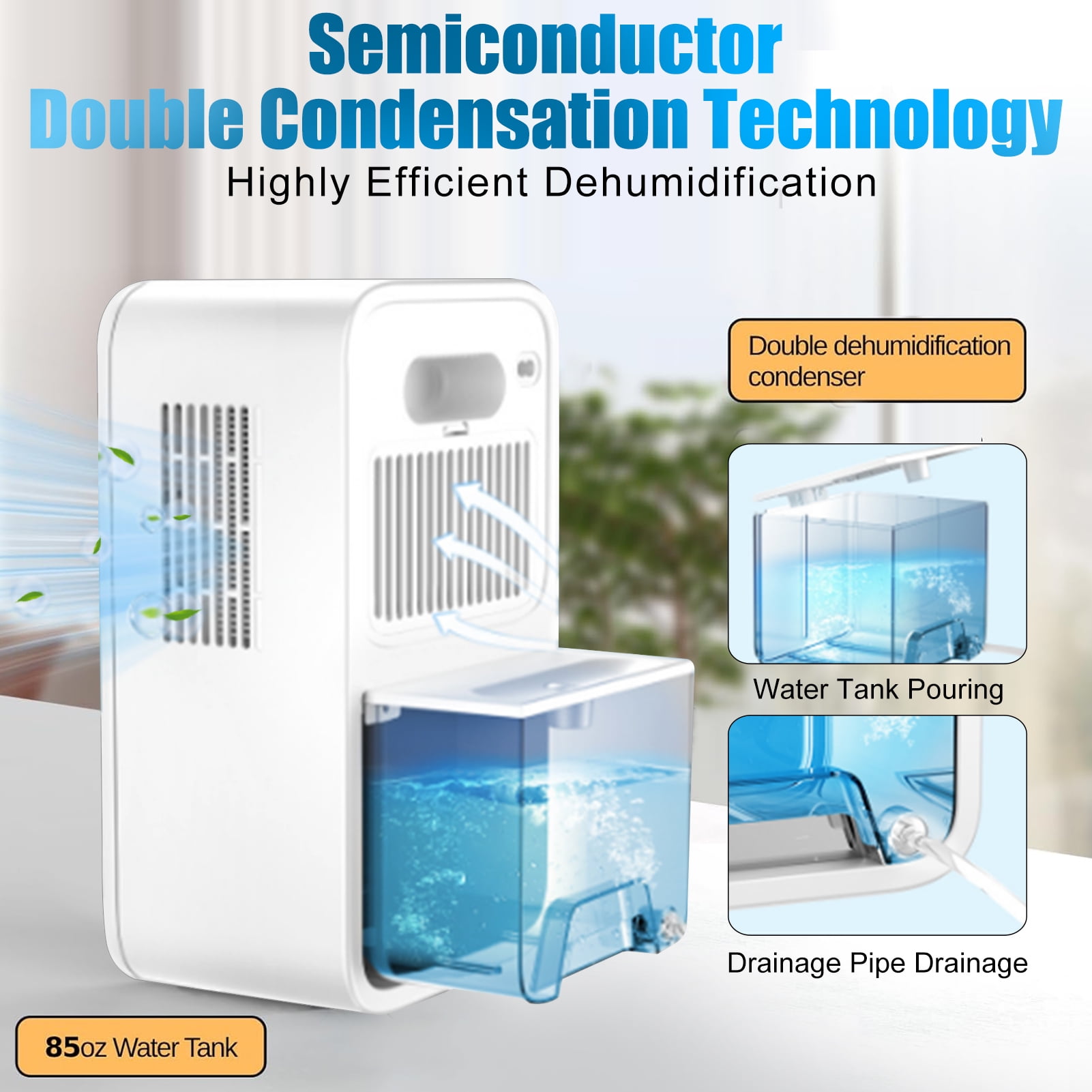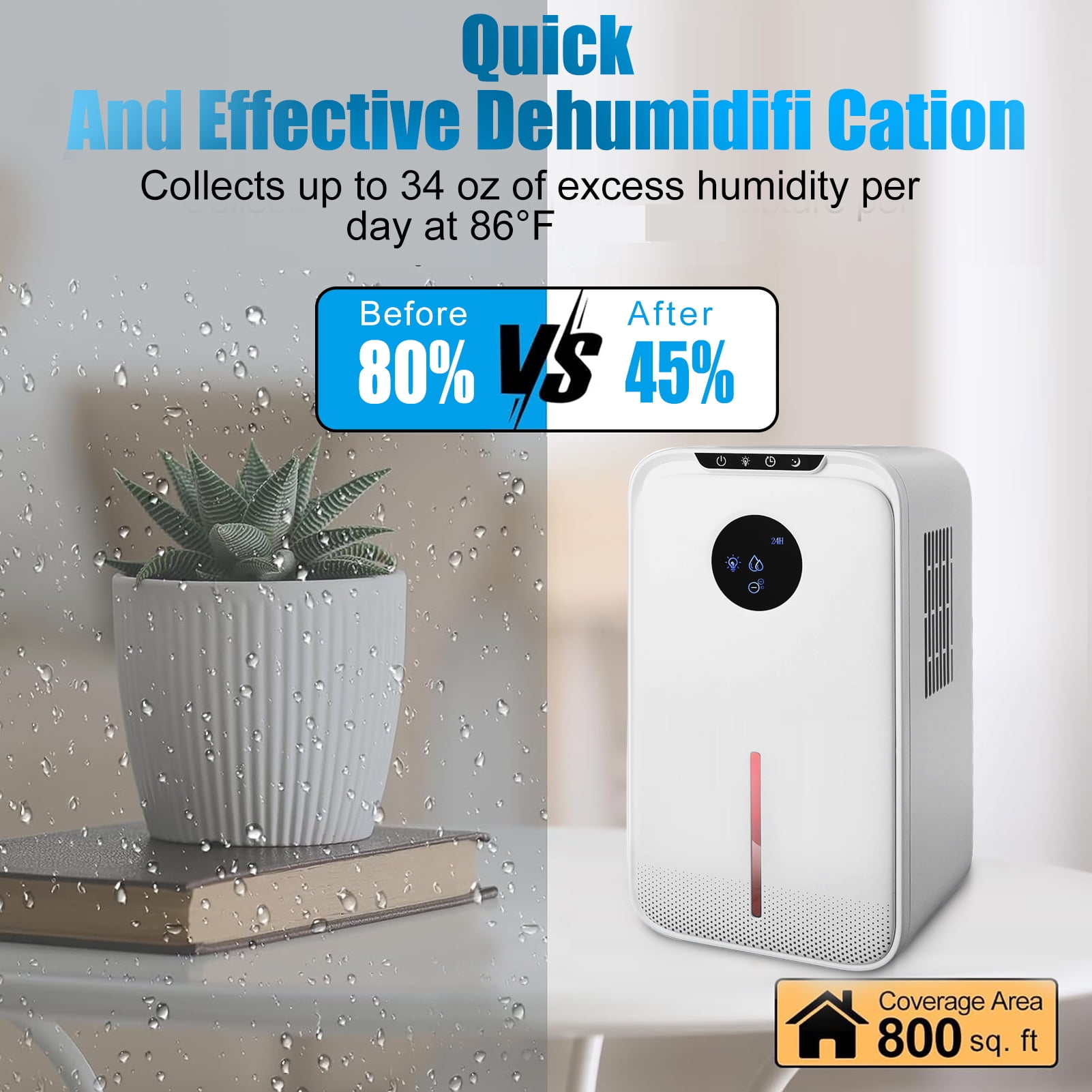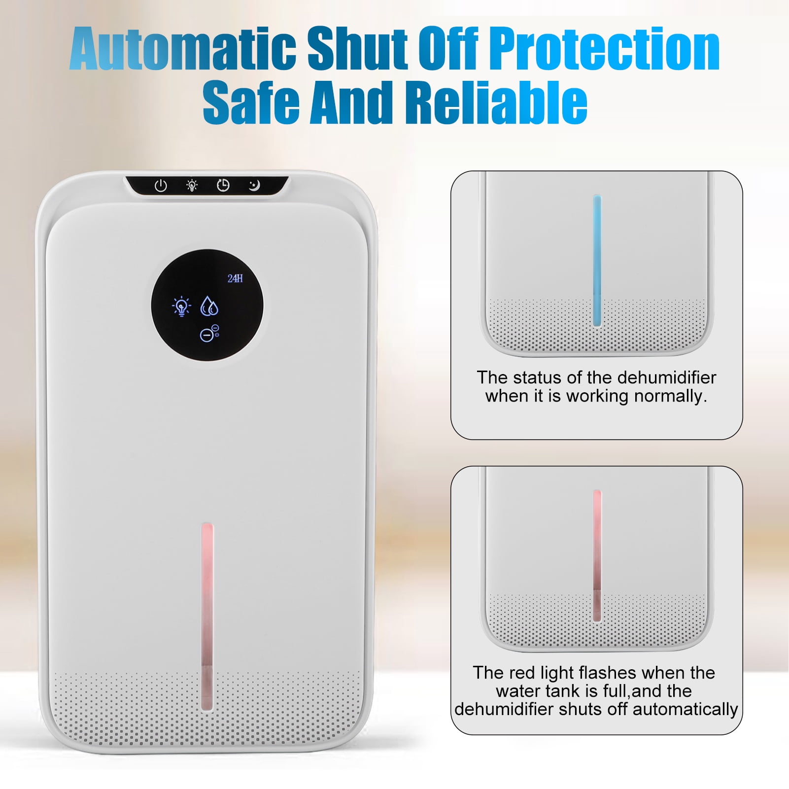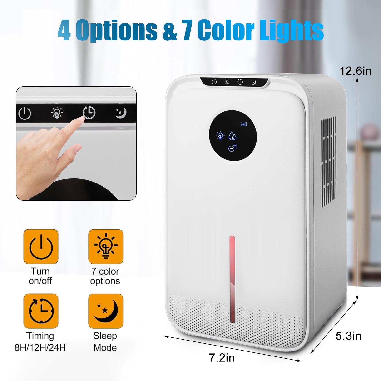 ✅Compact size 7.2 in x 5.4 in x 12.61 in, easy to move anywhere ✅ Powerful dehumidifying function, dehumidifier covers 800 Sq.Ft ✅ 35dB ultra-quiet sleep mode ✅ 8/12/24 H timer setting ✅ 7 colors LED light option ✅ Easy to operate automatic mode ✅ Energy saving and low consumption ✅ Automatic defrost at low temperature ✅ Water full automatic shutoff ✅ With drain pipe, two kinds of drainage methods can be selected